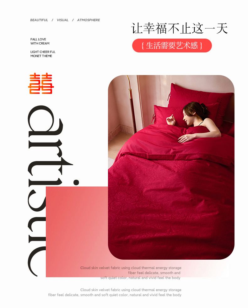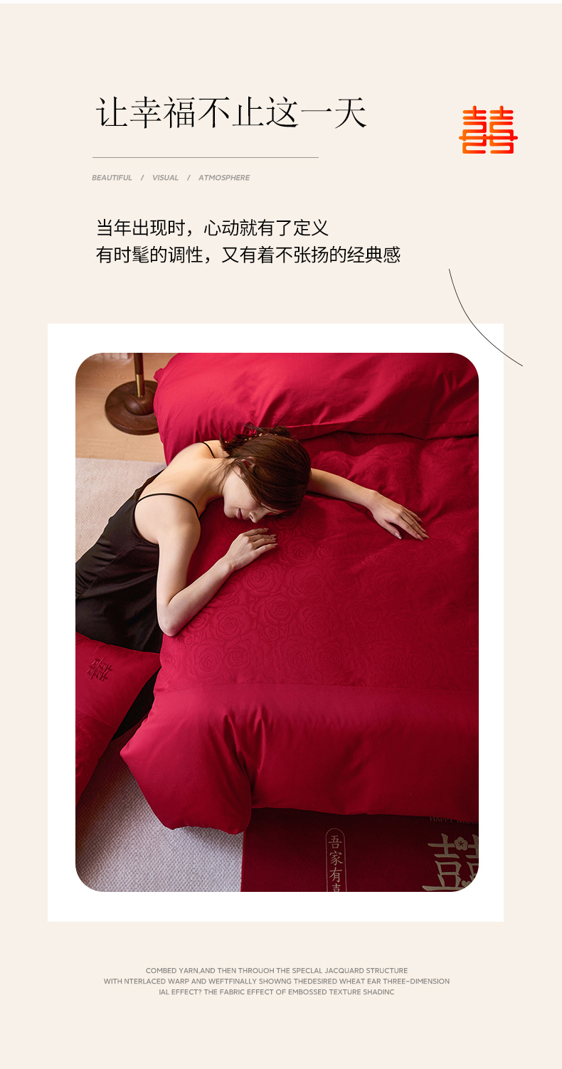 商品名称:红番天婚庆 2025新款小红书热卖款仿丝棉提花时尚婚庆系列四件套多件套 唯爱