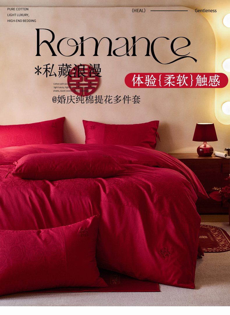 (总)红番天婚庆 2025新款小红书热卖款仿丝棉提花时尚婚庆系列四件套多件套,唯爱,禧妆
