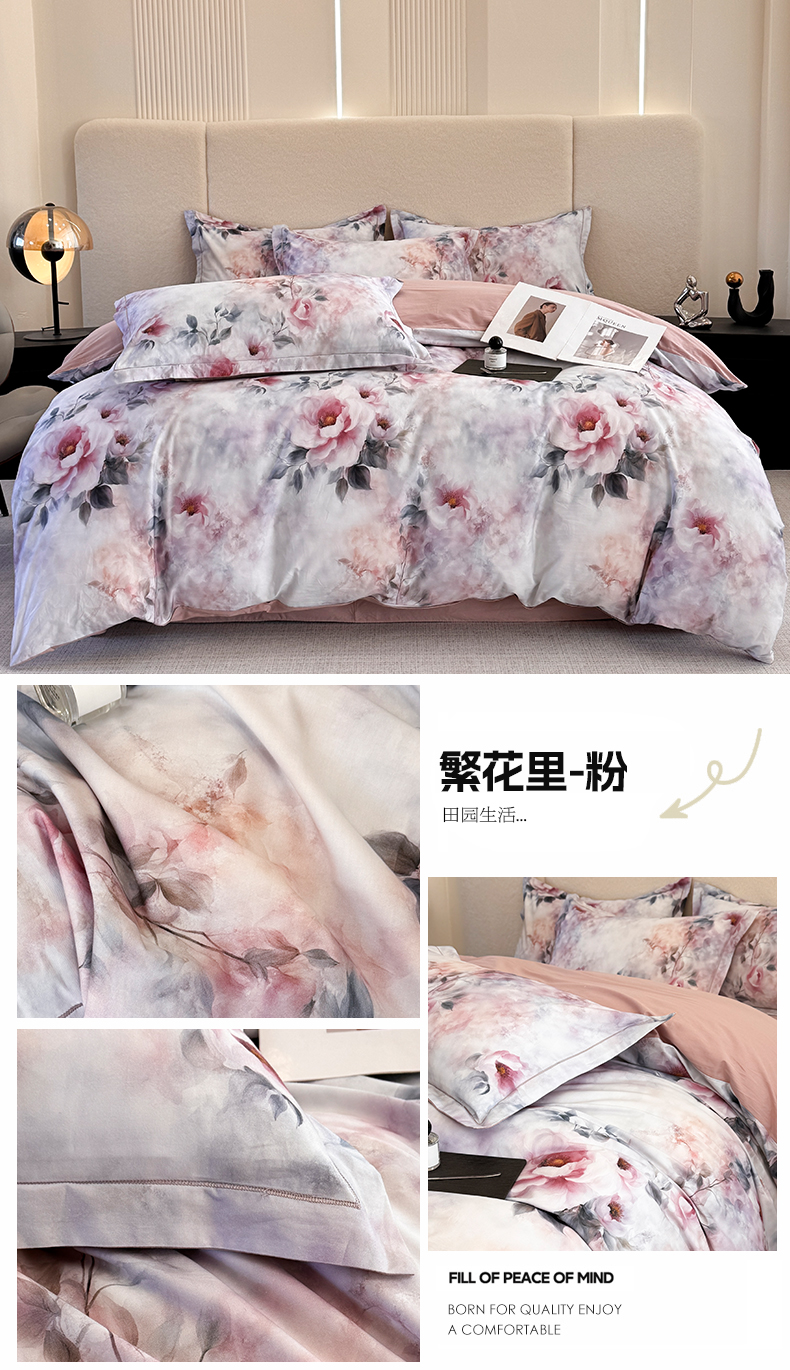 商品名称:润锦云 2026春夏新款全棉纯棉13372数码印花四件套 美尼尔-粉