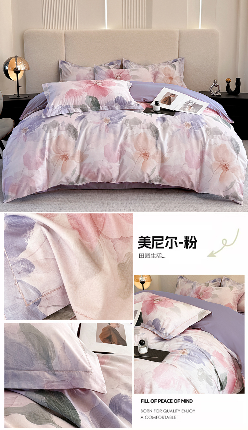 润锦云 2026春夏新款全棉纯棉13372数码印花四件套 美尼尔-粉