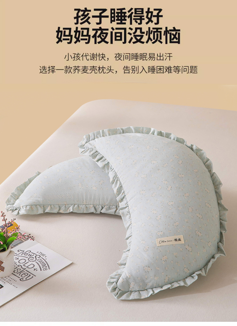 梦莱家纺 2026新款月牙形儿童棉麻荞麦枕枕头枕芯 1号月牙枕