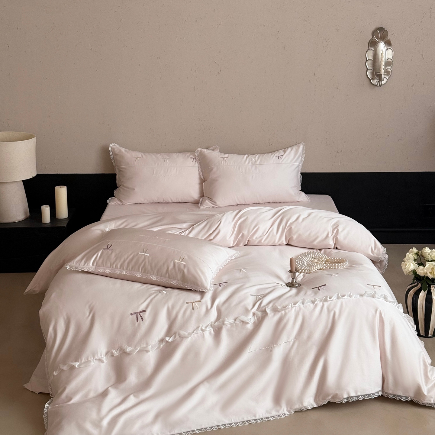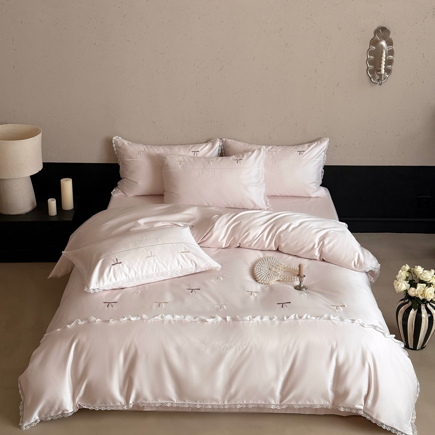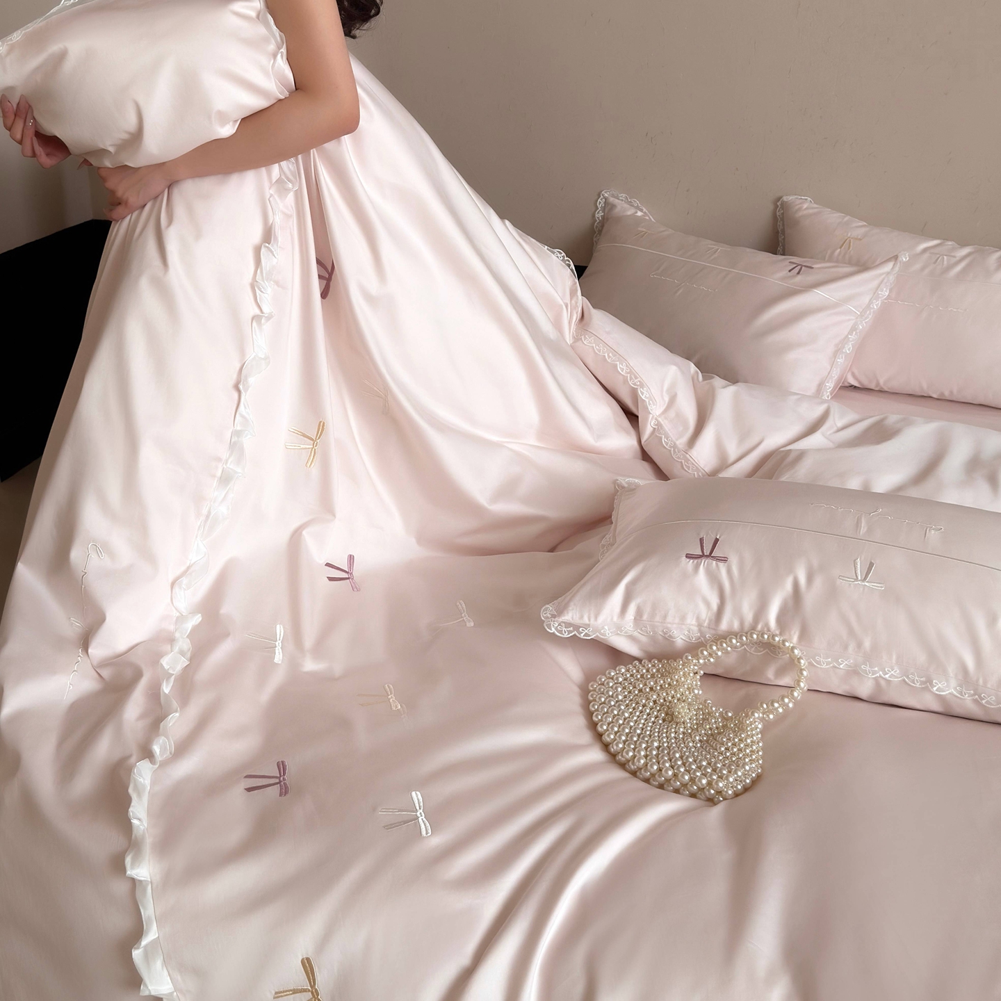佳汐蓝家纺 2026春夏新款全棉纯棉刺绣四件套-半糖主义 半糖主义-白拼粉