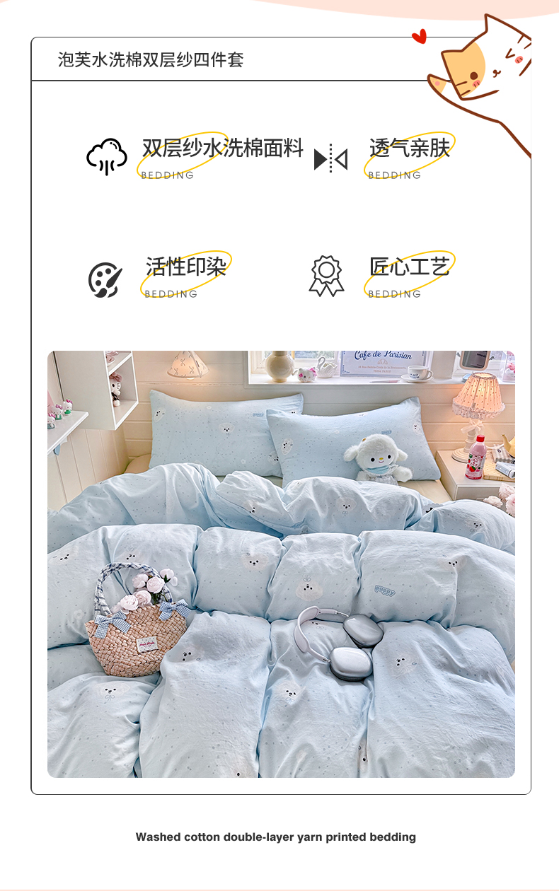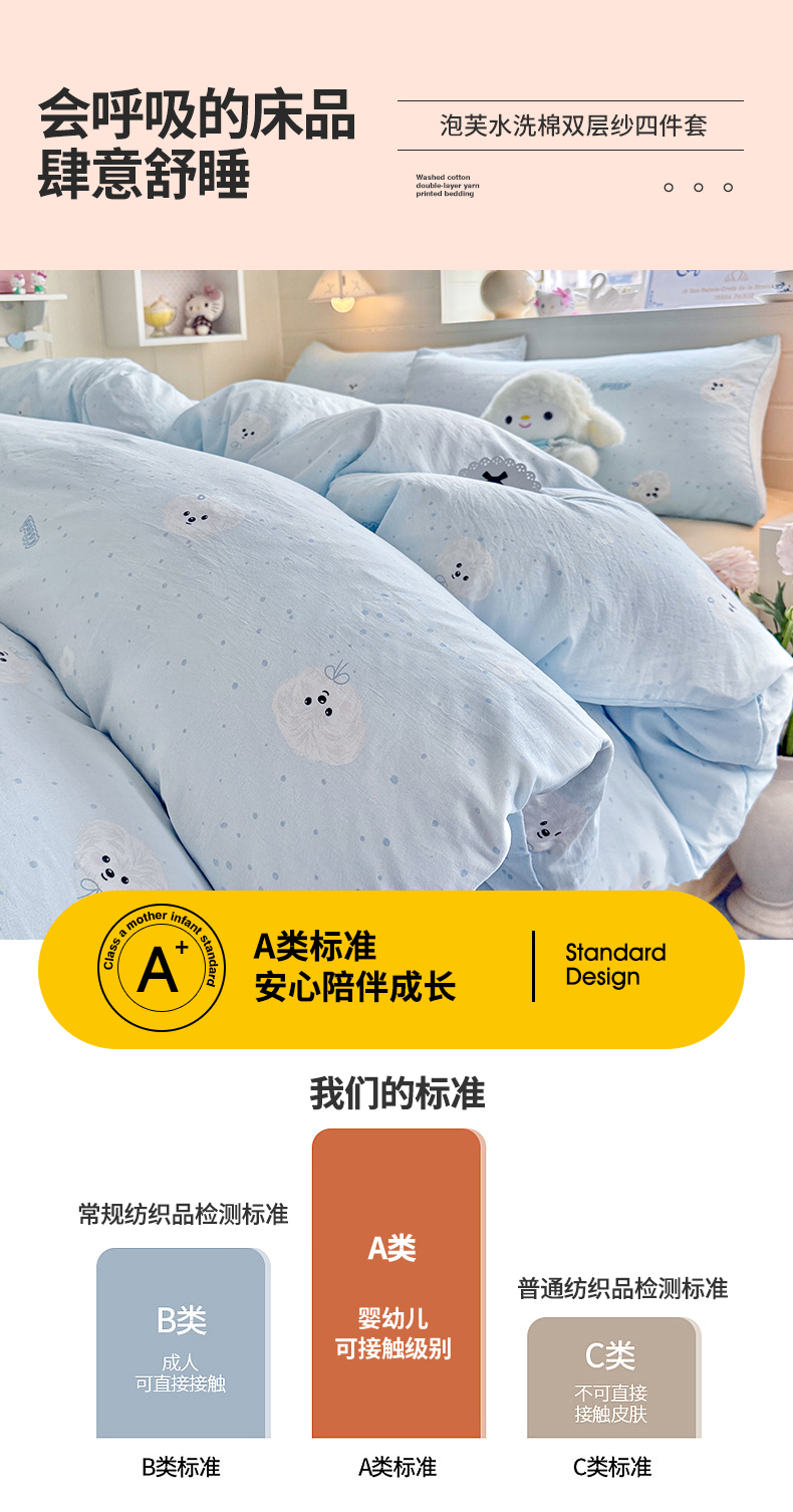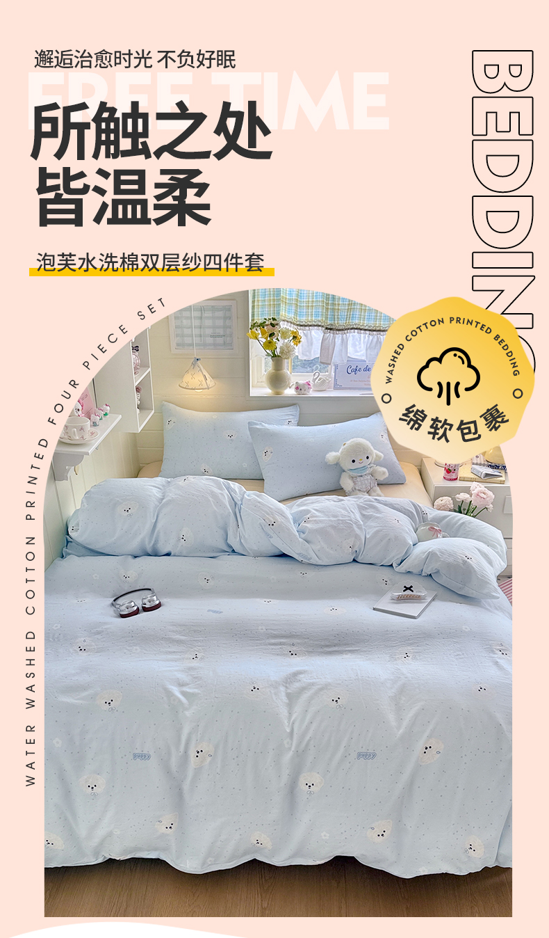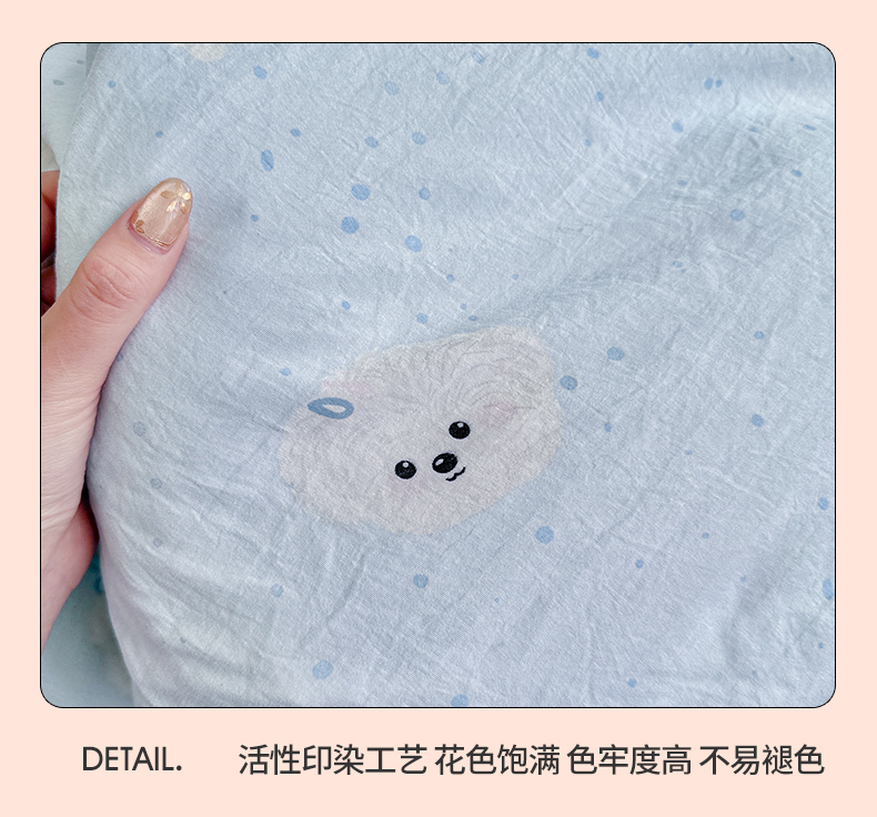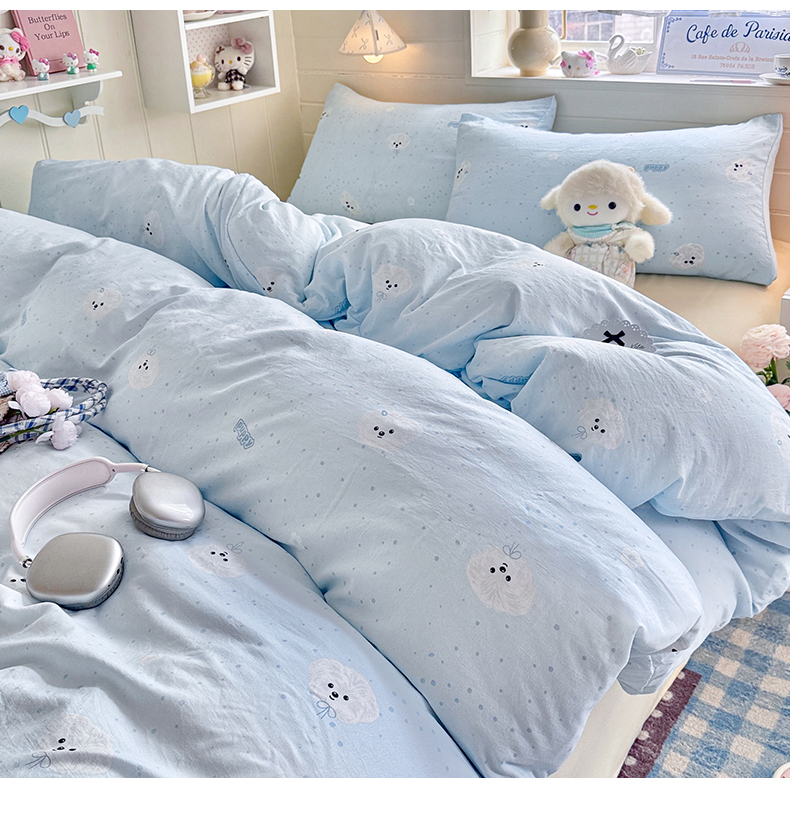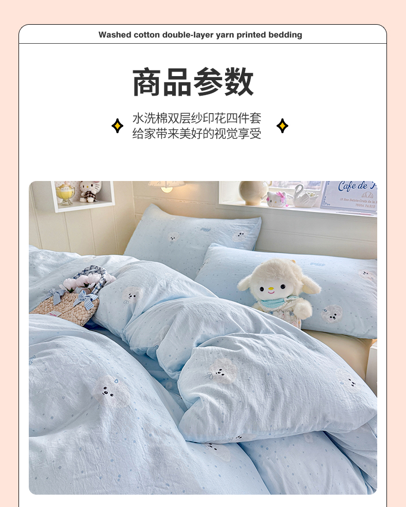 当前位置: 91家纺网 > 商品网购 > 床品套件 > 四件套 > 其它四件套 > 罗亿家纺 2026年新款泡芙水洗棉双层纱四件套 波点小狗