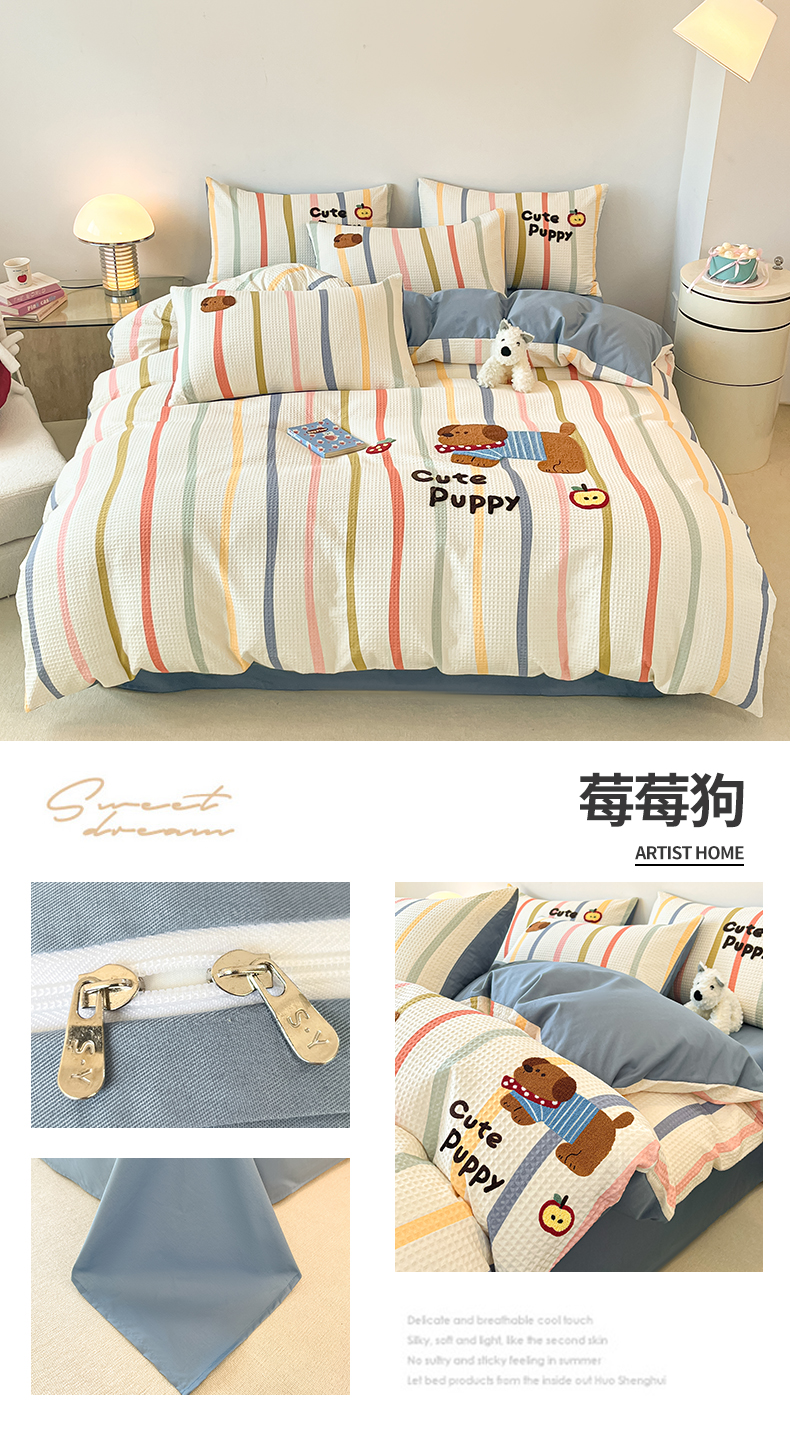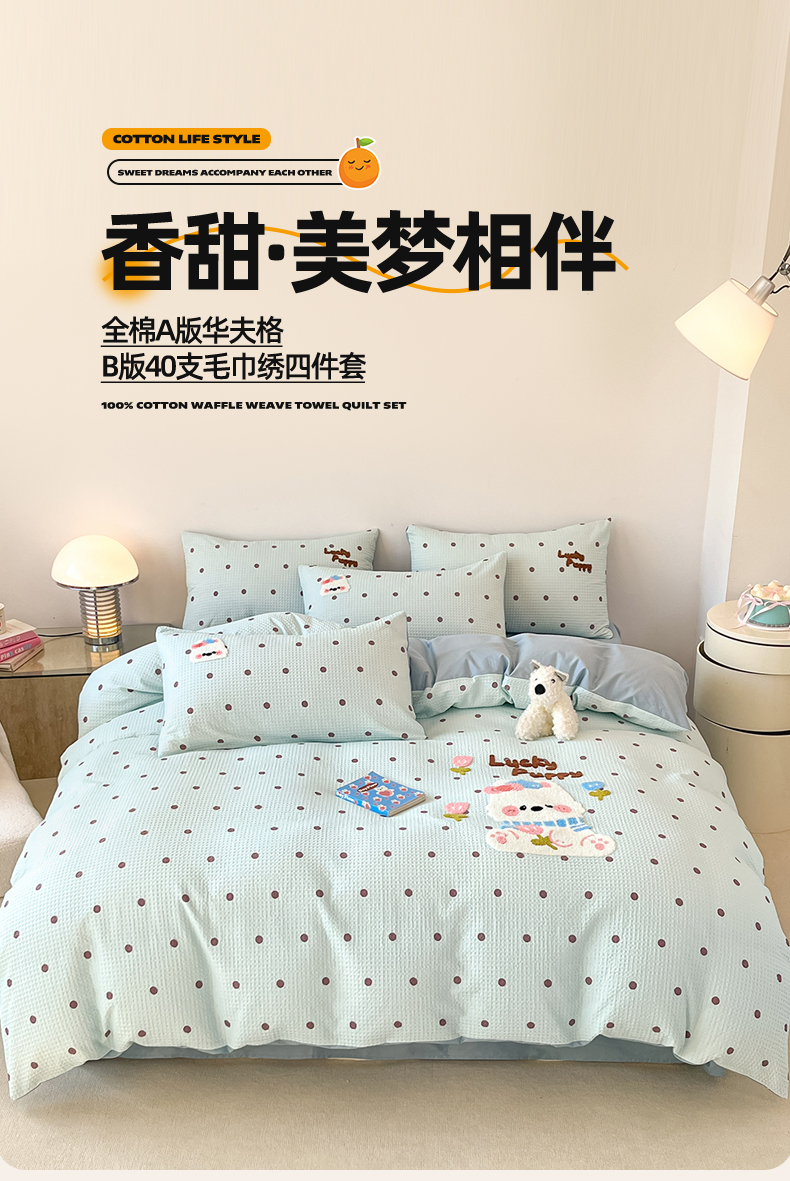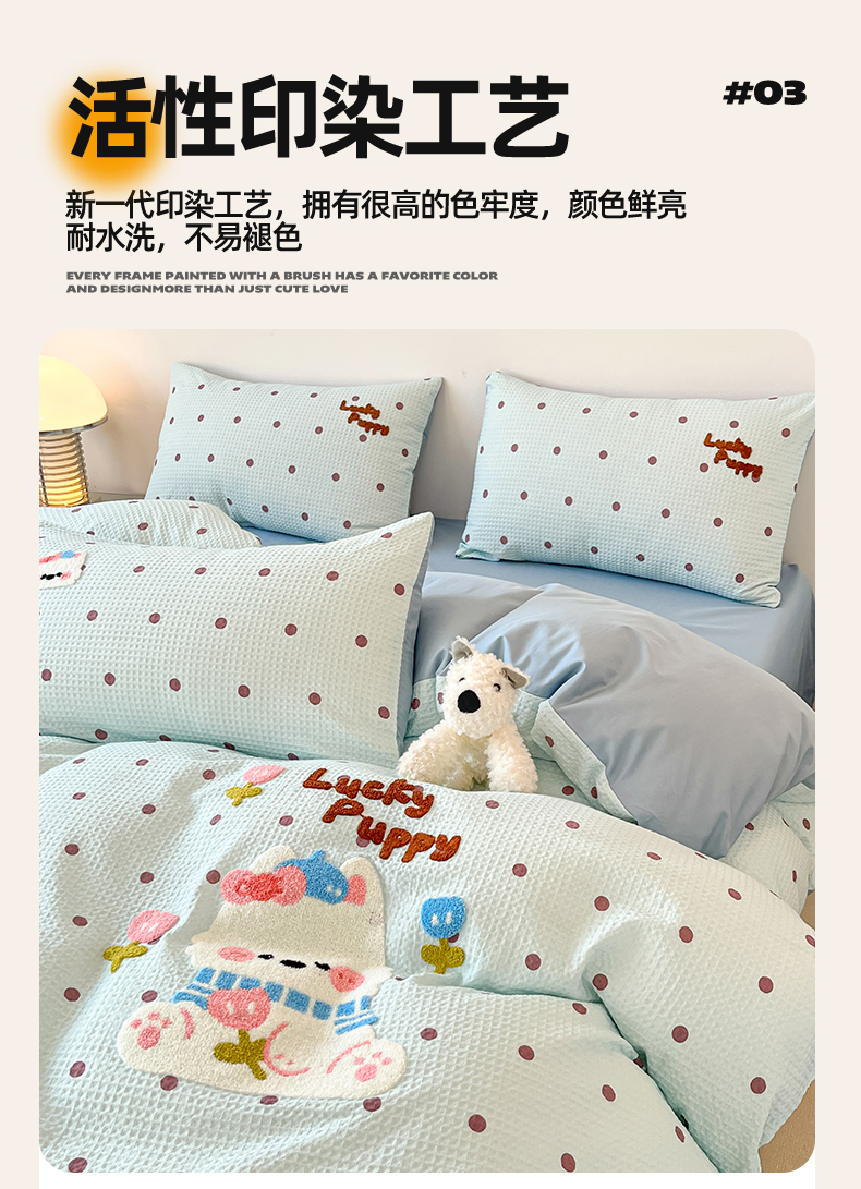 当前位置: 91家纺网 > 商品网购 > 床品套件 > 四件套 > 全棉普通四件套 > 眷恋家纺 2026新款全棉纯棉A版华夫格B版40支毛巾绣四件套 欢乐狗