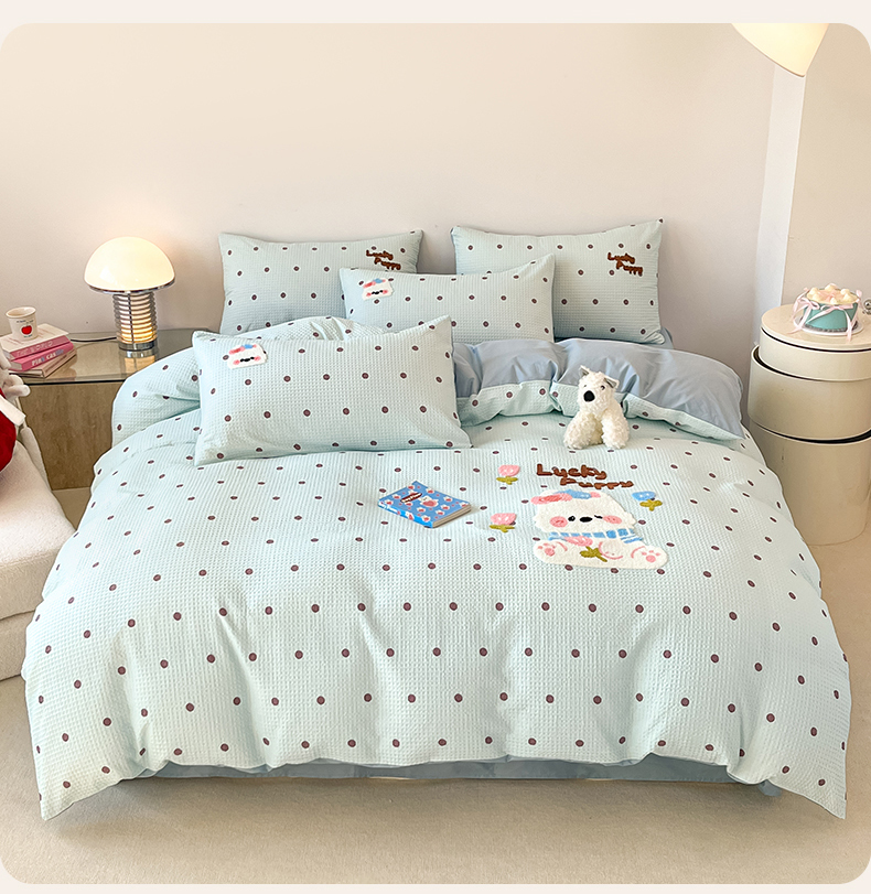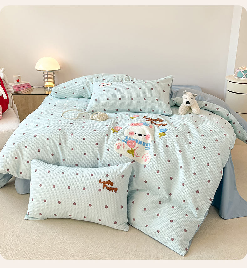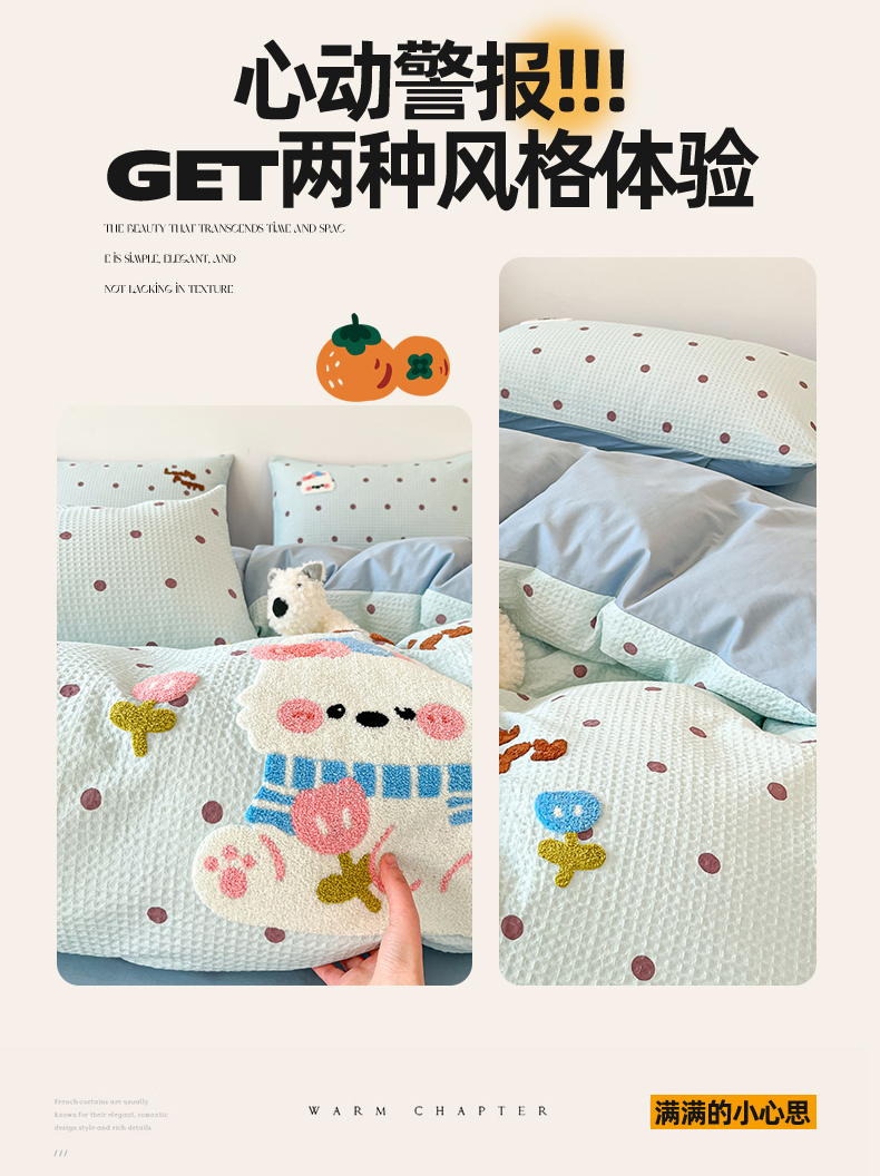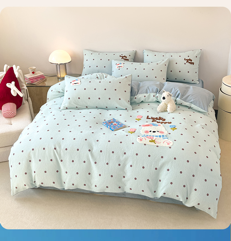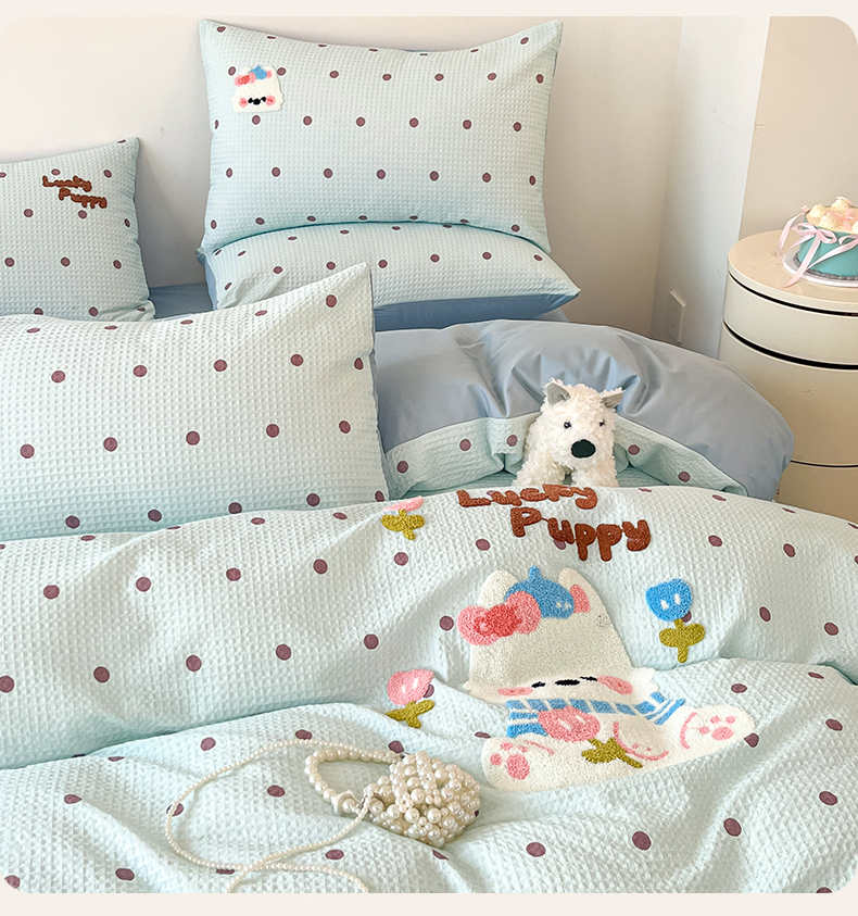 当前位置: 91家纺网 > 商品网购 > 床品套件 > 四件套 > 全棉普通四件套 > 眷恋家纺 2026新款全棉纯棉A版华夫格B版40支毛巾绣四件套 欢乐狗
