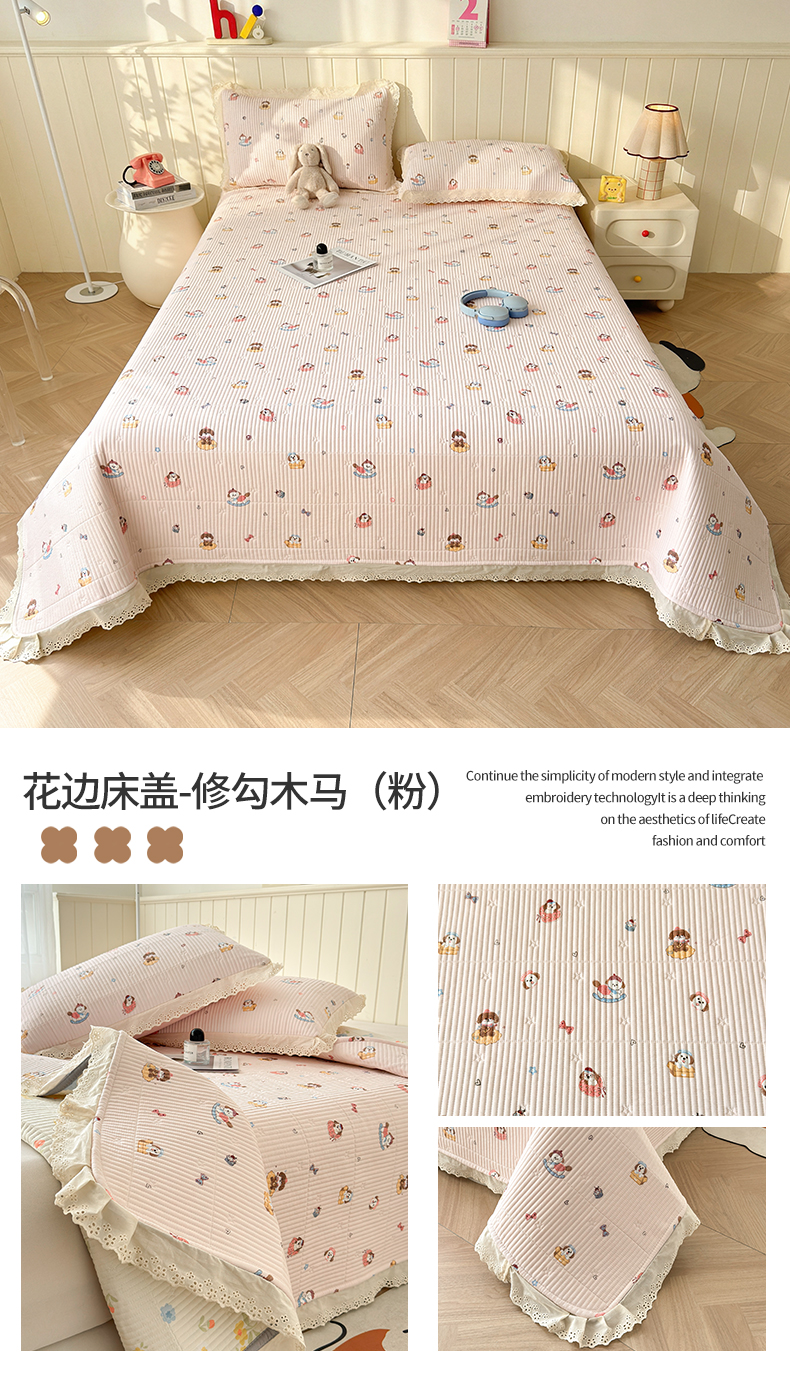 (总)雯豆家纺 2026春夏新款A类凉感花边床盖夏被夏凉被空调被四件套,彩色小熊,蛋糕小熊,蝶甜小筑,多彩蝴蝶,嗨皮熊,木马王子,暖汪汪,兔子公主,雾杏枝影,熊趣小窝,修勾木马(粉),修勾木马(蓝)