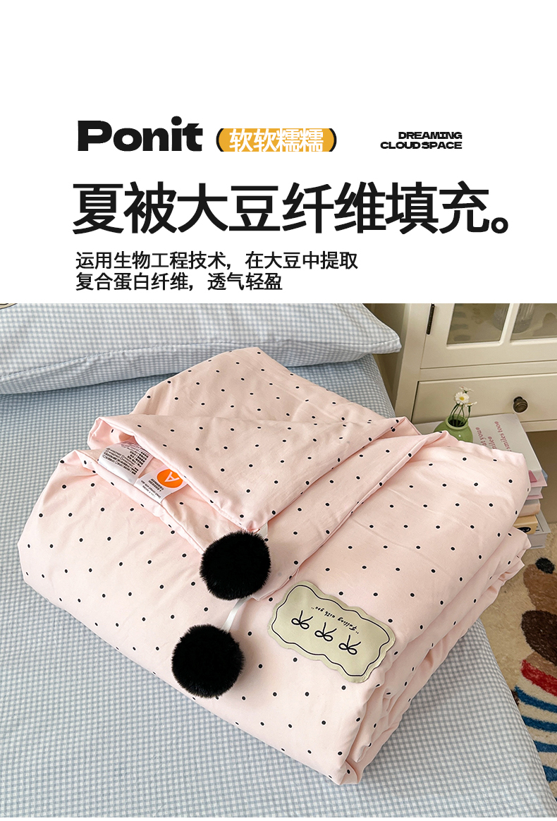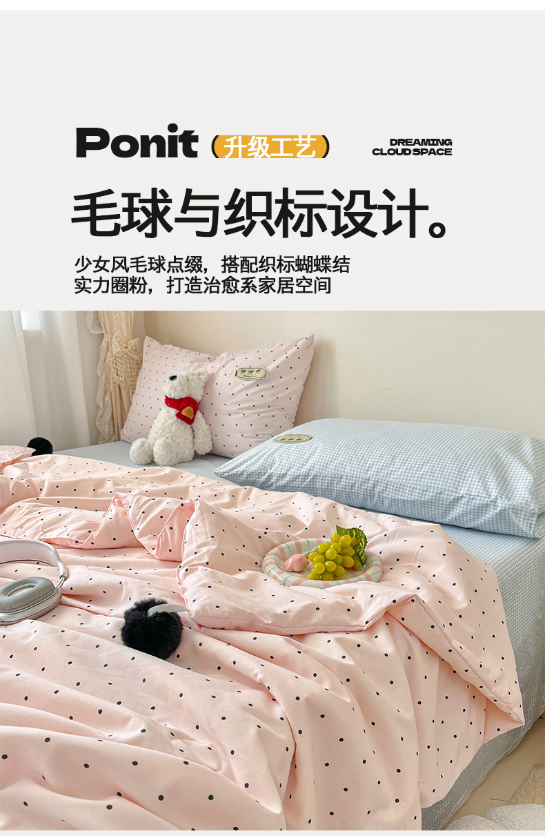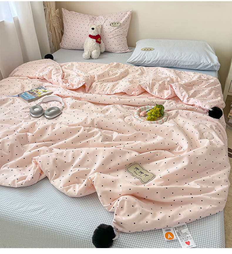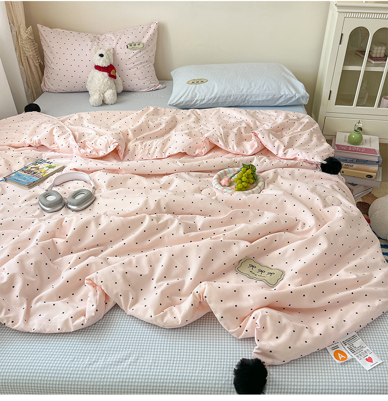 当前位置: 91家纺网 > 商品网购 > 床品套件 > 四件套 > 夏被四件套 > 桃心家居 2026新款A类ins云柔水洗棉织标蝴蝶结毛球少女大豆单夏被夏被四件套系列 水洗棉毛球-夏被奶昔粉蓝