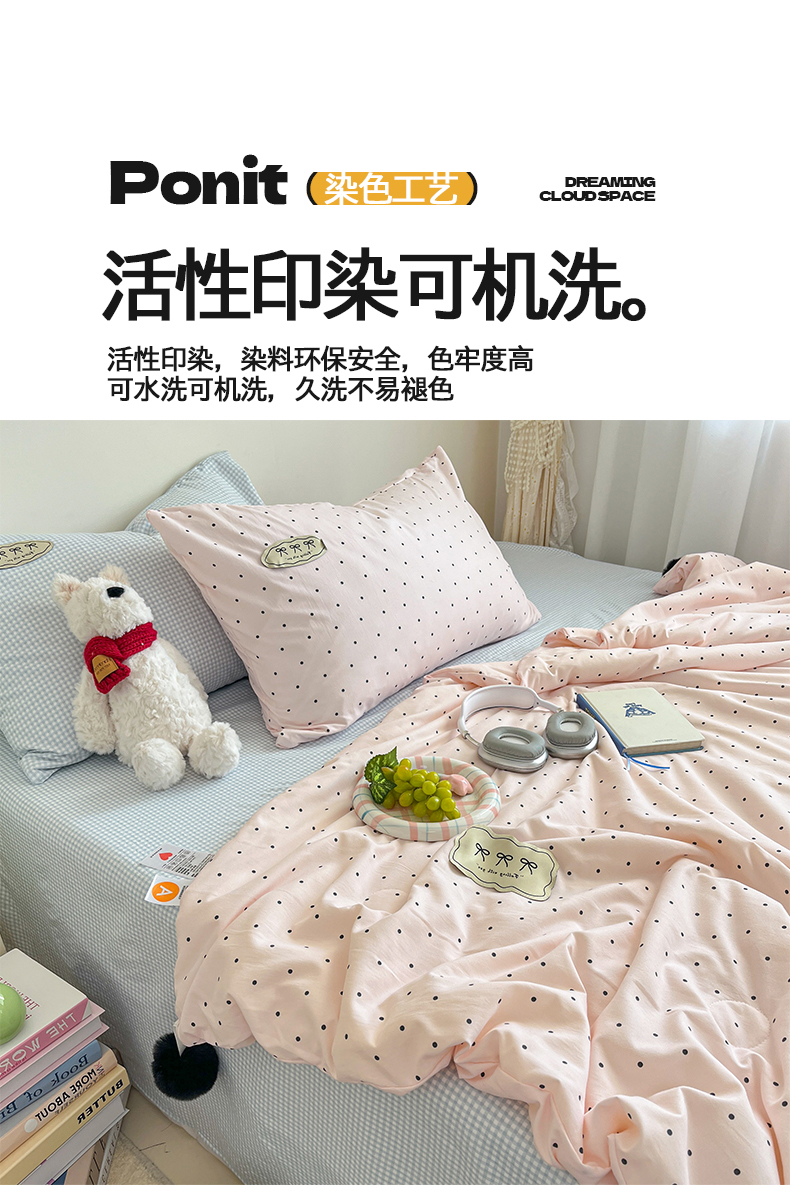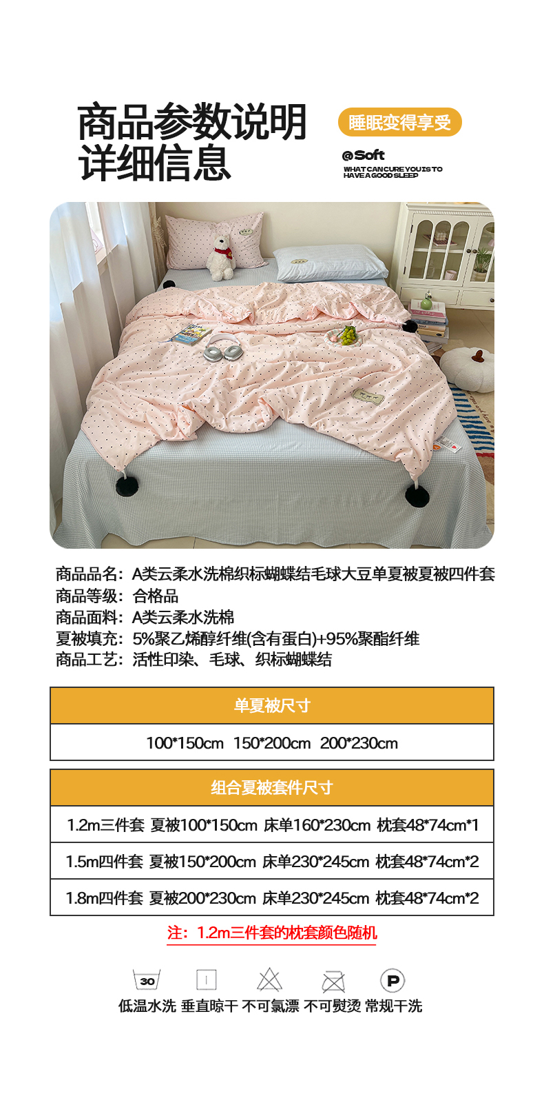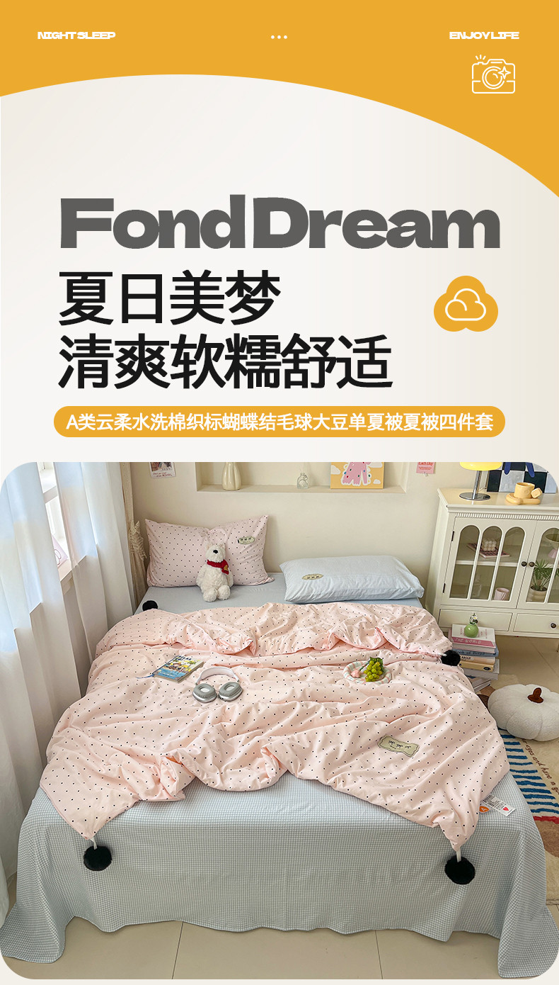 当前位置: 91家纺网 > 商品网购 > 床品套件 > 四件套 > 夏被四件套 > 桃心家居 2026新款A类ins云柔水洗棉织标蝴蝶结毛球少女大豆单夏被夏被四件套系列 水洗棉毛球-夏被奶昔粉蓝