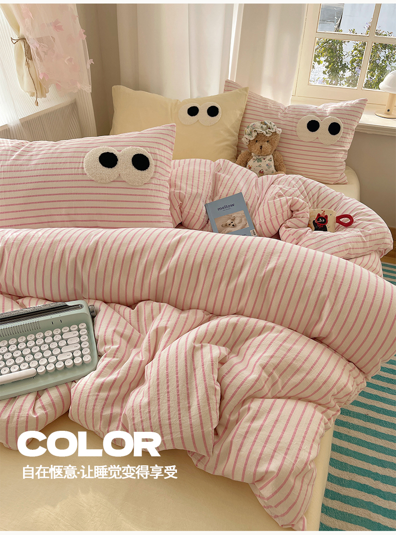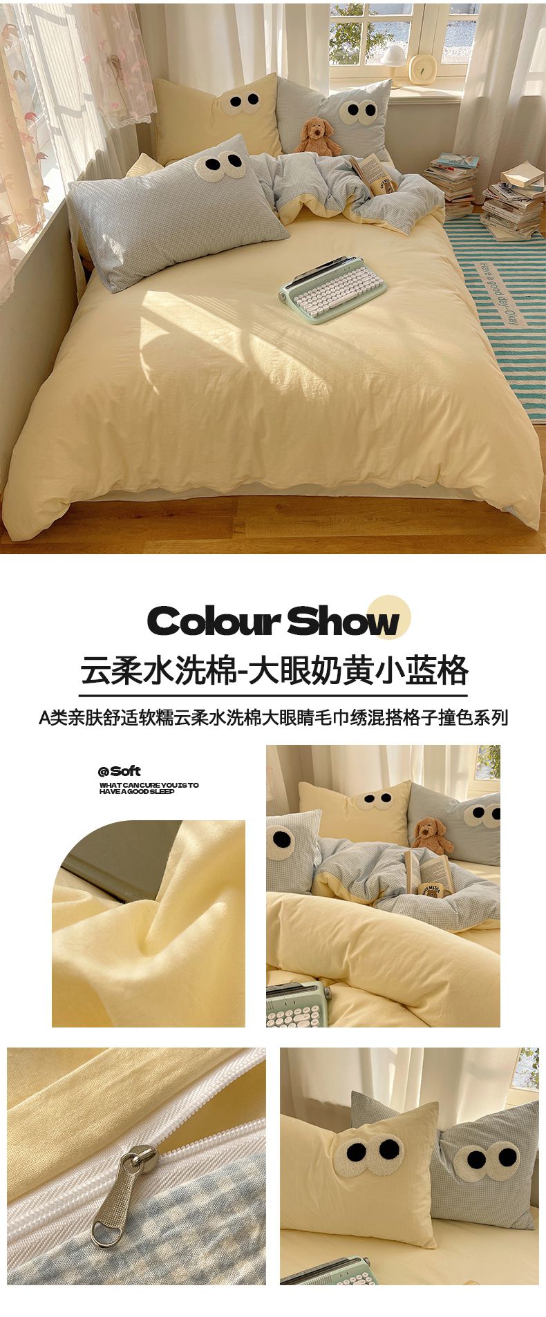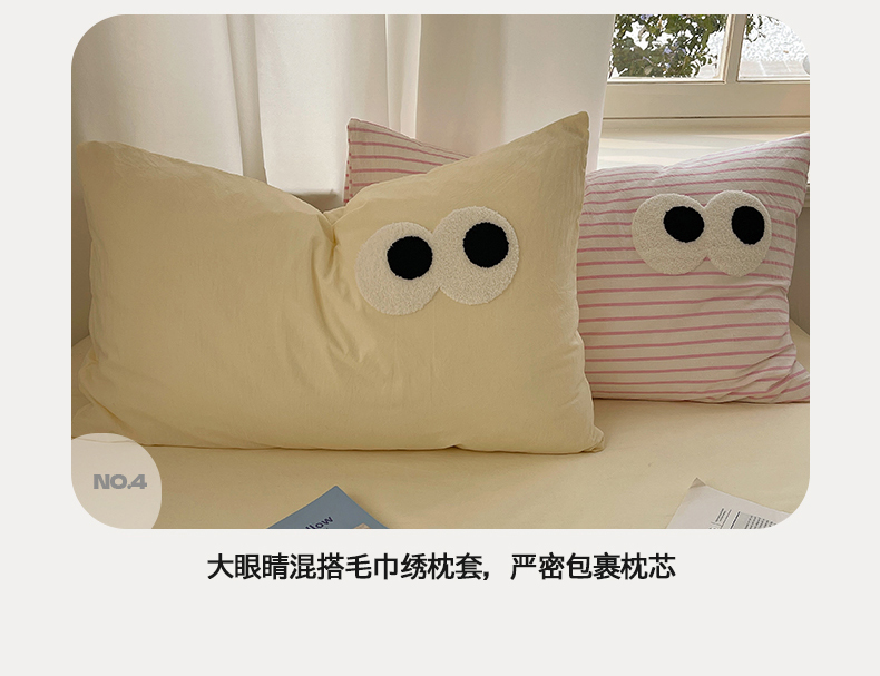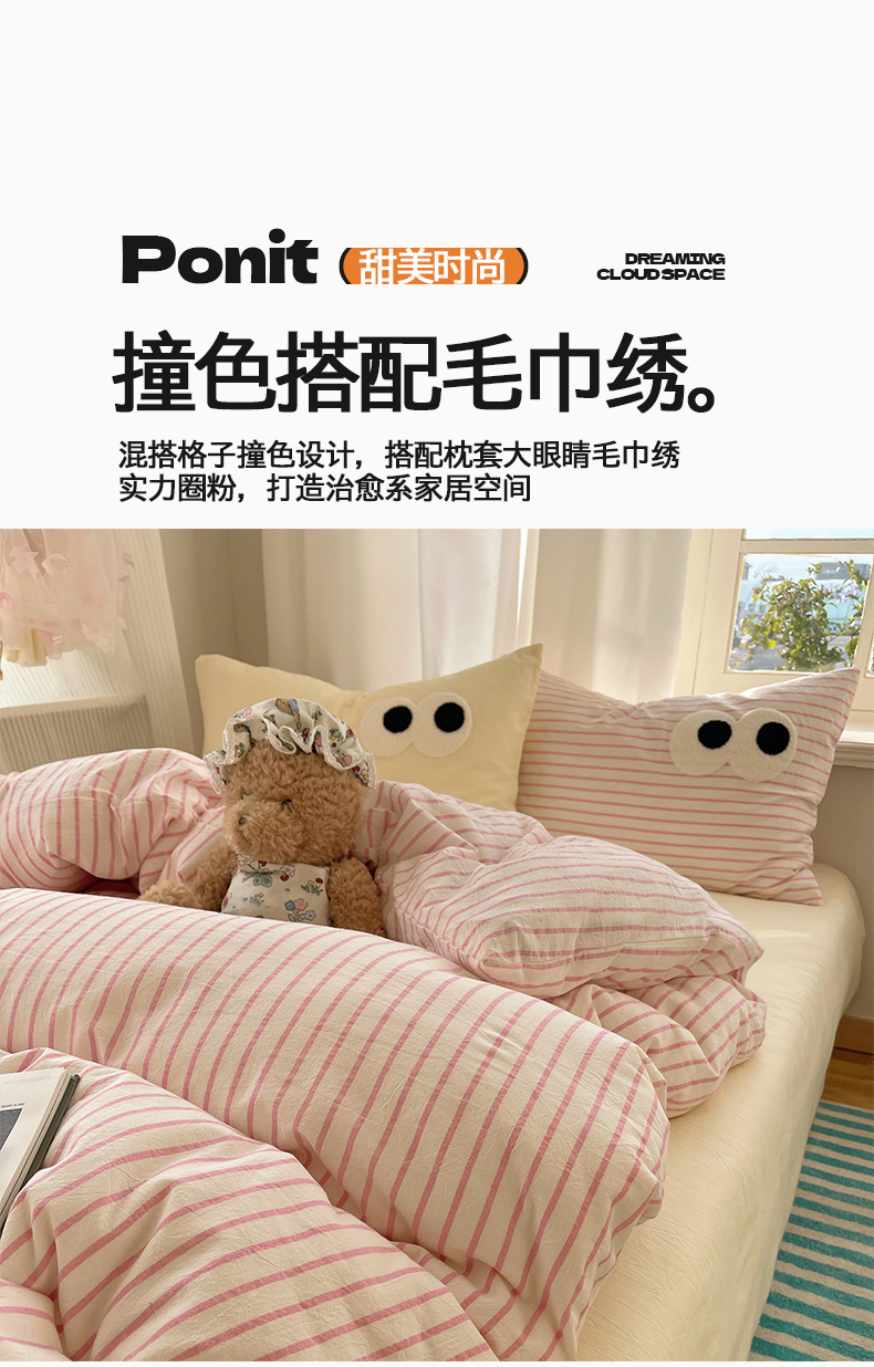 当前位置: 91家纺网 > 商品网购 > 床品套件 > 四件套 > 毛巾绣四件套 > 桃心家居 2026新款A类亲肤舒适软糯云柔水洗棉大眼睛毛巾绣混搭格子撞色系列四件套 云柔水洗棉-大眼粉粉条奶黄