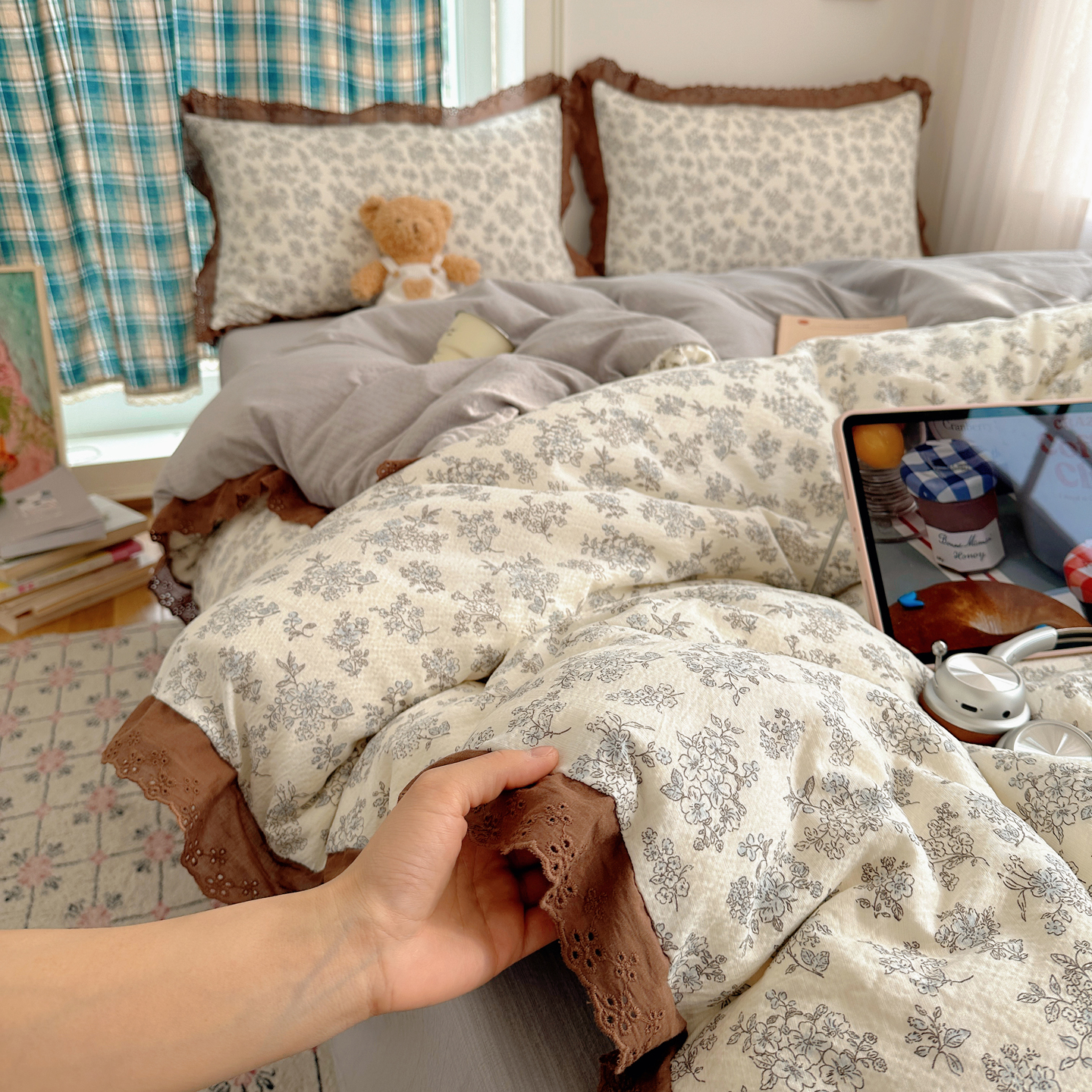 (总)一比一家纺 2026新款彩色花边木棉皱皱纱四件套,阿吉豆,初心粉,初心蓝,扶摇,赫本,花间女孩,花漫漫,花蜜,阑珊,罗卡,奶芙喵,甜心格格,午后花园,小马驹,邂逅,野餐兔,樱花季,悠然,紫烟