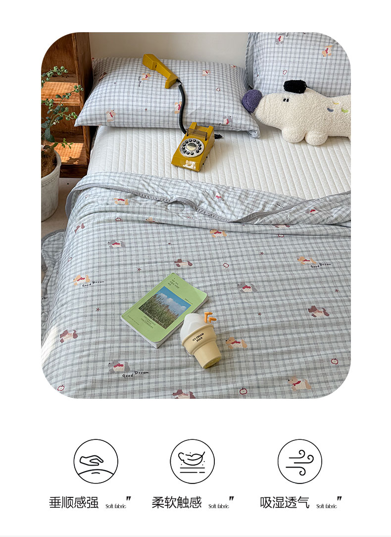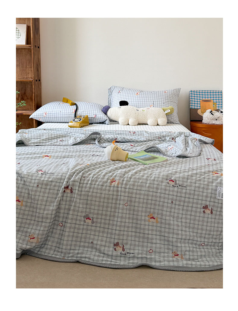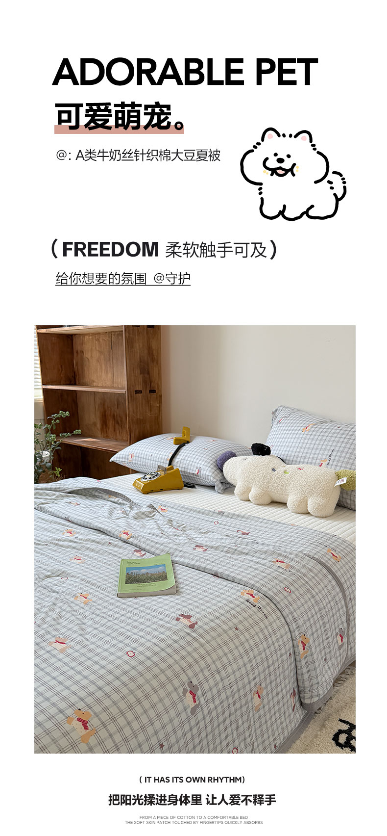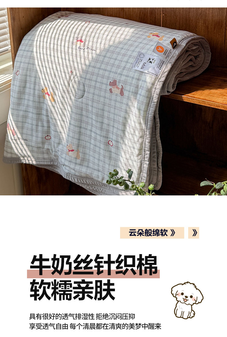 商品名称:桃子家居 2026新款A类卡通小清新印花高品质牛奶丝软糯针织棉包边夏被系列 针织棉-奶蓝小狗