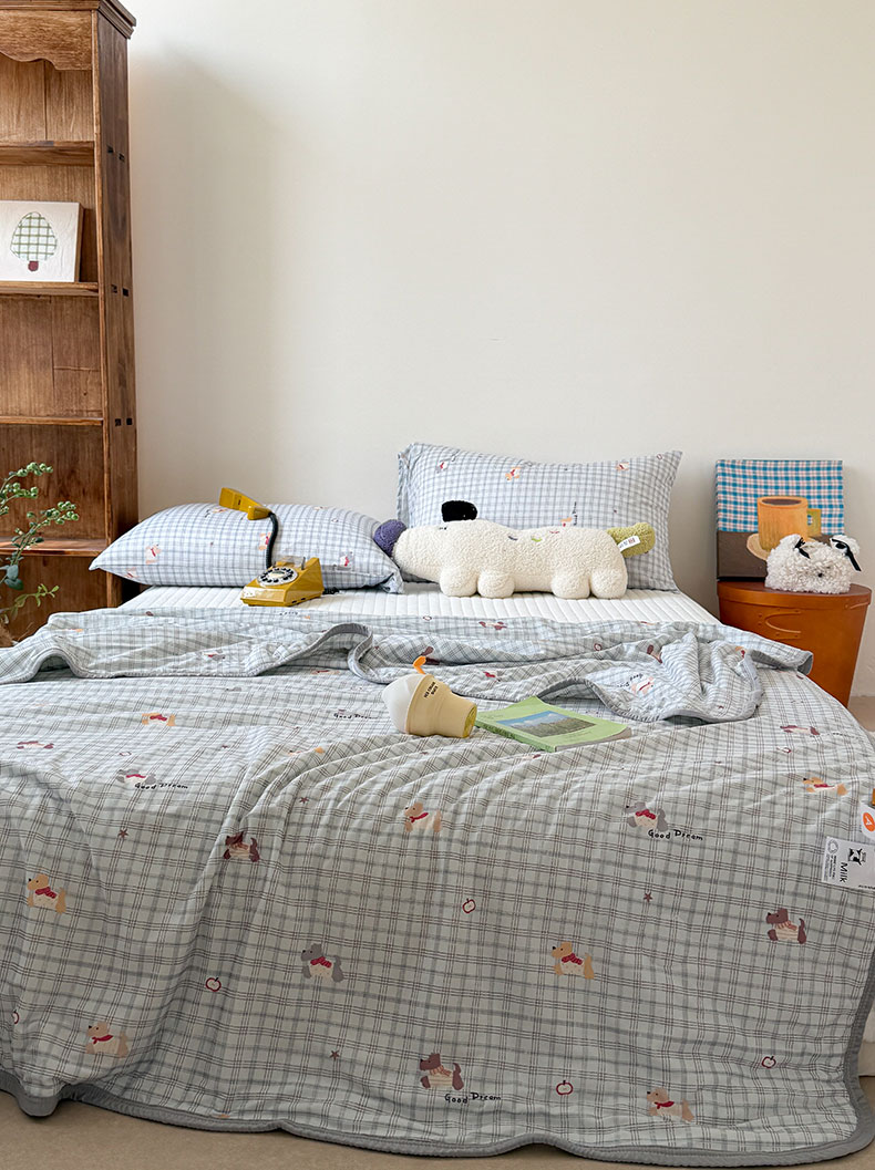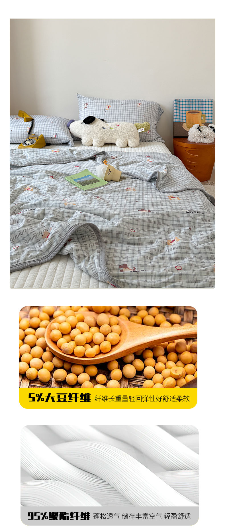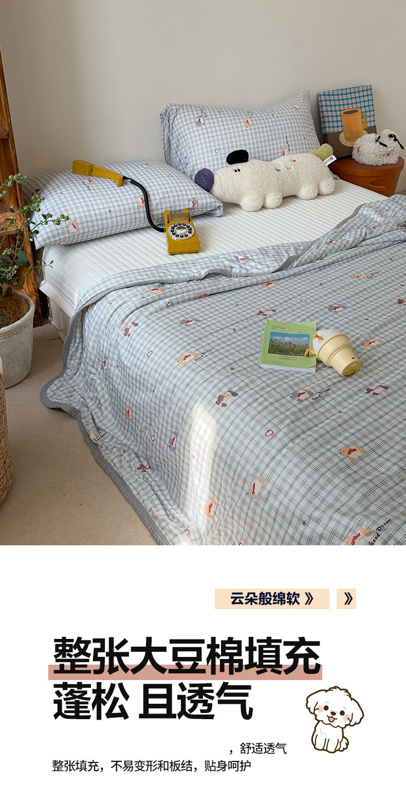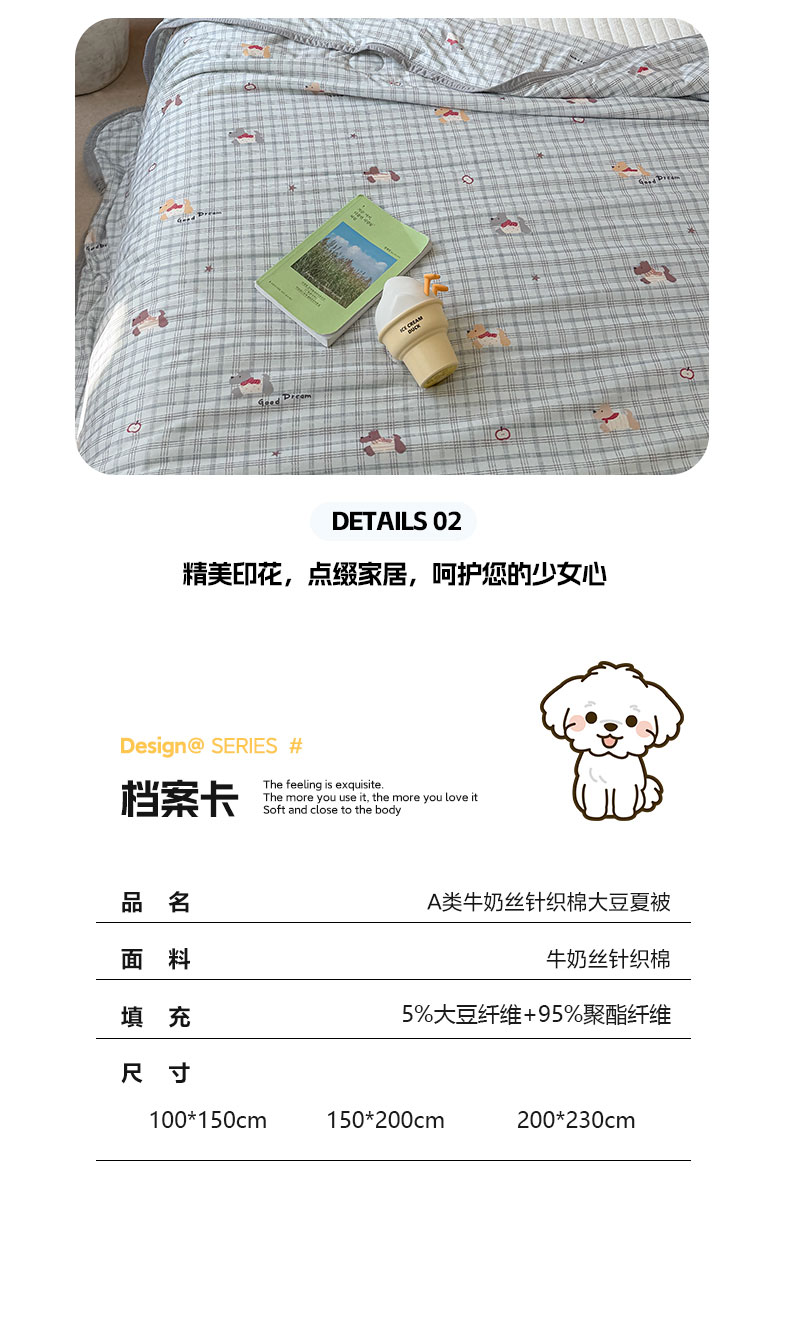 商品名称:桃子家居 2026新款A类卡通小清新印花高品质牛奶丝软糯针织棉包边夏被系列 针织棉-奶蓝小狗