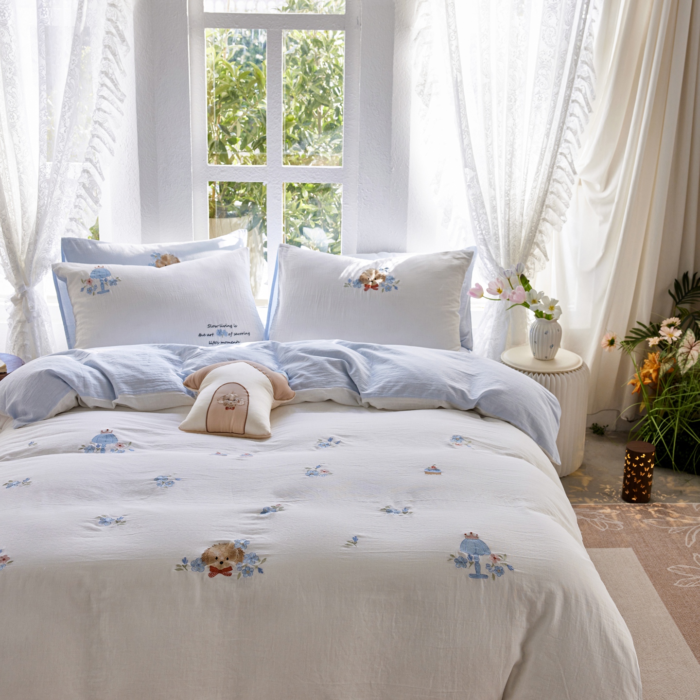 当前位置: 91家纺网 > 商品网购 > 床品套件 > 四件套 > 全棉普通四件套 > 风向标家纺 2026新款全棉纯棉素色绣花双层纱四件套 蛋糕贵宾