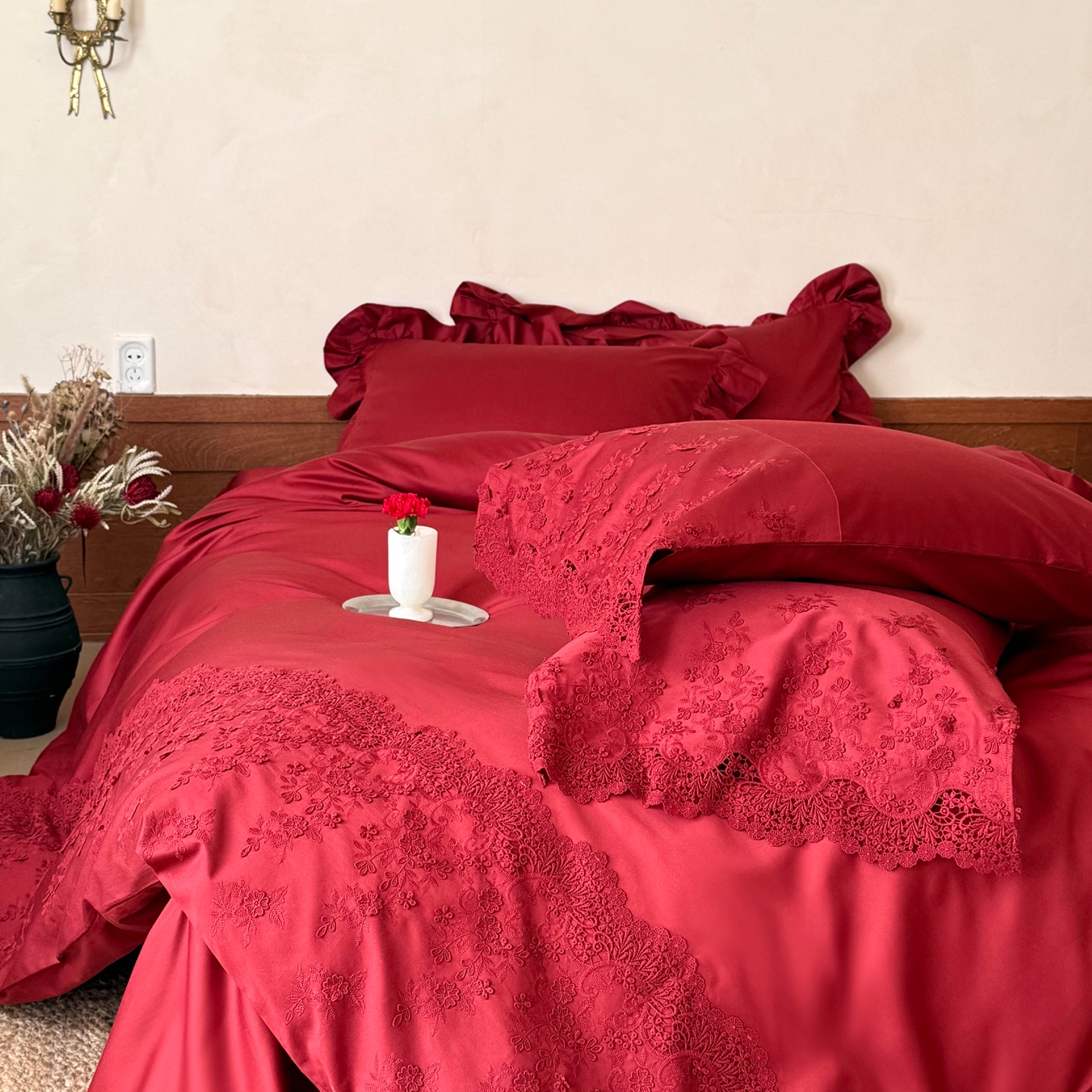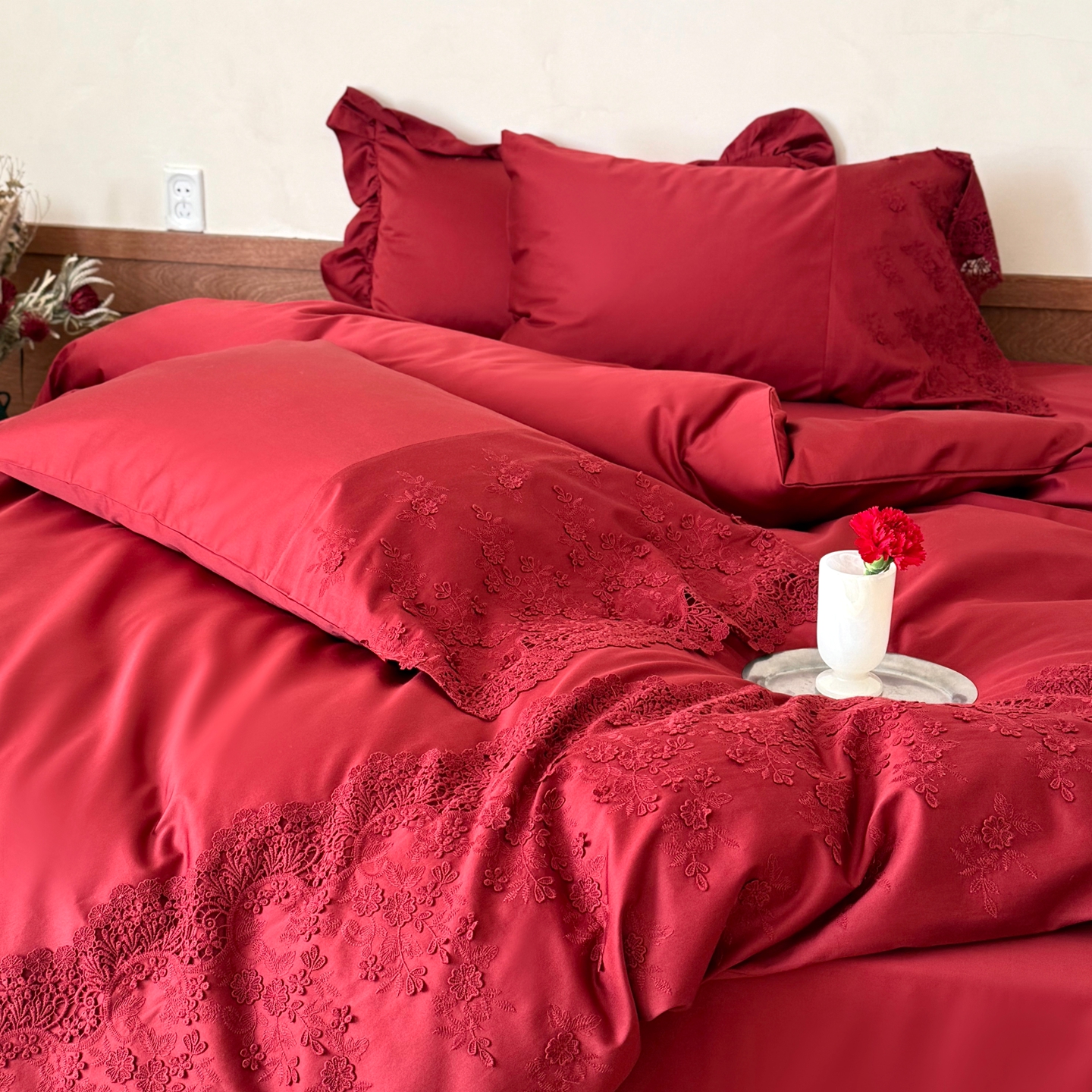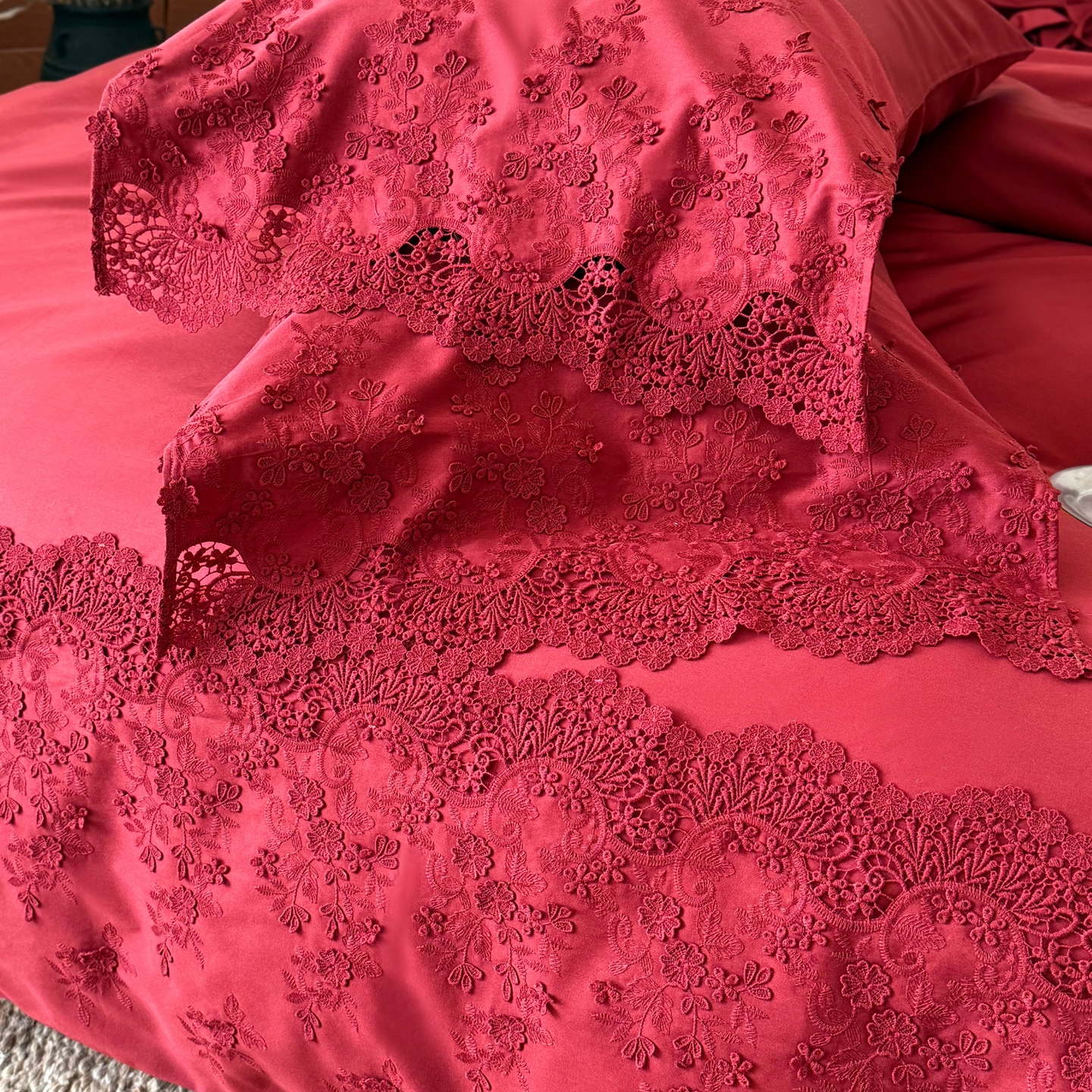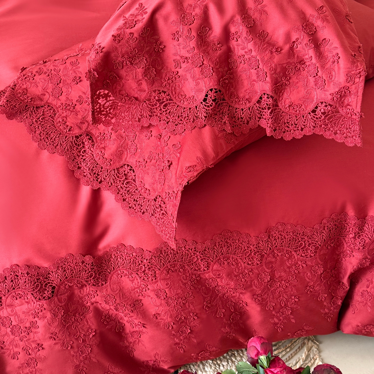 商品名称:佳汐蓝家纺 2025新款100支澳棉花边四件套-花拾光 花拾光-红色