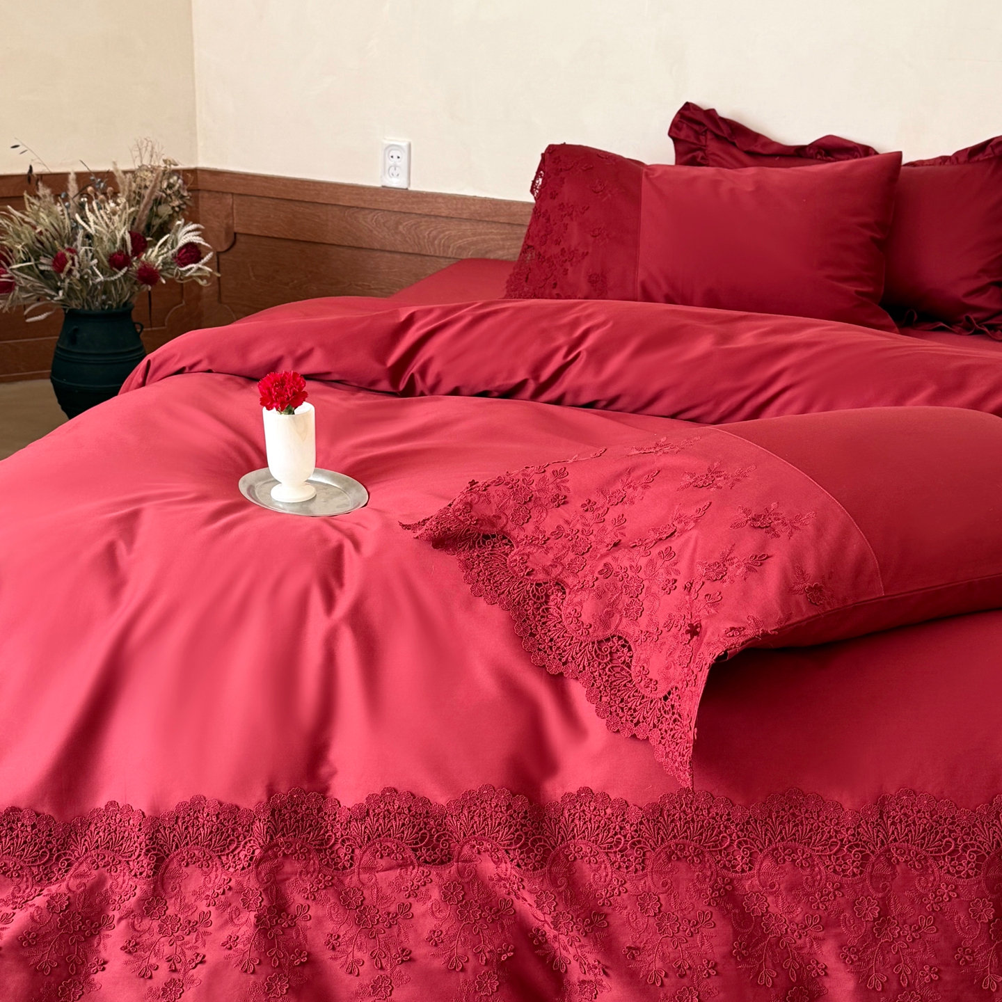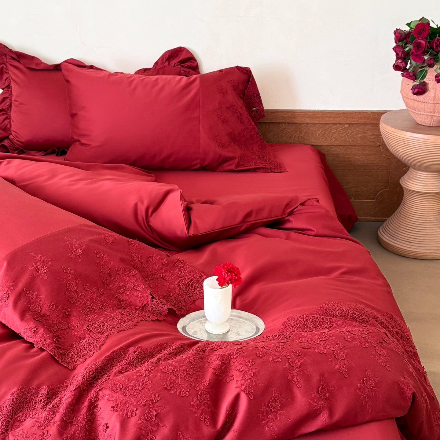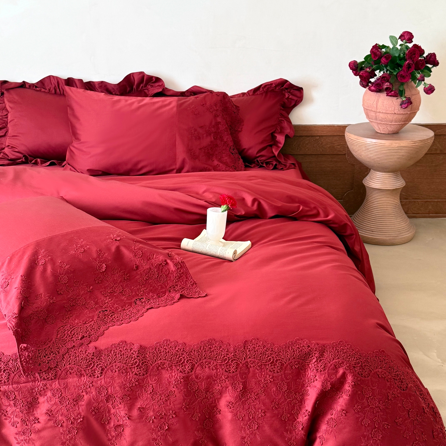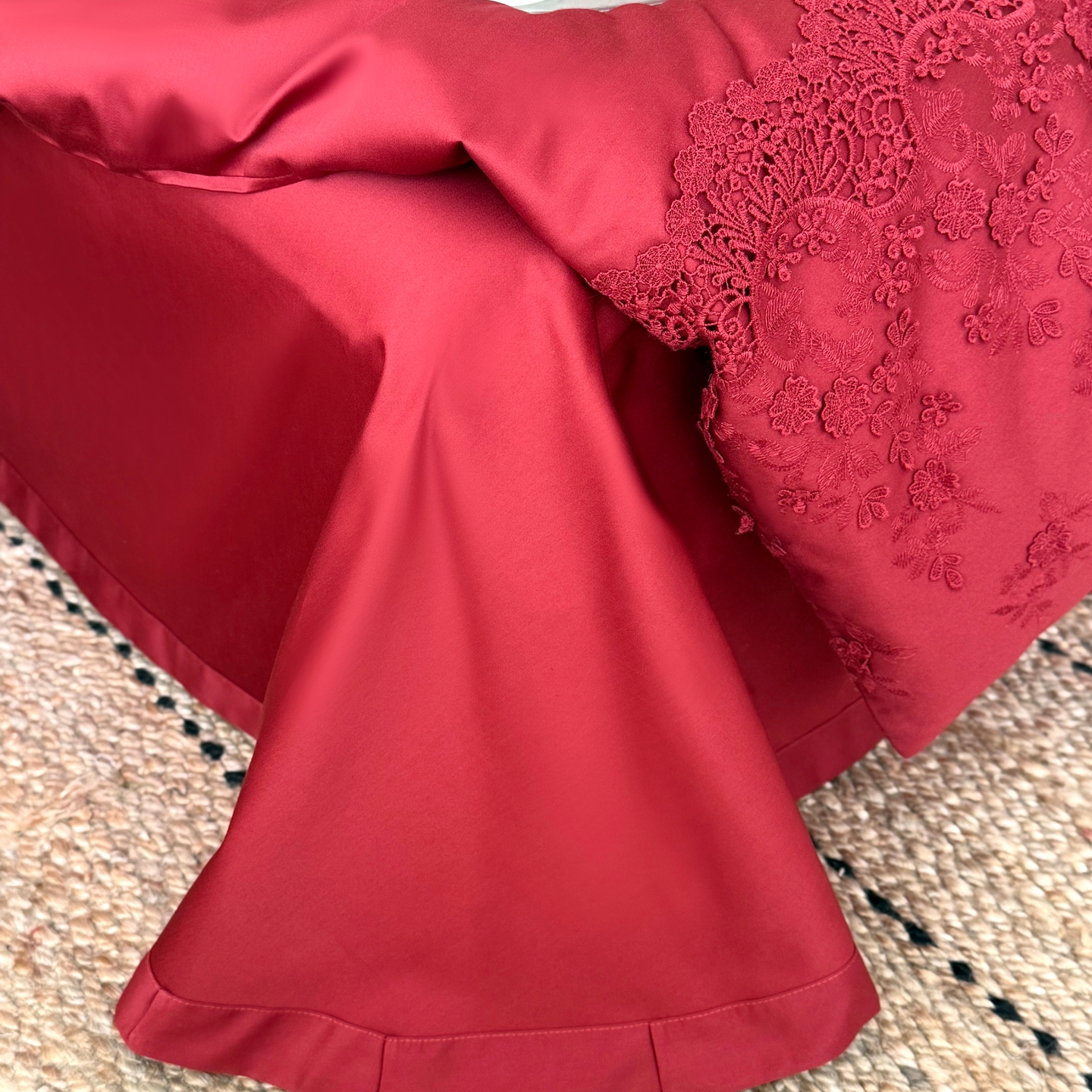 商品名称:佳汐蓝家纺 2025新款100支澳棉花边四件套-花拾光 花拾光-红色