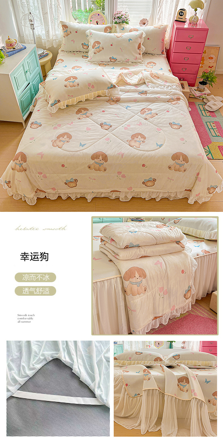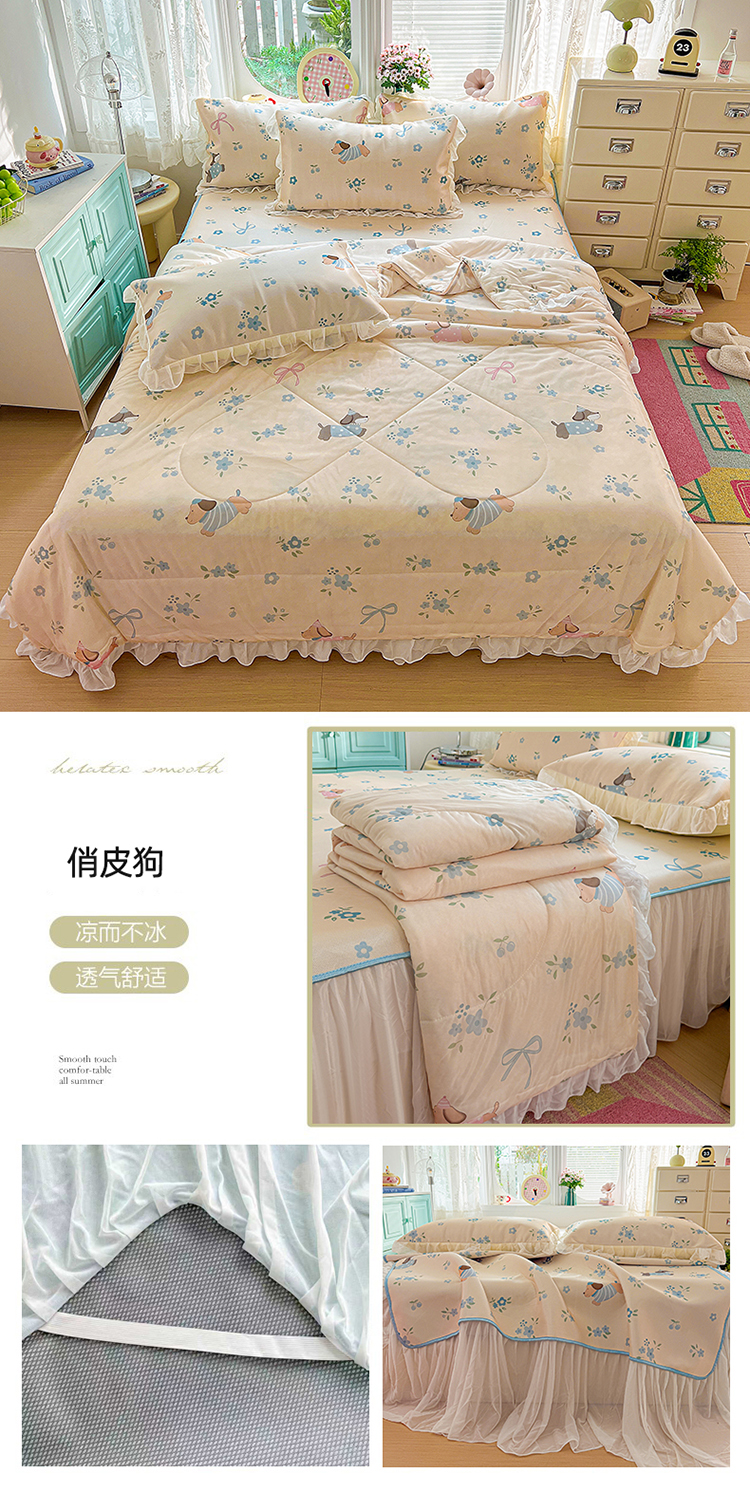 (总)2026新款印花冰丝凉席夏被四件套凉感丝夏被花边床裙凉席套件冰感丝凉席三件套,蔷薇花园,爱心波点,蝴蝶结蓝,花仙子,蝴蝶花灰,花韵庄园,美帝猫,快乐小星人,花样,梦幻乐园,幸运狗,元气女孩,莫奈花园,幸运木马,花田,俏皮狗