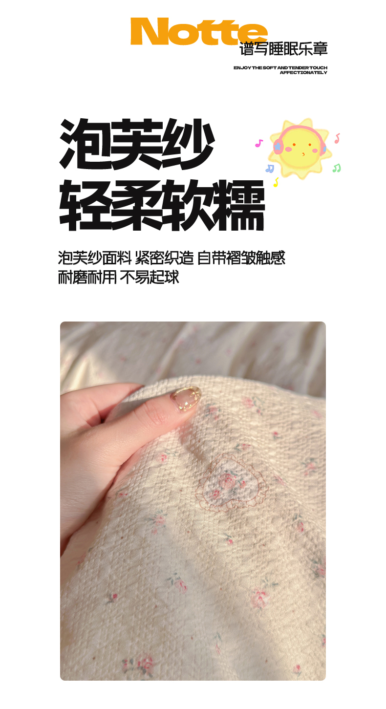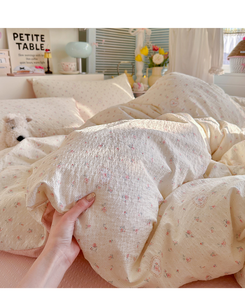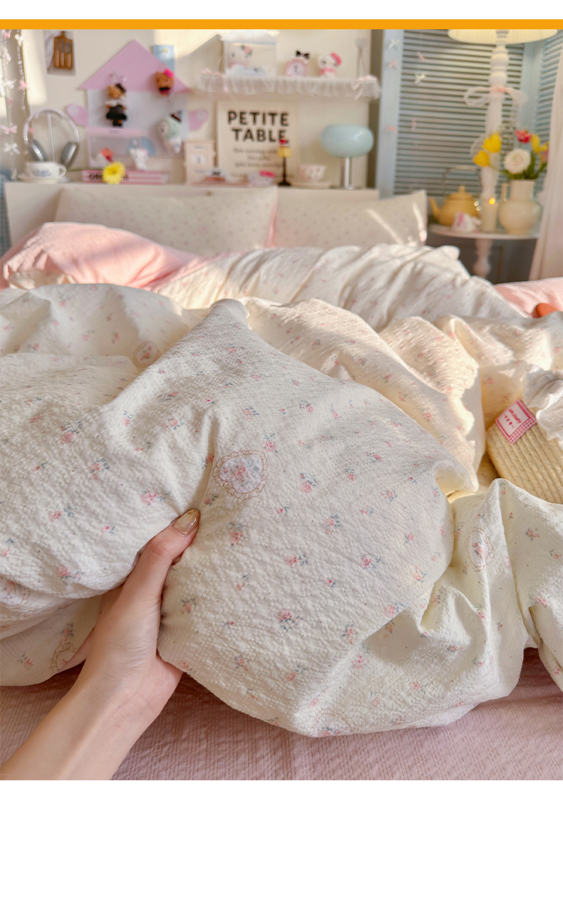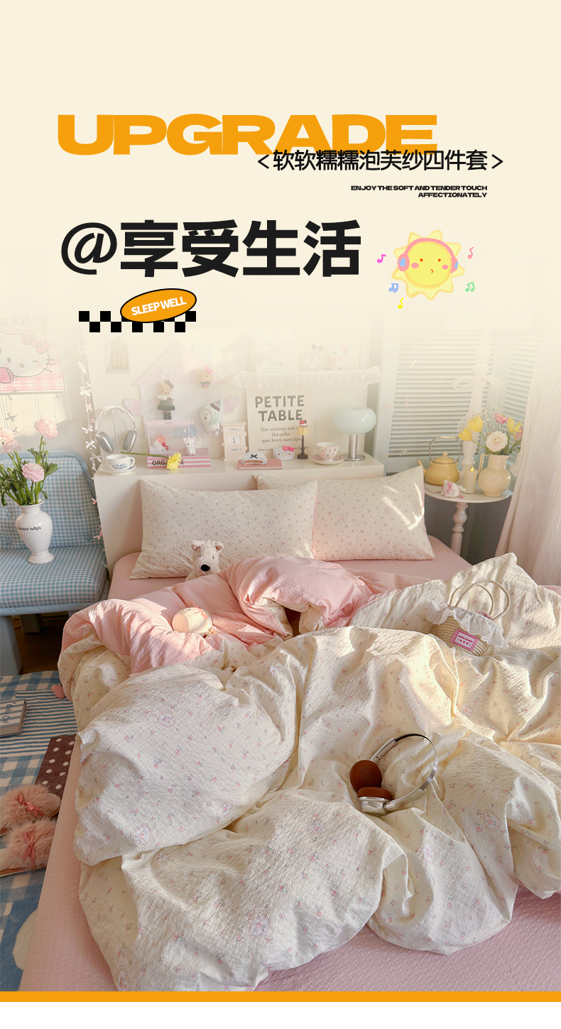 当前位置: 91家纺网 > 商品网购 > 床品套件 > 四件套 > 双层纱四件套 > 铺尚美家纺 2026新款小清新110g高品质直播热卖款A类泡芙棉双层纱四件套 甜昔