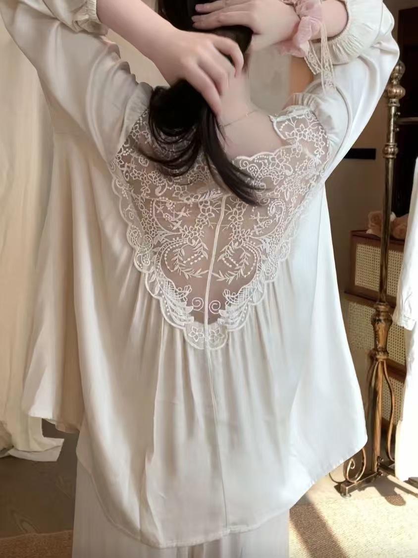 (总)洛兰沙家居馆 2026春夏新品睡裙女菲边棉纱甜美公主风长袖薄款可外穿家居服睡裙,花色1,花色2(紫色),花色3