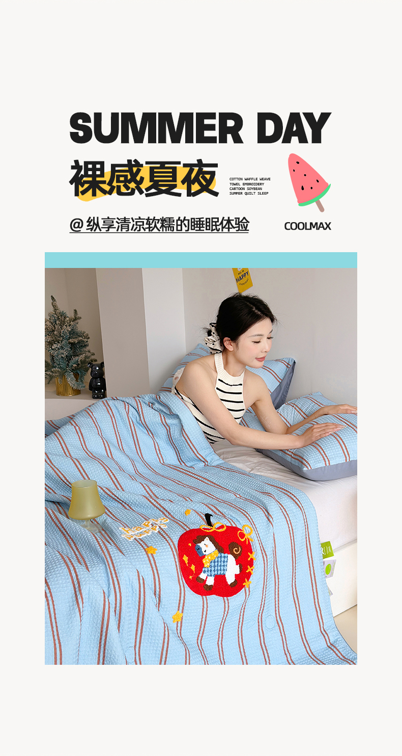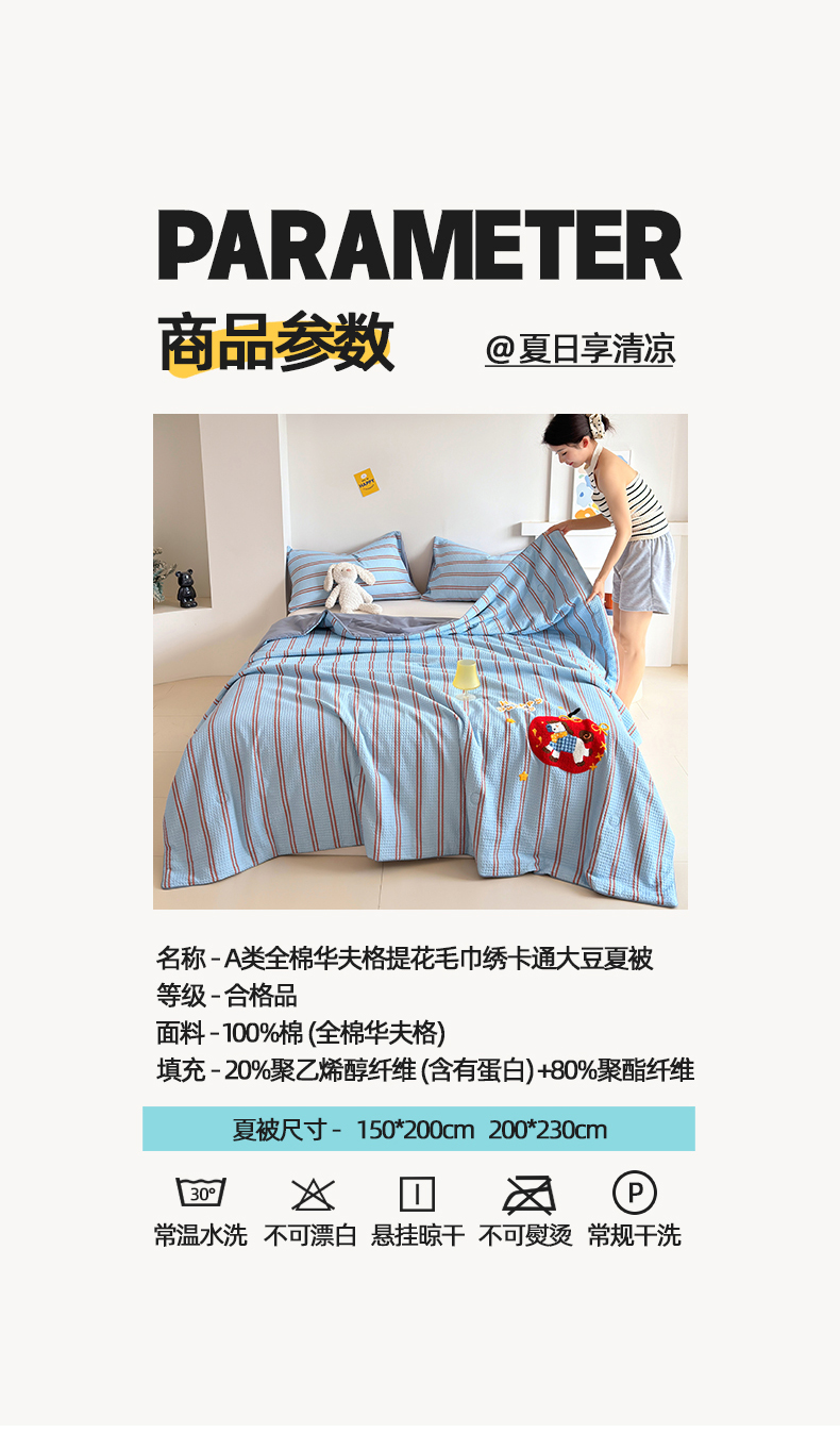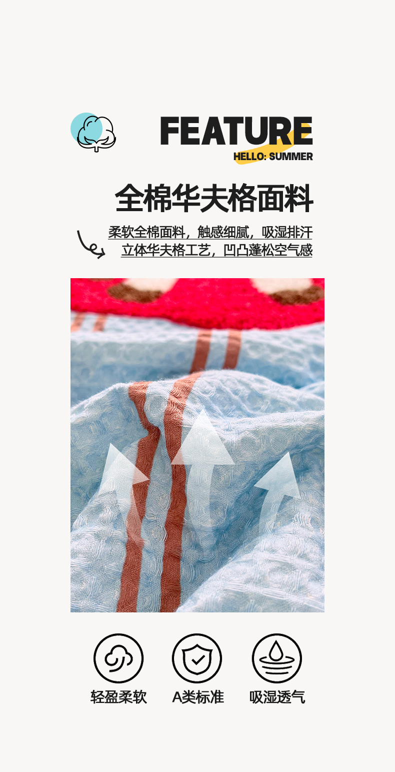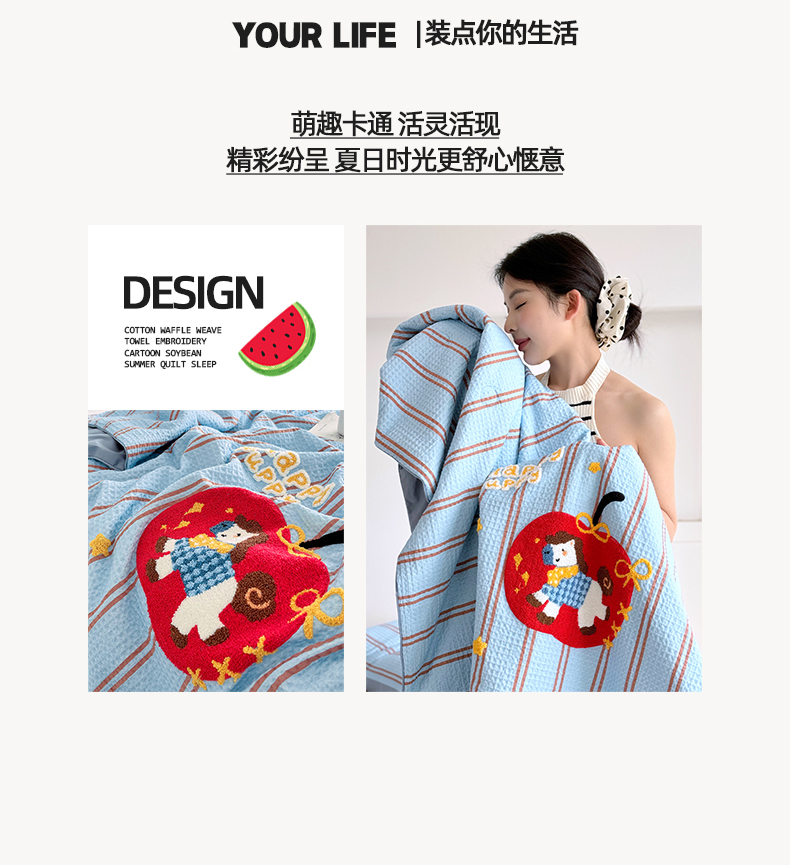 商品名称:莱宁被业 2026新款A类全棉华夫格提花毛巾绣卡通大豆夏被 条纹木马