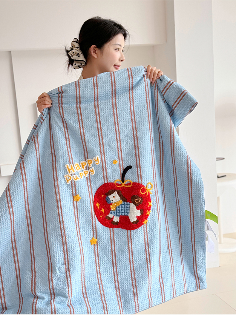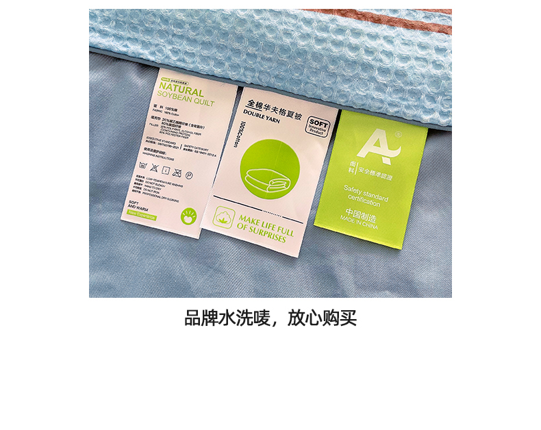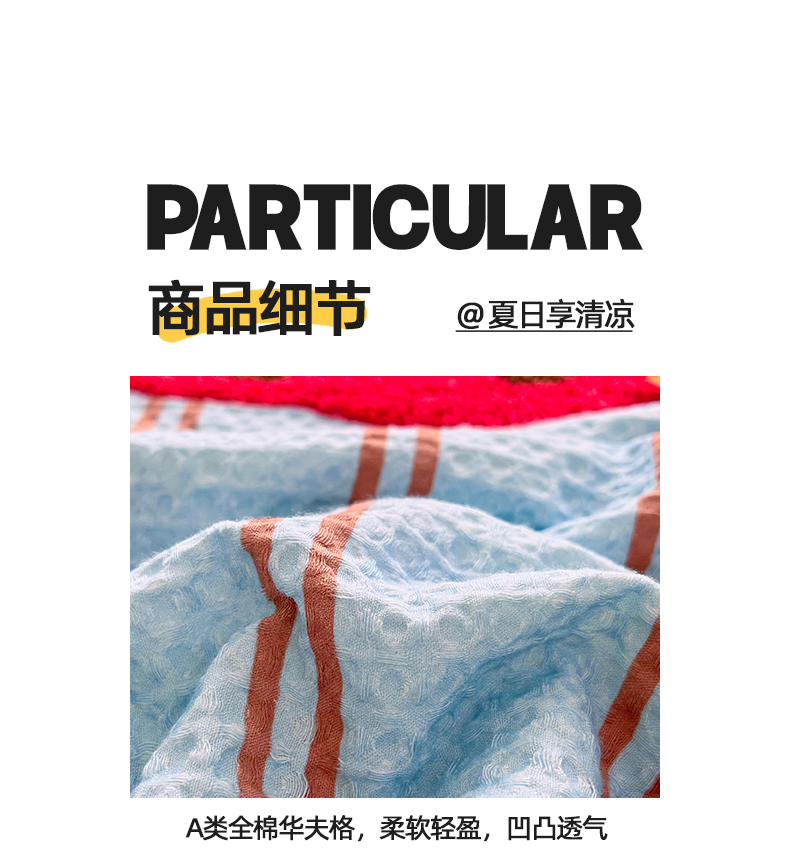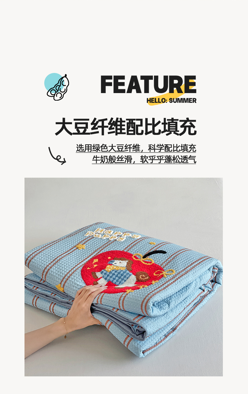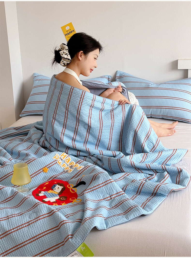 商品名称:莱宁被业 2026新款A类全棉华夫格提花毛巾绣卡通大豆夏被 条纹木马