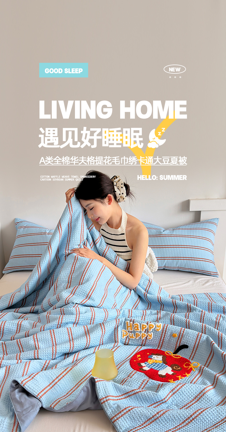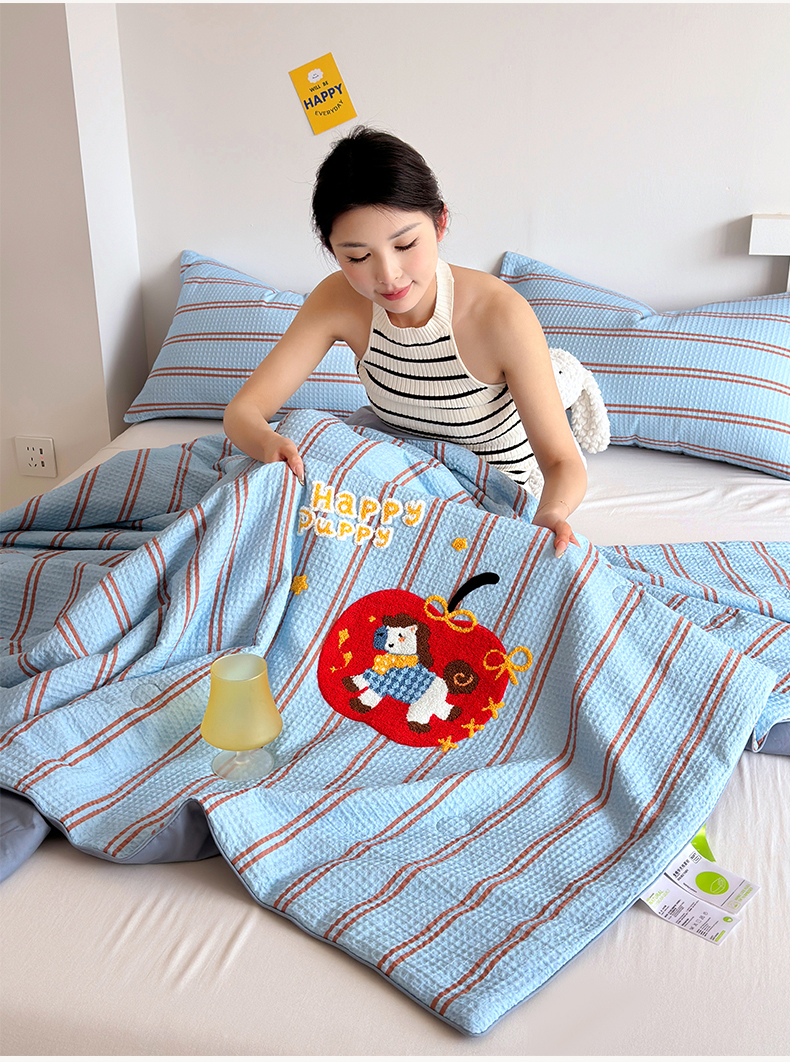 莱宁被业 2026新款A类全棉华夫格提花毛巾绣卡通大豆夏被 条纹木马