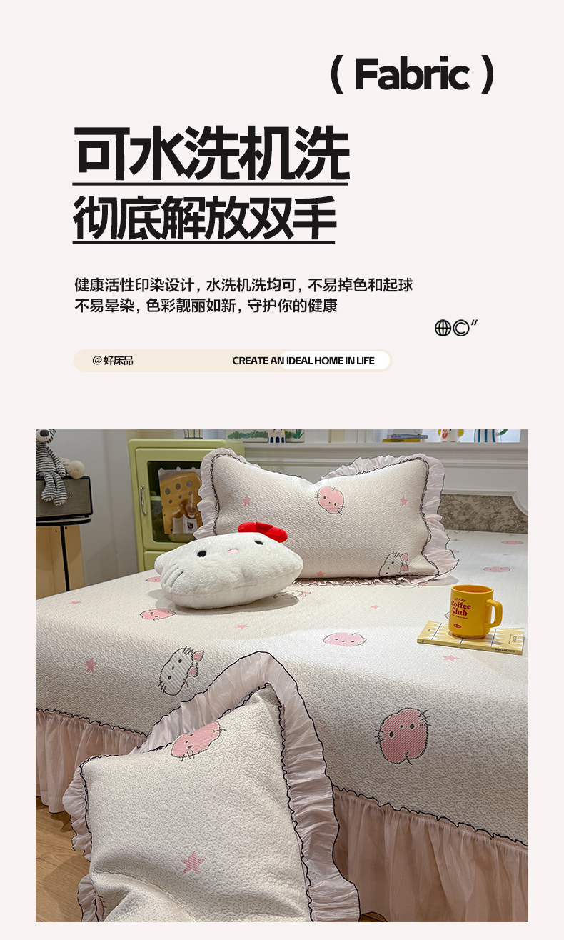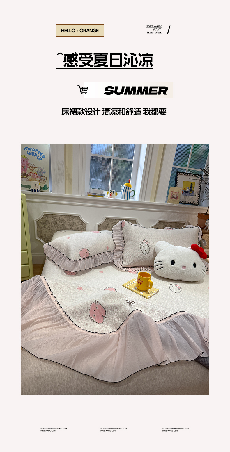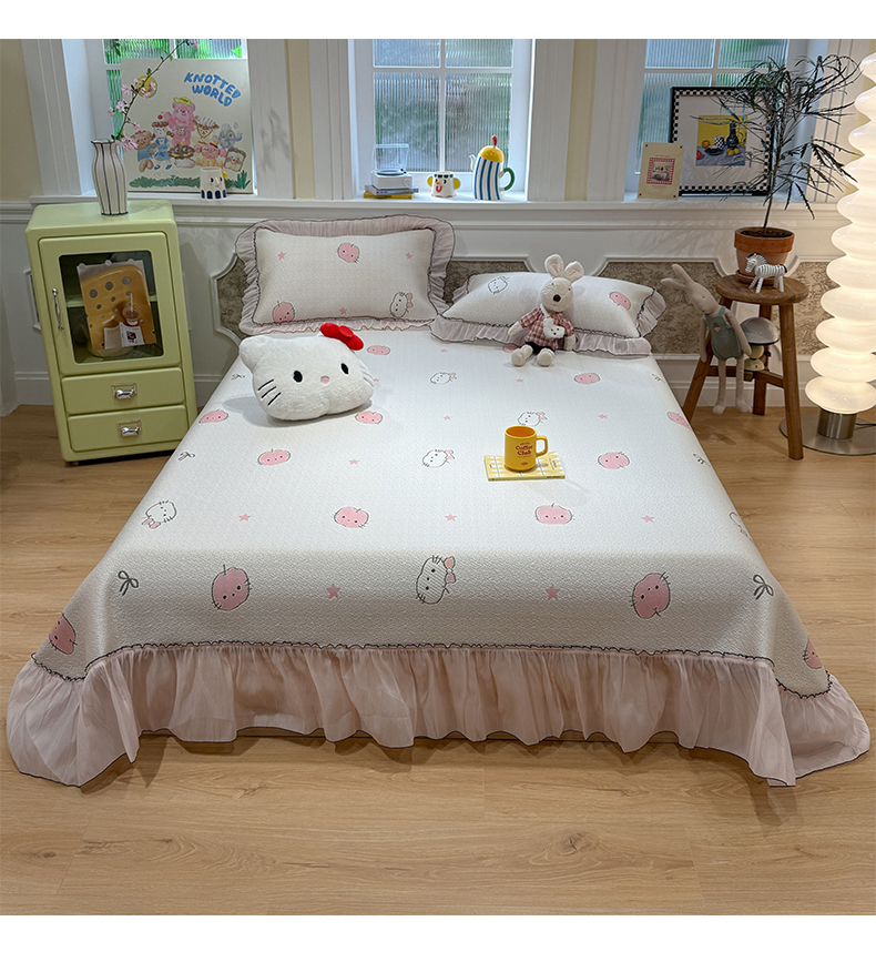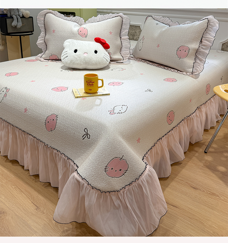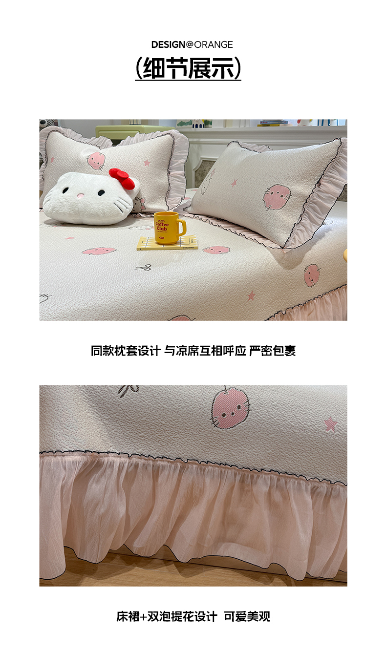 商品名称:雅居纺家纺 2026新款PE凉感卡通床裙床盖凉席韩版花边加厚三明治底PE凉感席 粉色猫咪家族