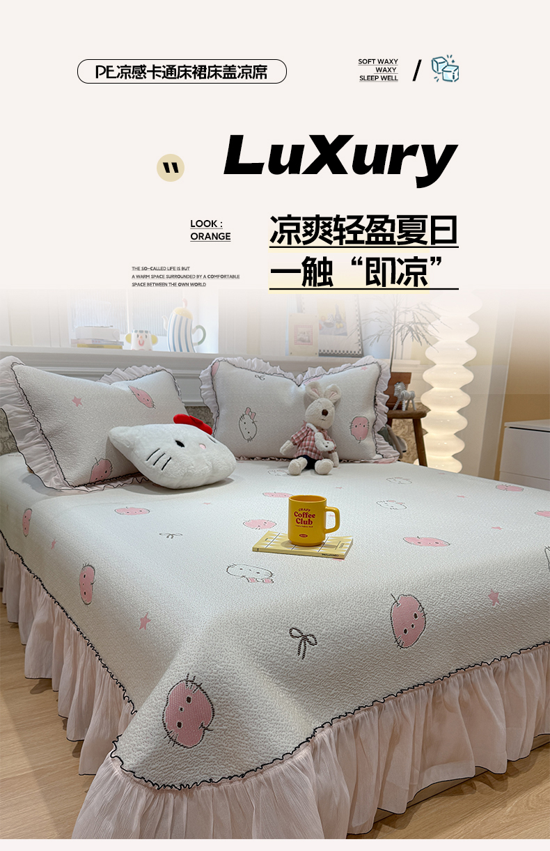(总)雅居纺家纺 2026新款PE凉感卡通床裙床盖凉席韩版花边加厚三明治底PE凉感席,粉色猫咪家族,粉色星星腊肠狗,萌萌苹安果,汪星人,夏日苹果狗,幸运酷熊