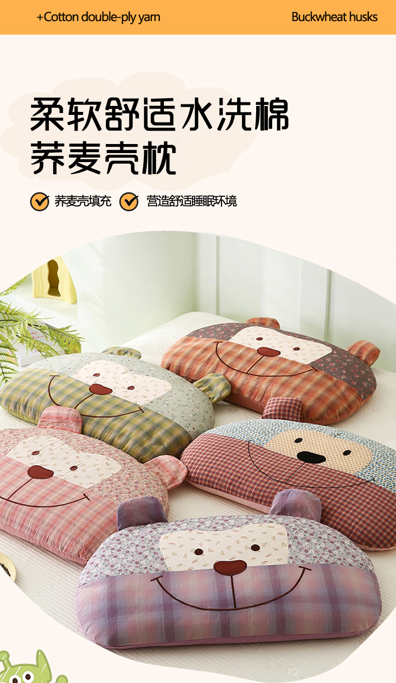 (总)贤内助家纺 2026新款全棉水洗棉儿童荞麦枕护肩枕枕头枕芯,组合图仅做展示不可下单,福贝贝粉色,福贝贝咖色,福贝贝蓝色,福贝贝绿色,福贝贝紫色