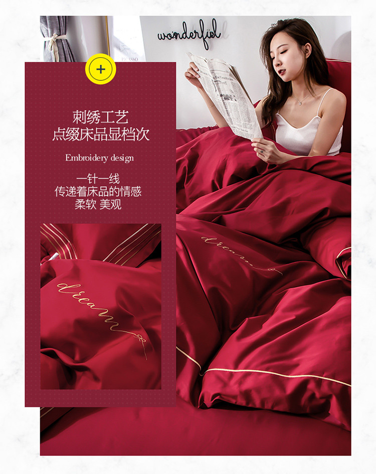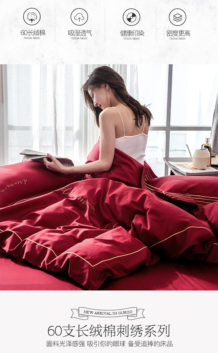 商品名称:瑞米家居 2019新款60长绒棉素色绣工艺系列四件套 盛夏红