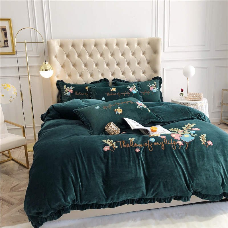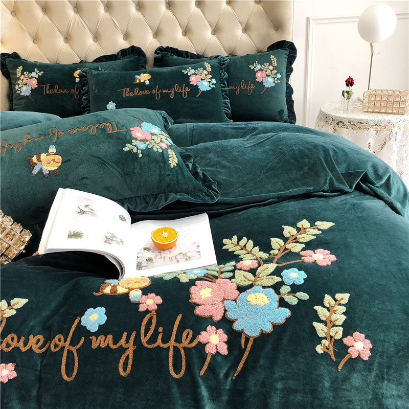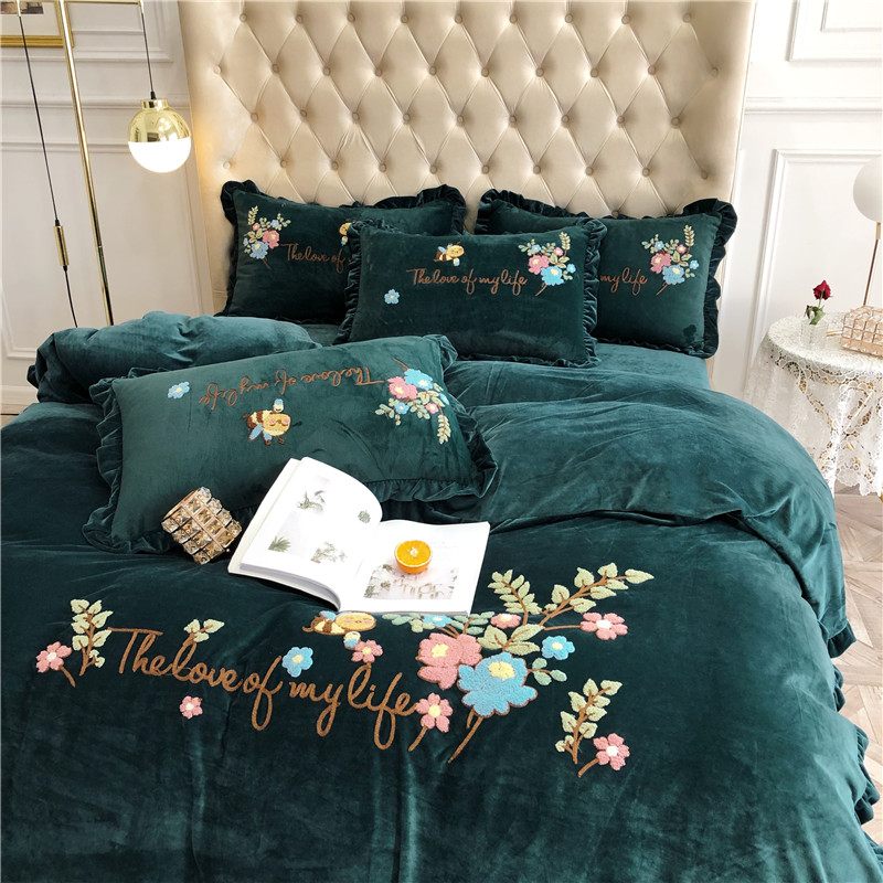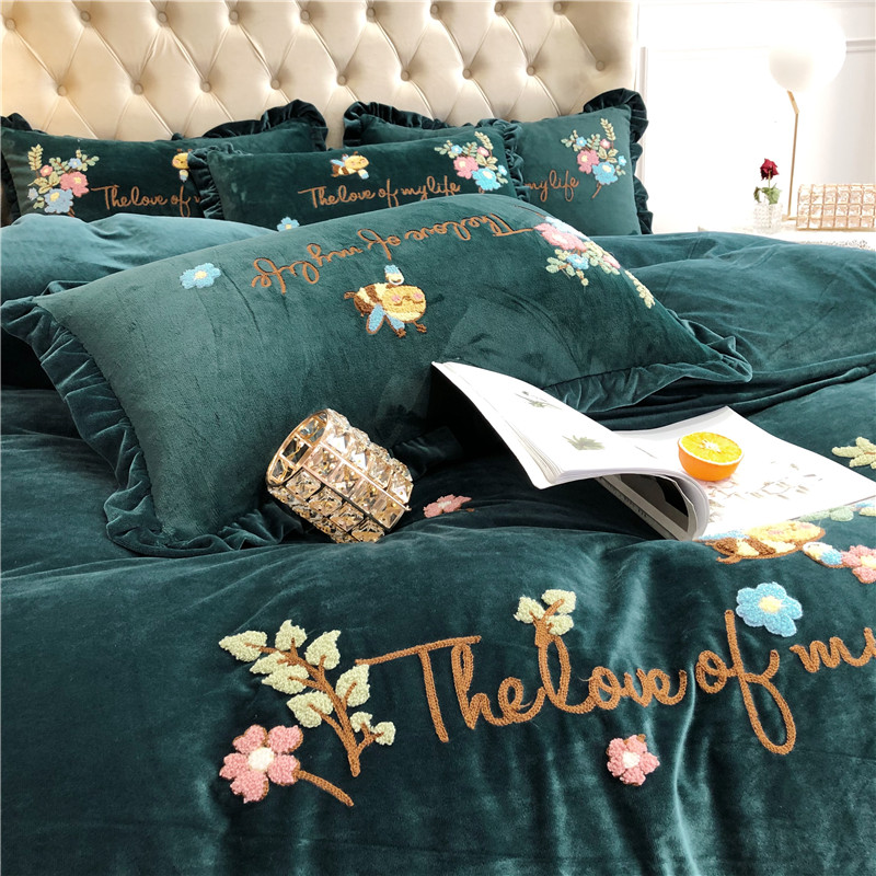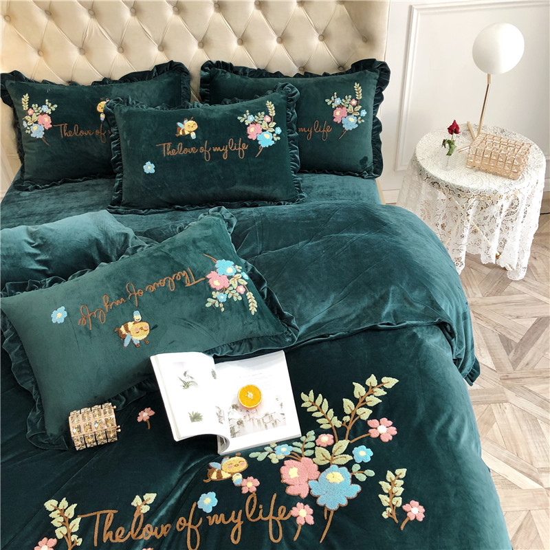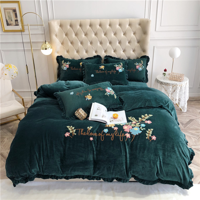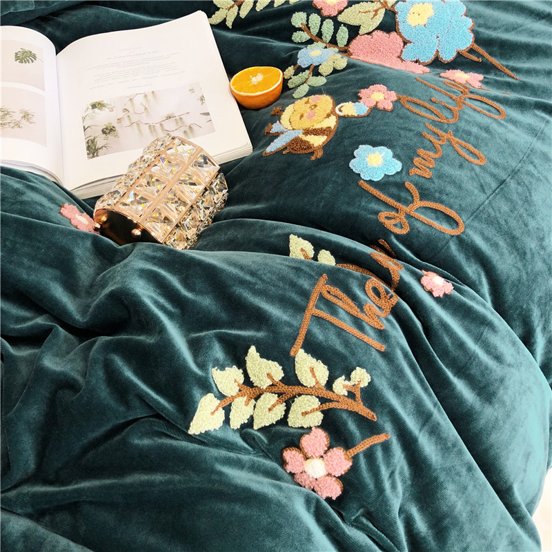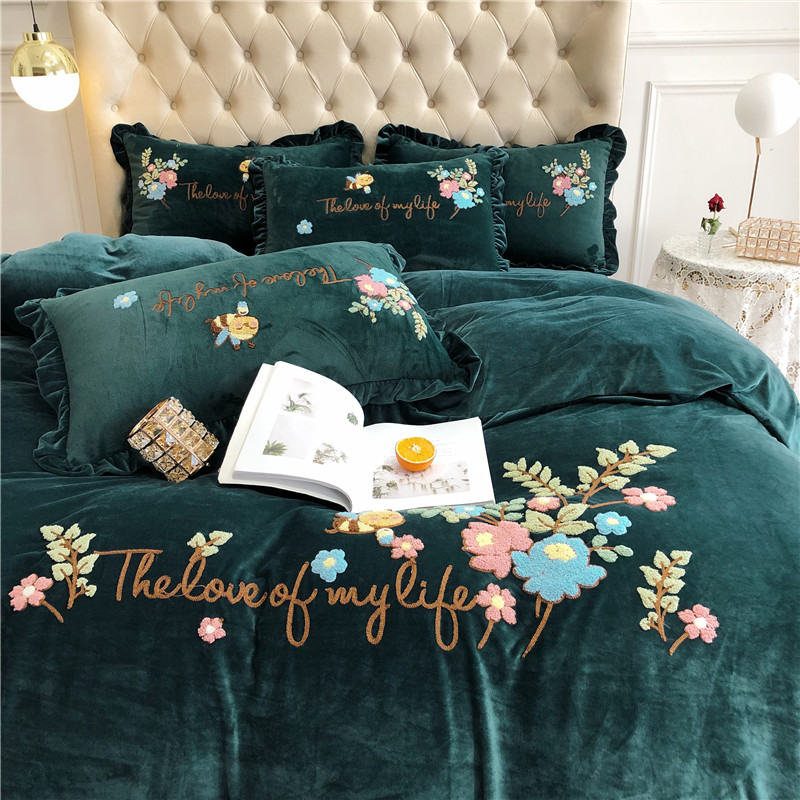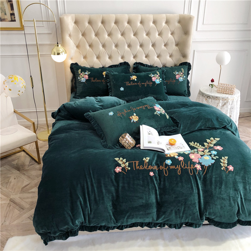 馨蕊家居 2021秋冬轻奢牛奶绒花韵系列四件套 墨绿