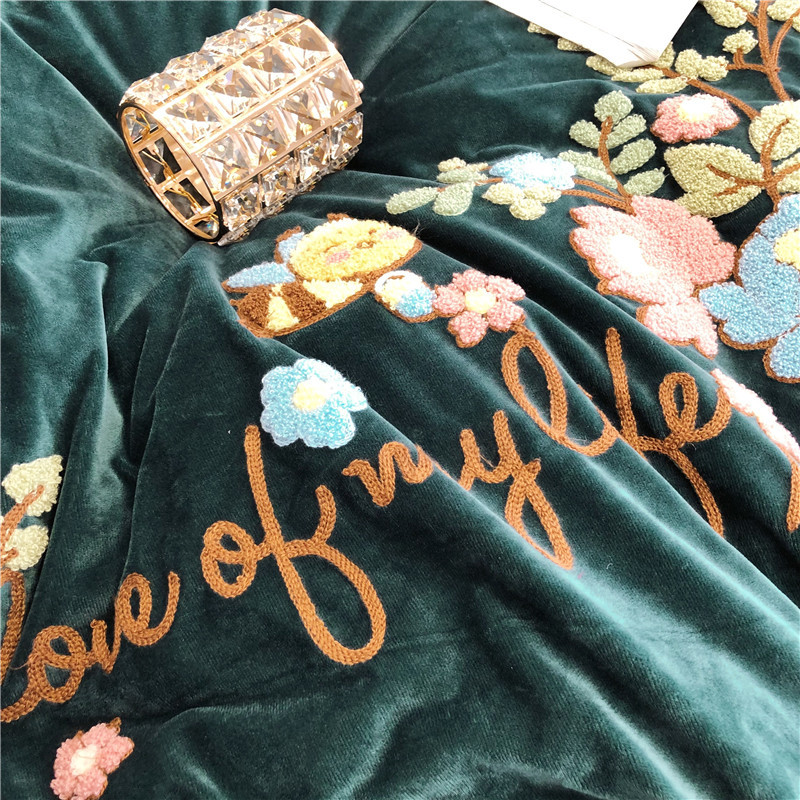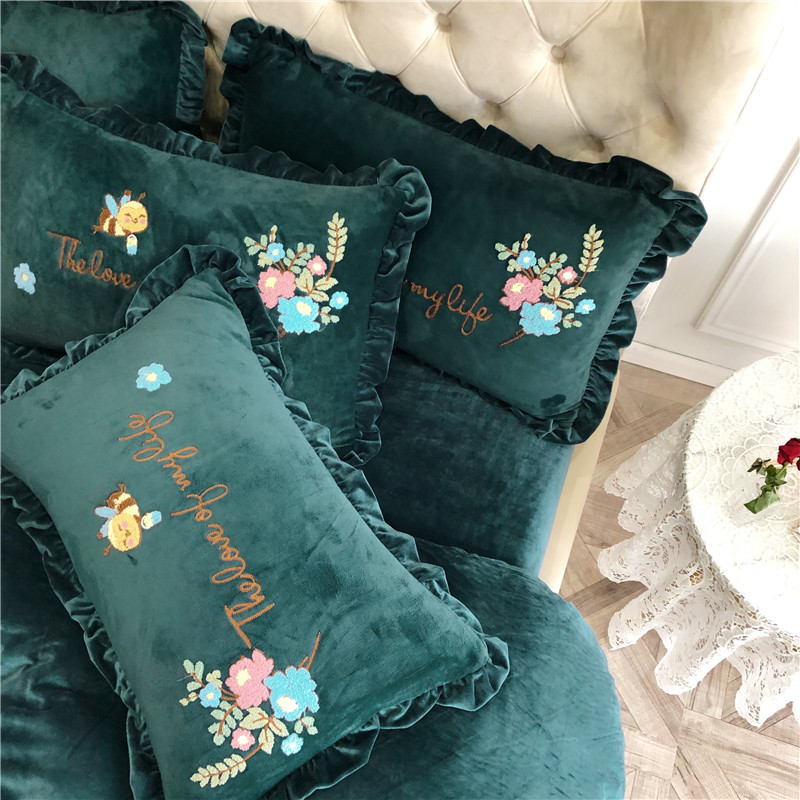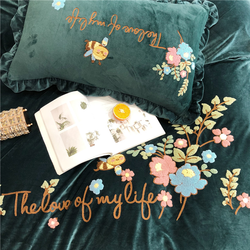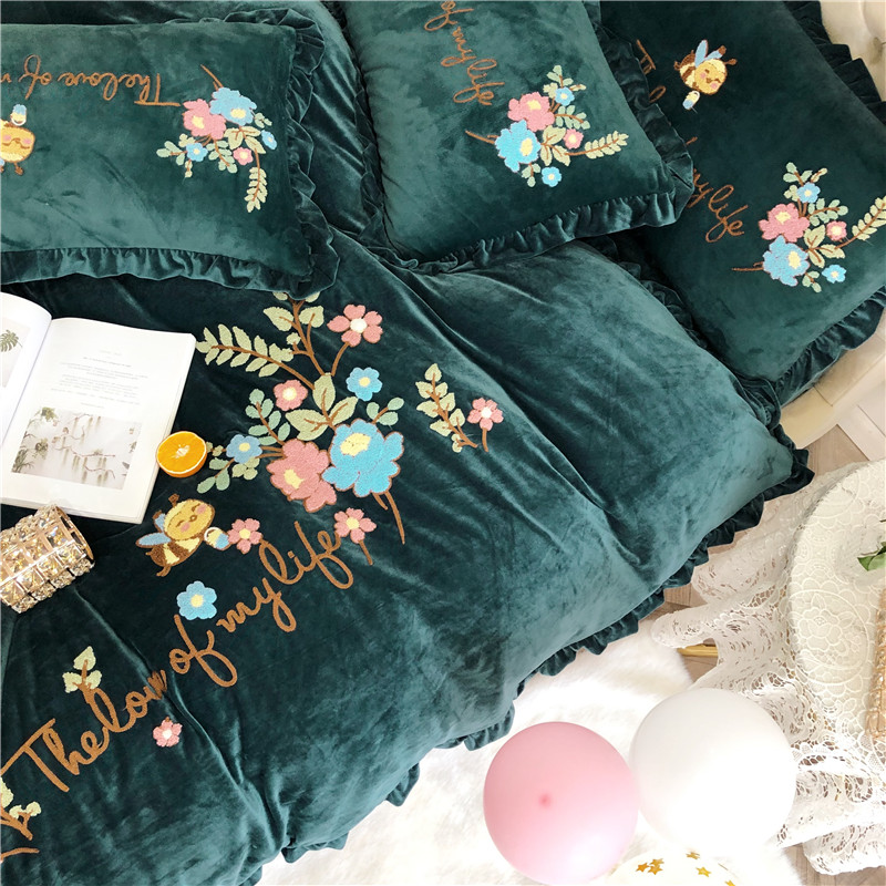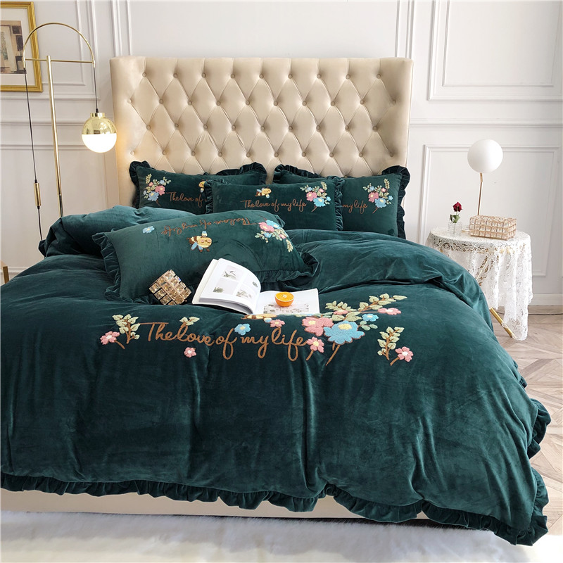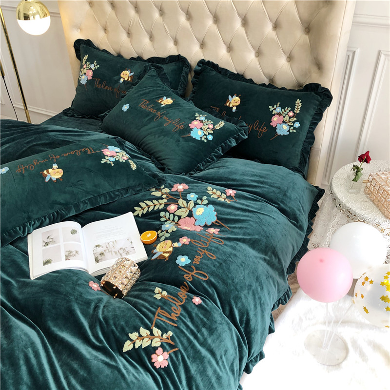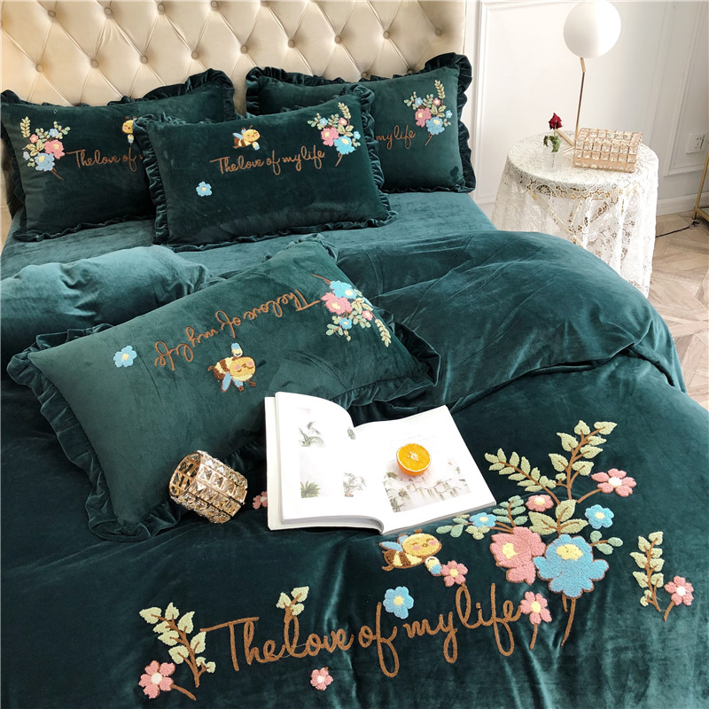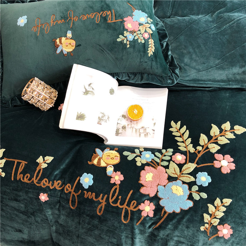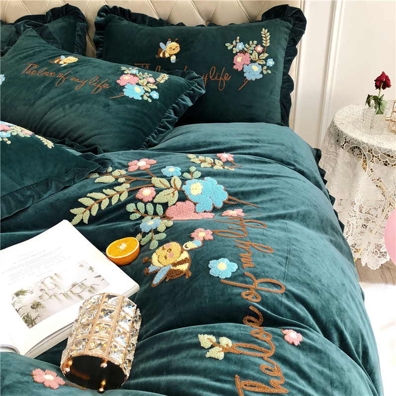 馨蕊家居 2021秋冬轻奢牛奶绒花韵系列四件套 墨绿