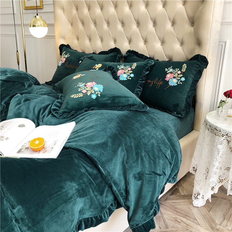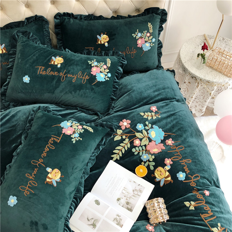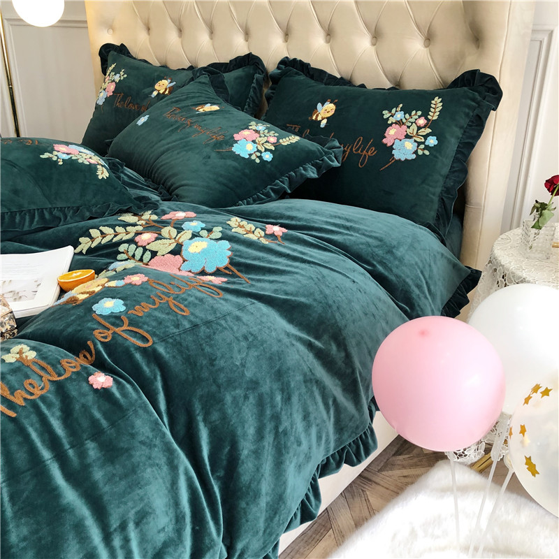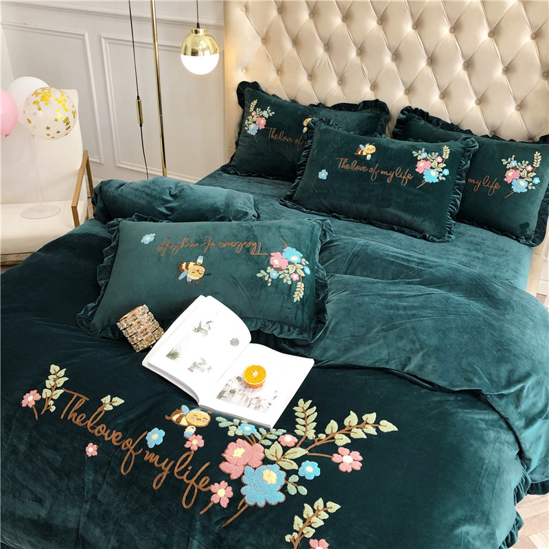 商品名称:馨蕊家居 2021秋冬轻奢牛奶绒花韵系列四件套 墨绿