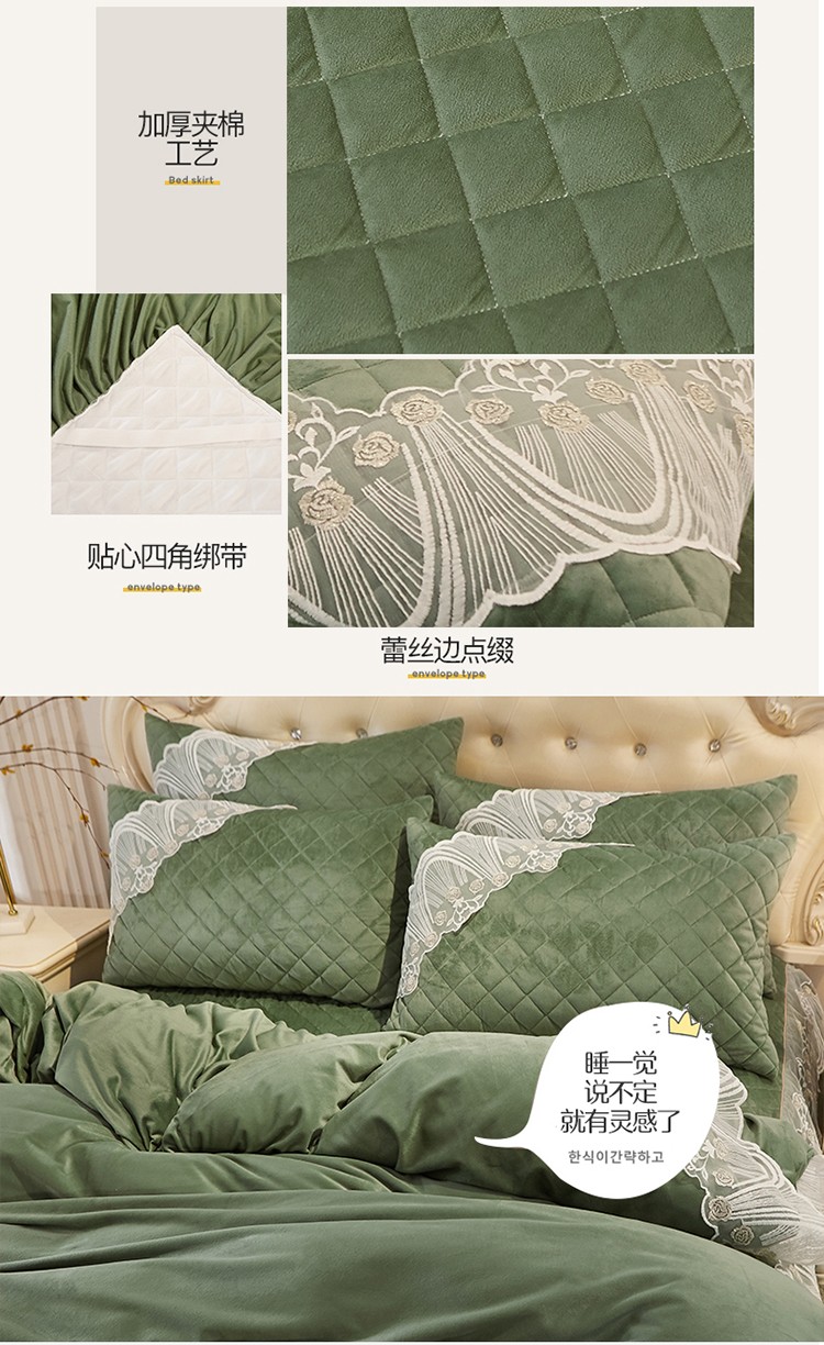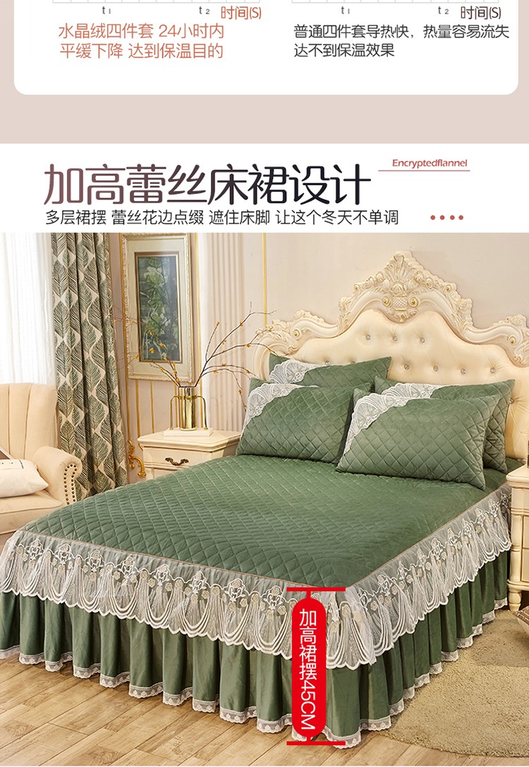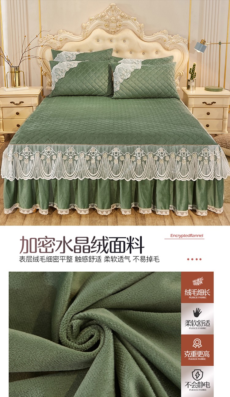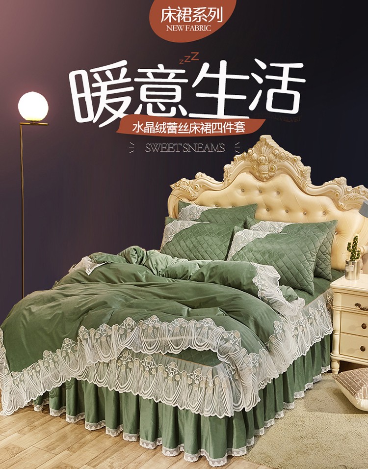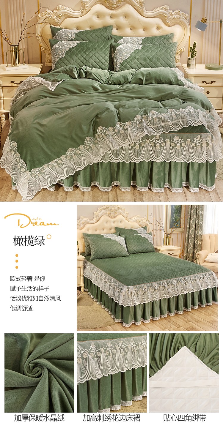 商品名称:网红馆 2025新款幸福花开水晶绒蕾丝床裙四件套 橄榄绿