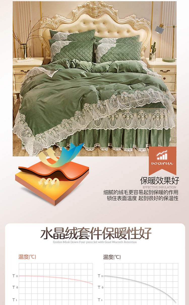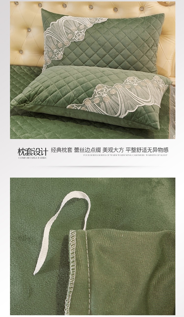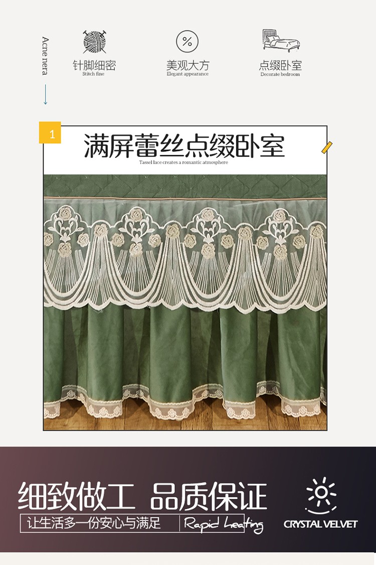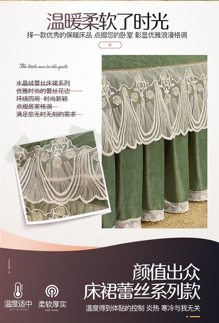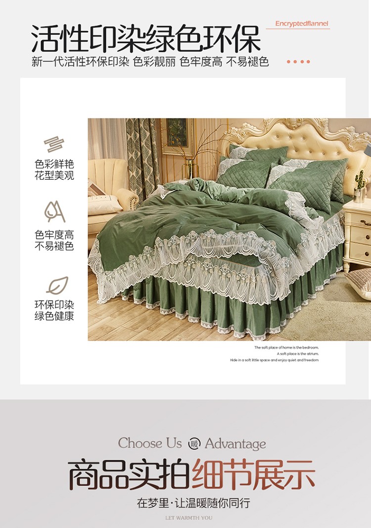 商品名称:网红馆 2025新款幸福花开水晶绒蕾丝床裙四件套 橄榄绿