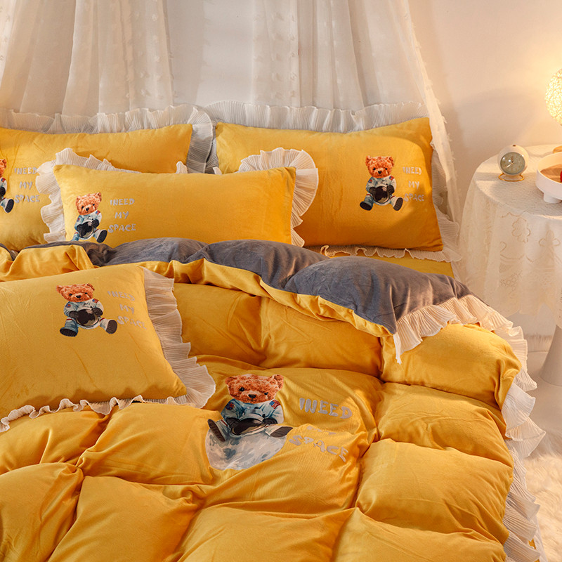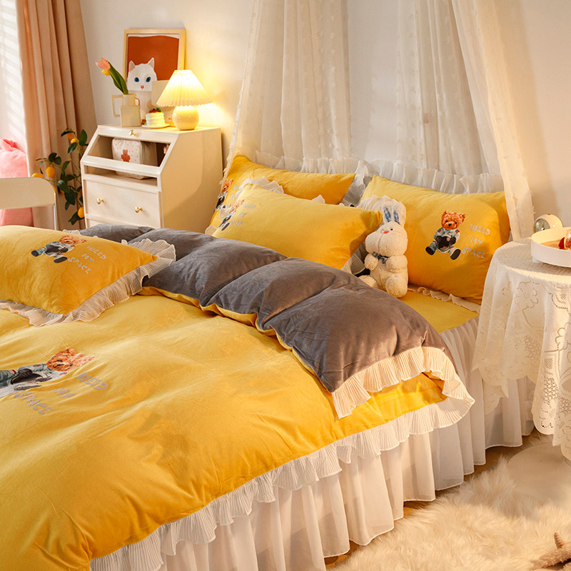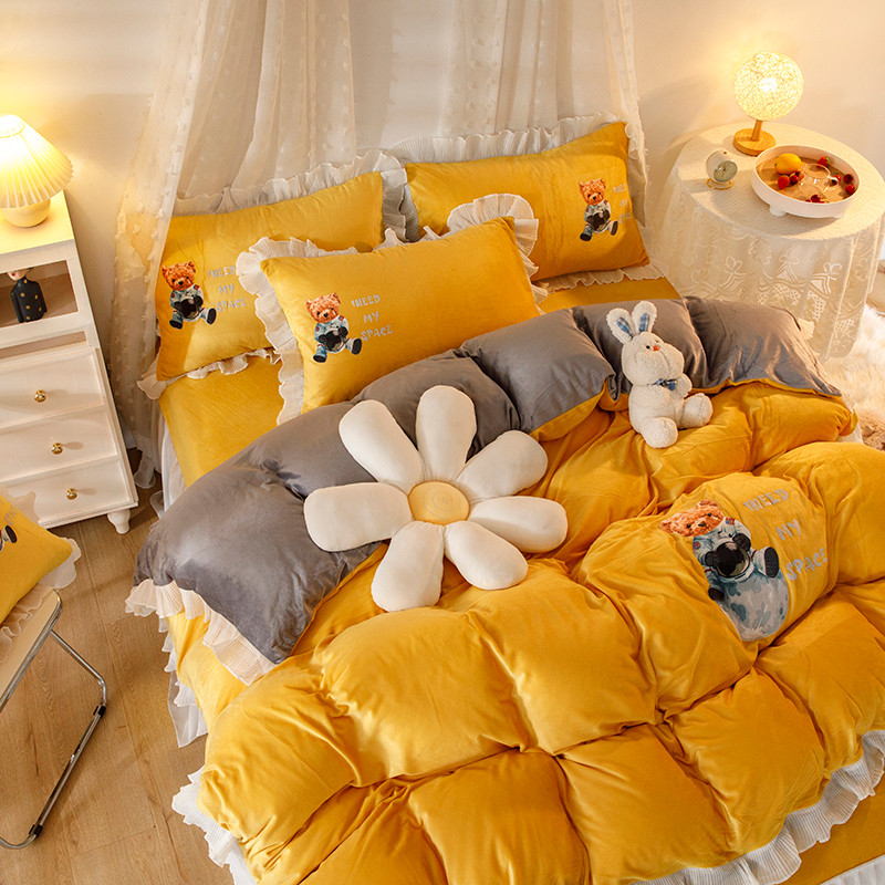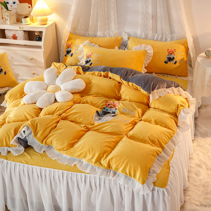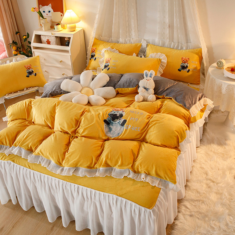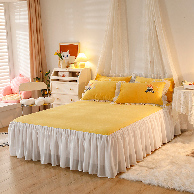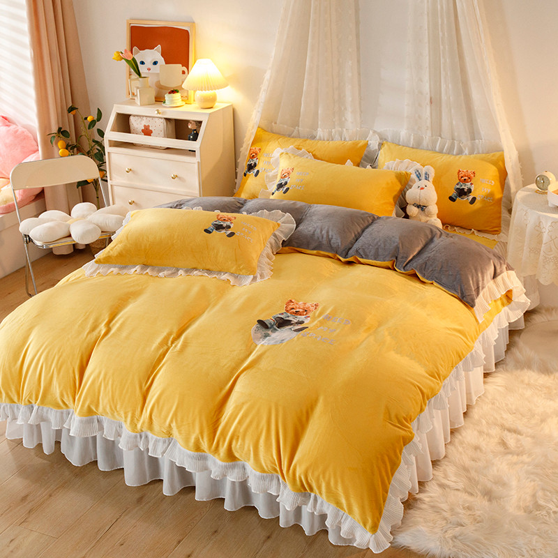 纽缦 2021新款韩版水晶绒床裙四件套 雏菊-姜黄灰
