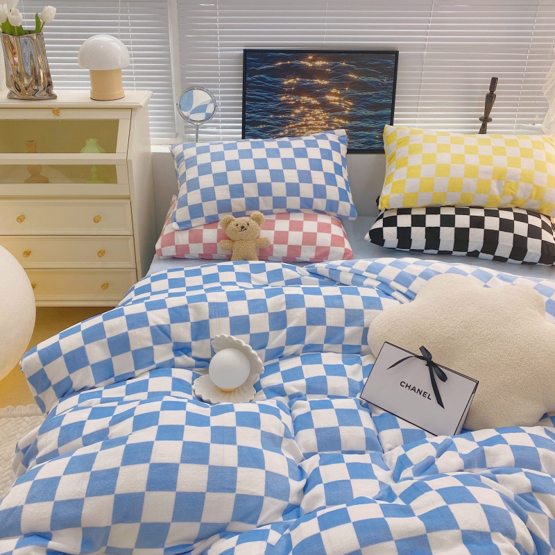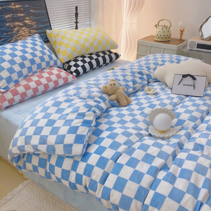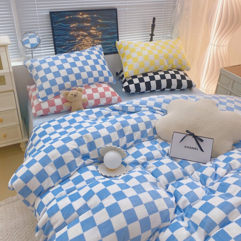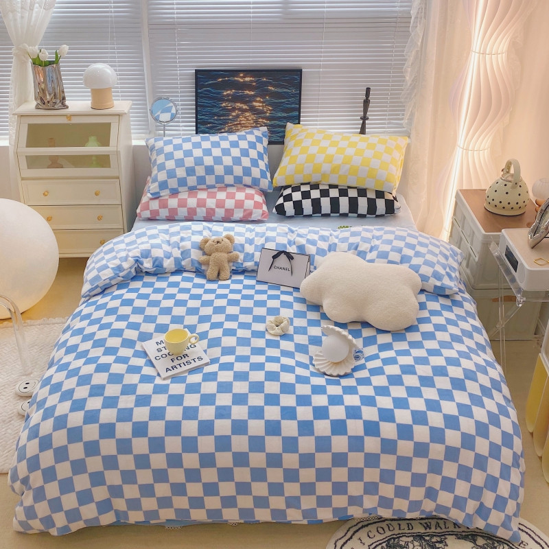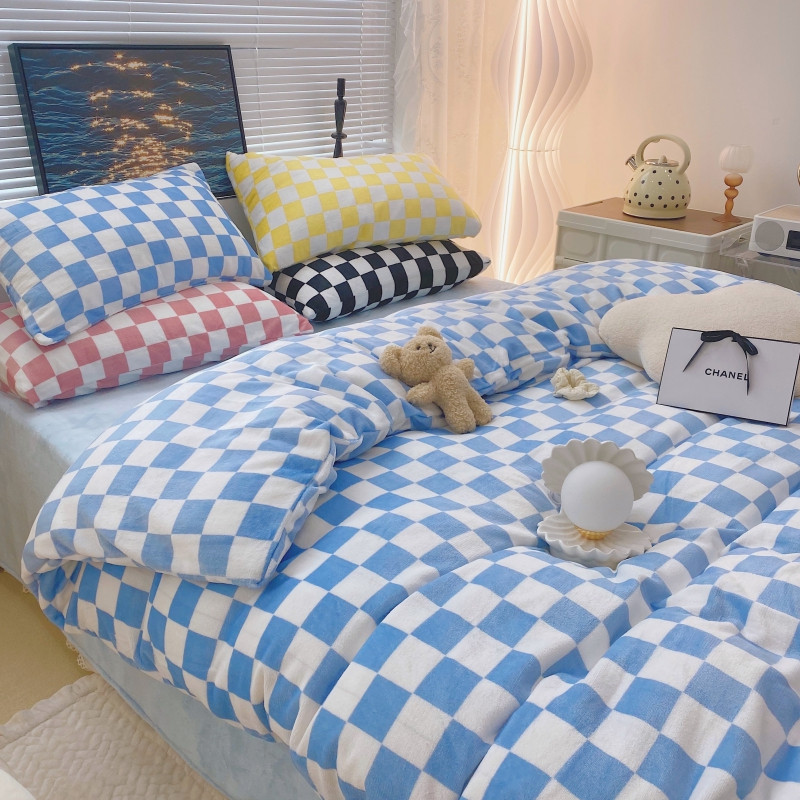 顾里家纺 2021新款韩系撞色棋盘格高克重牛奶绒四件套 海盐蓝