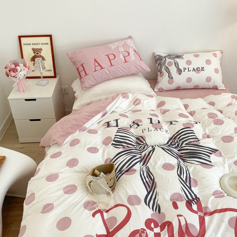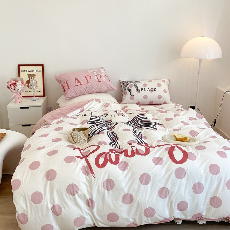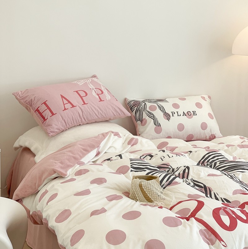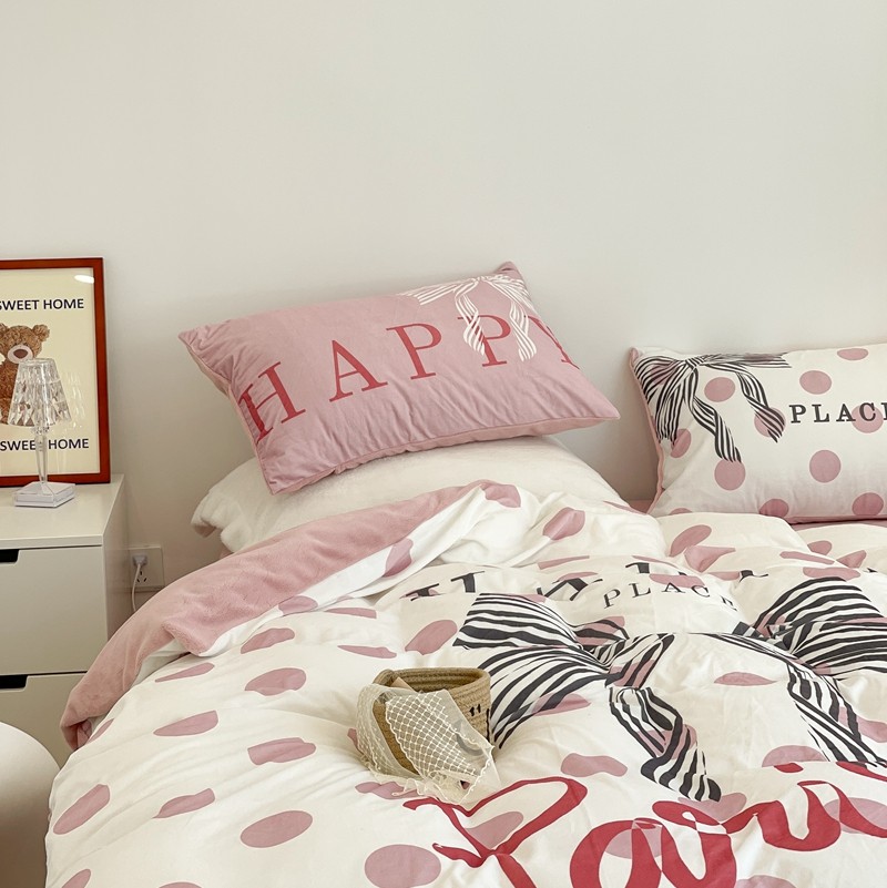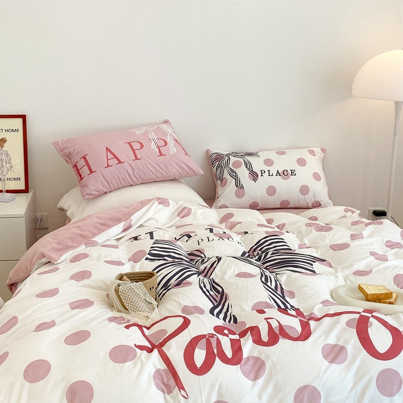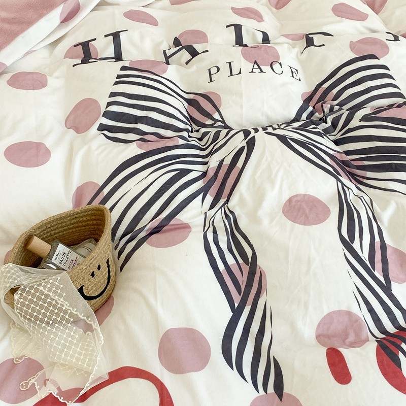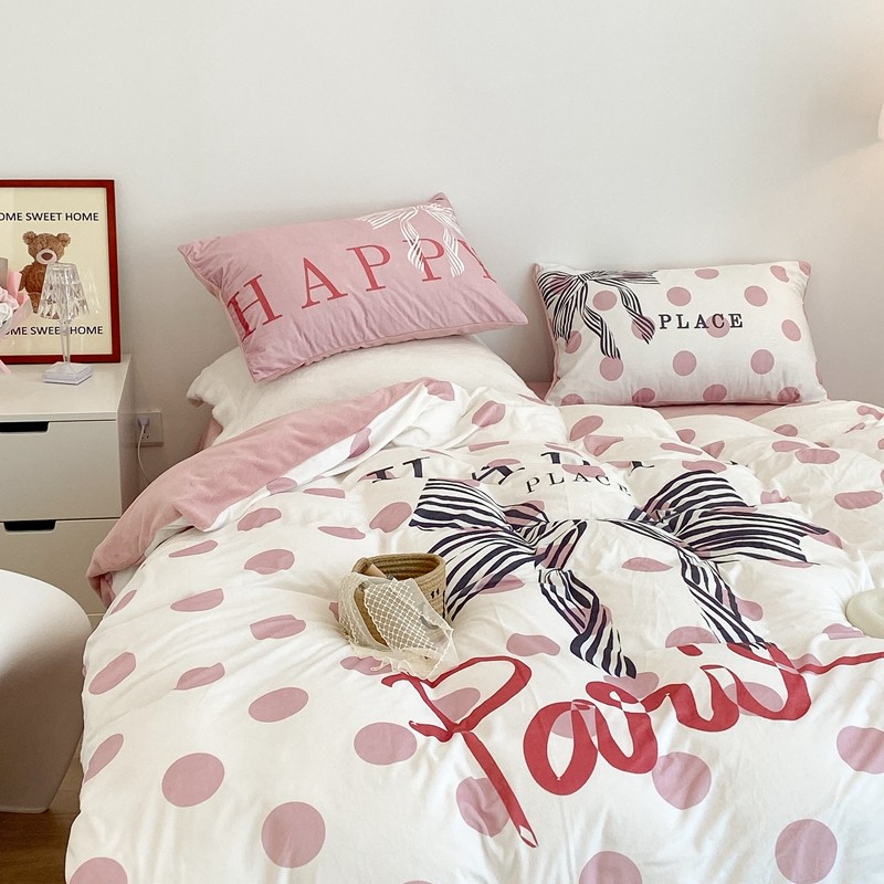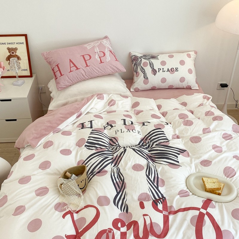 昔可家纺 2021新款大版宝宝牛奶绒四件套 粉波点蝴蝶结