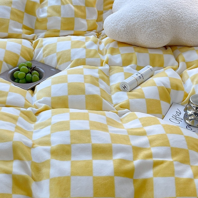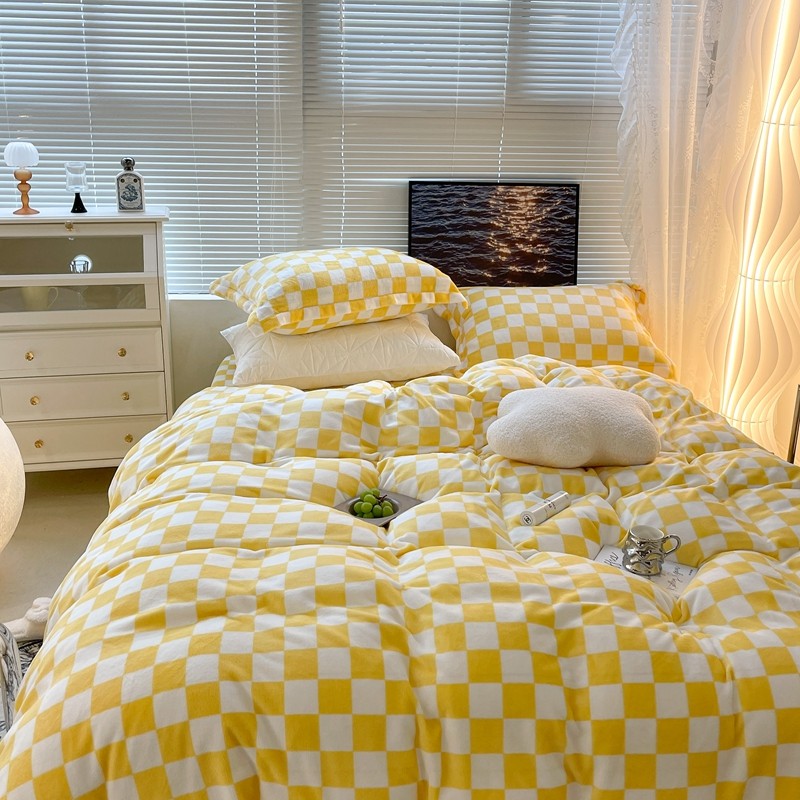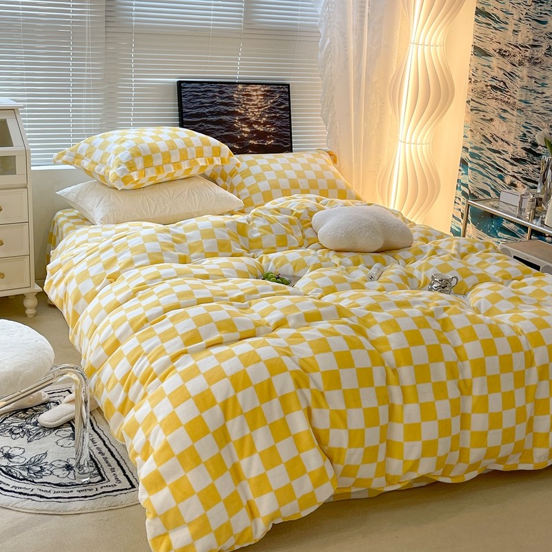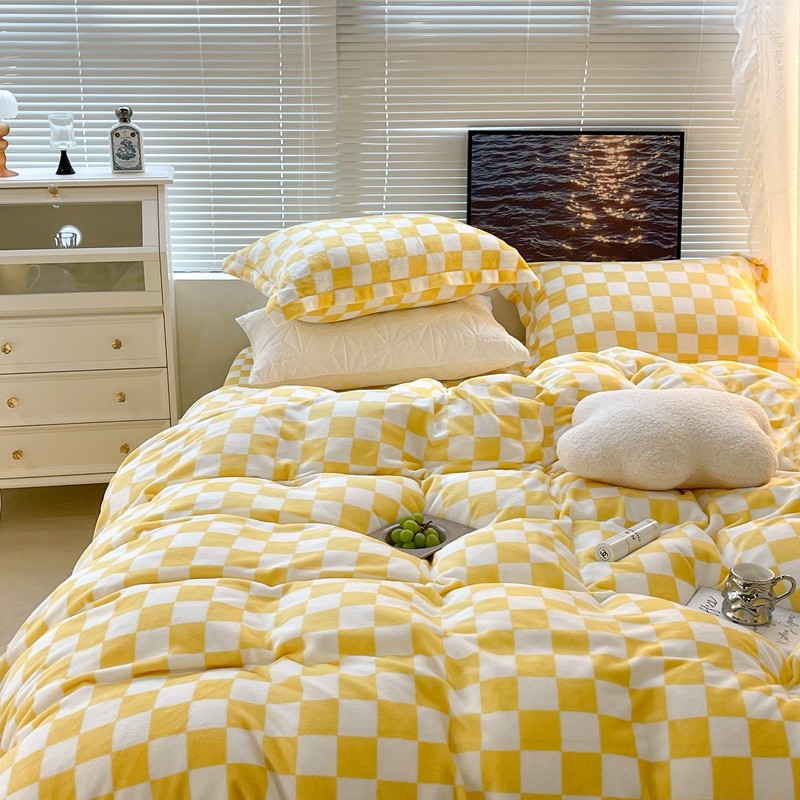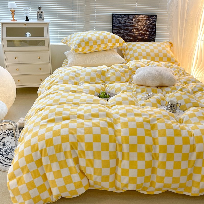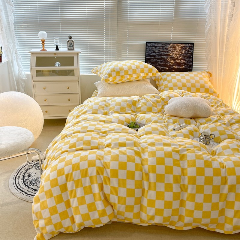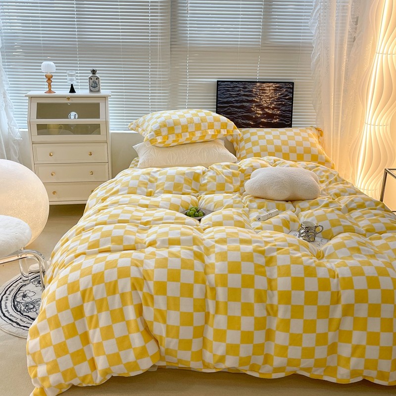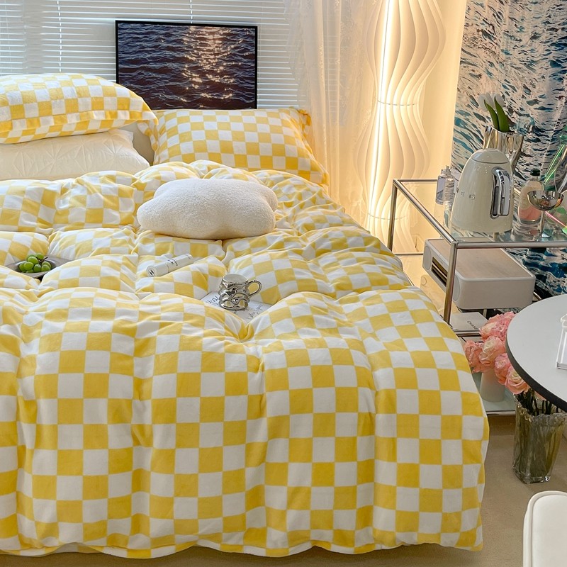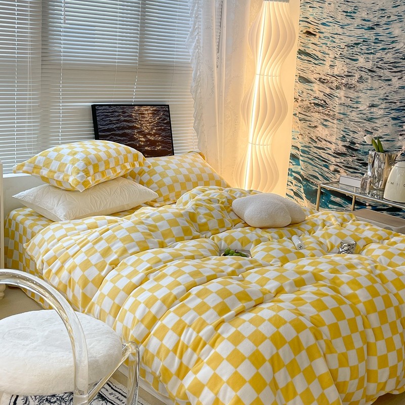昔可家纺 2021新款牛奶绒棋盘格系列四件套 黄