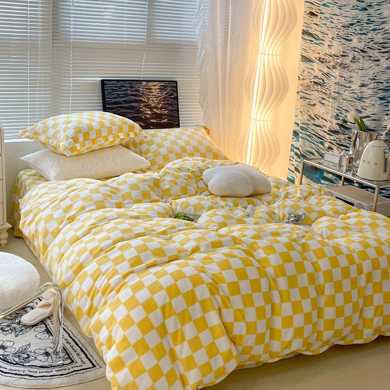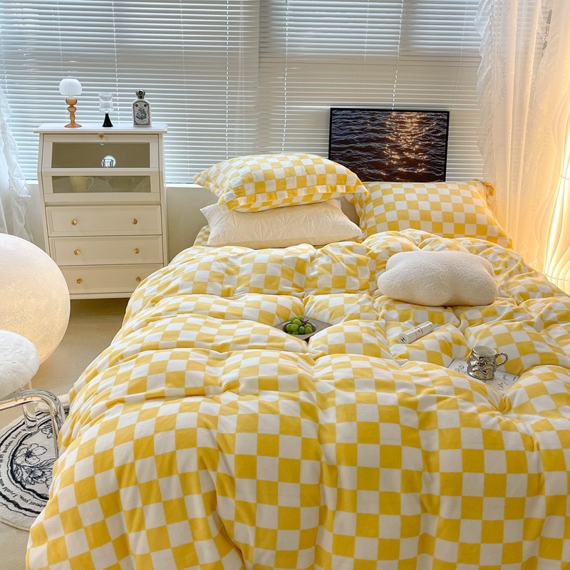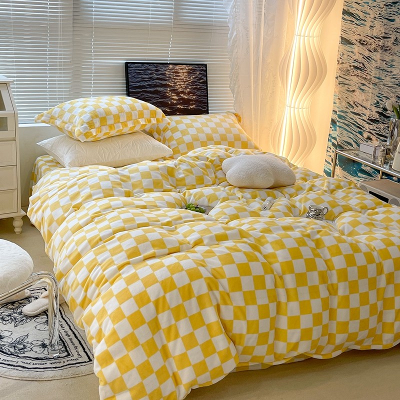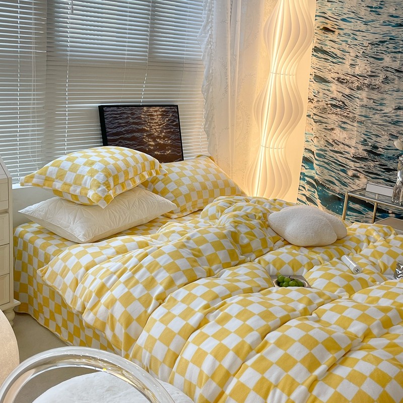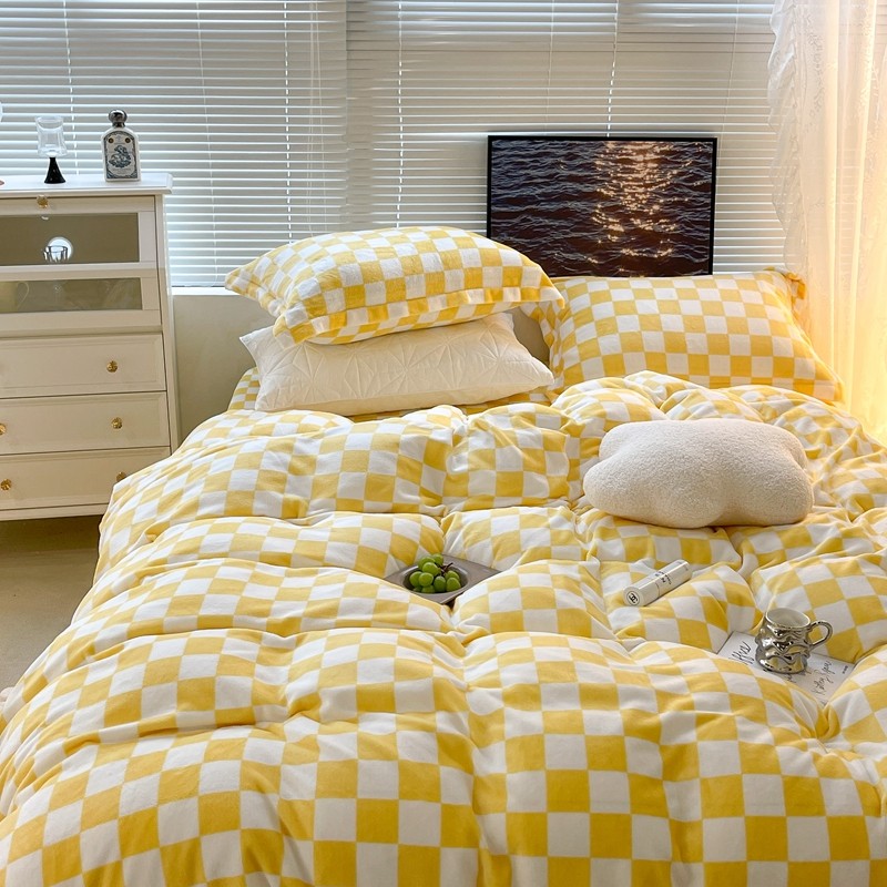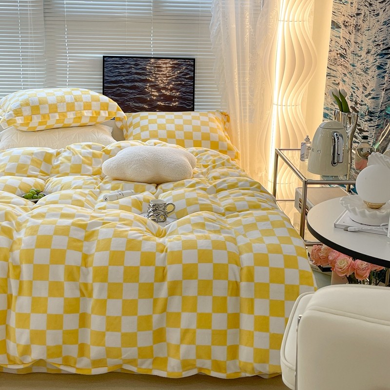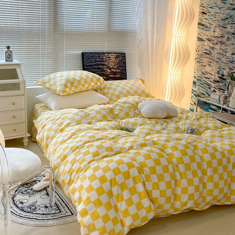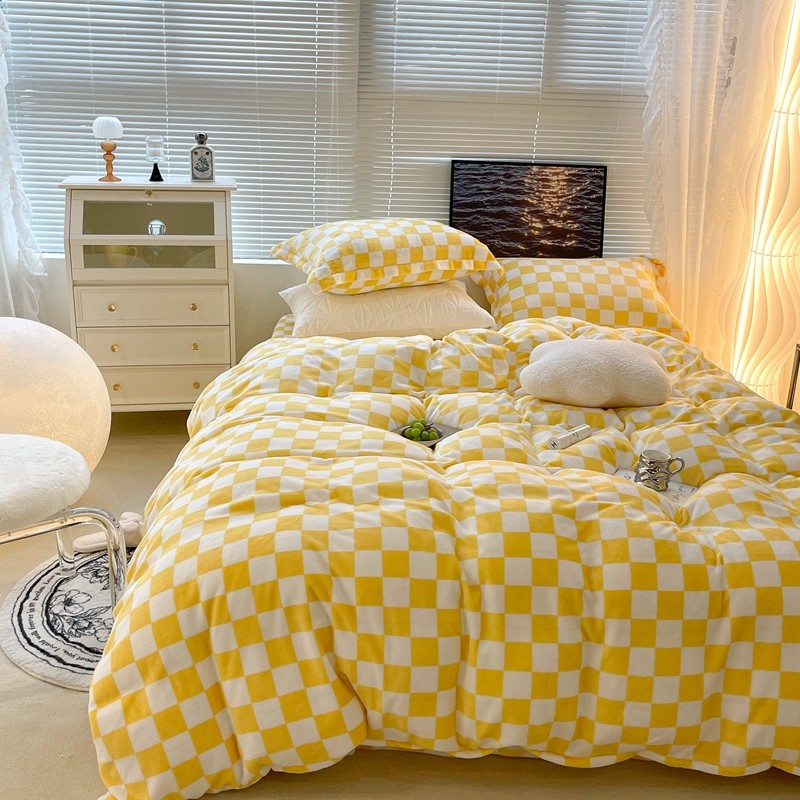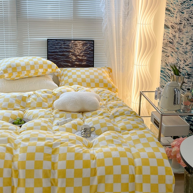 昔可家纺 2021新款牛奶绒棋盘格系列四件套 黄
