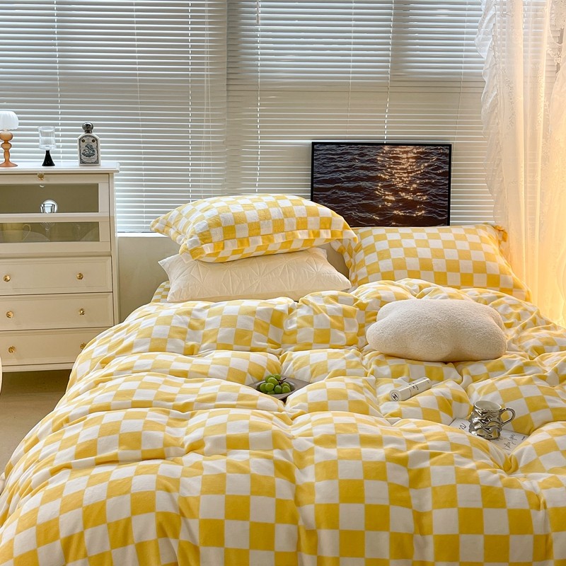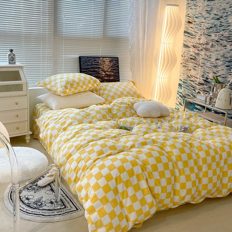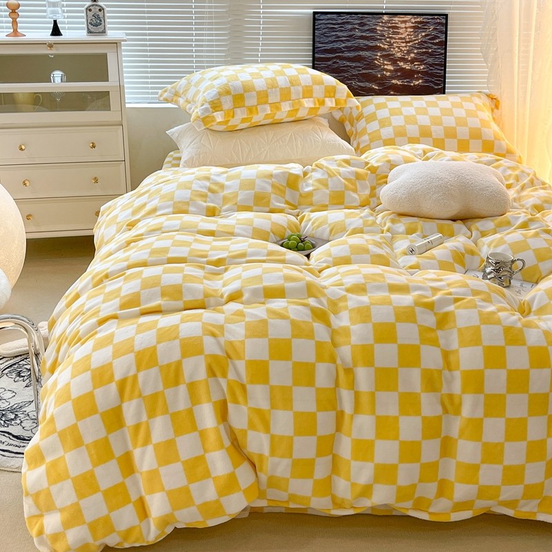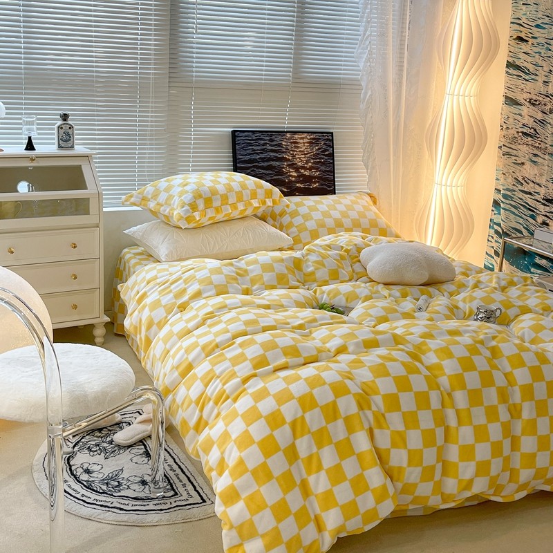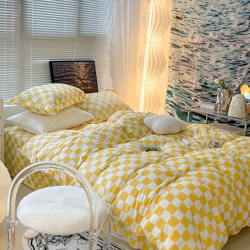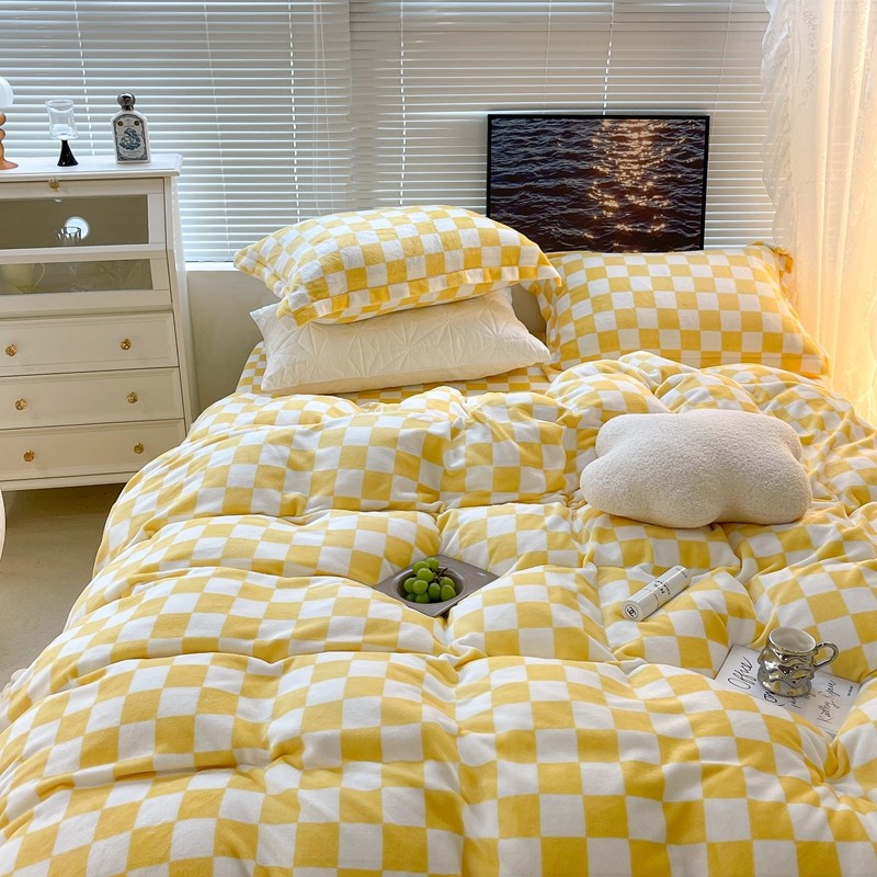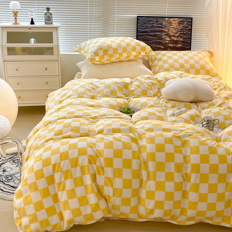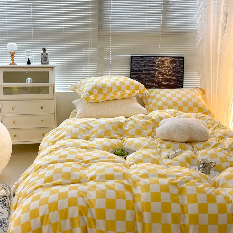 昔可家纺 2021新款牛奶绒棋盘格系列四件套 黄