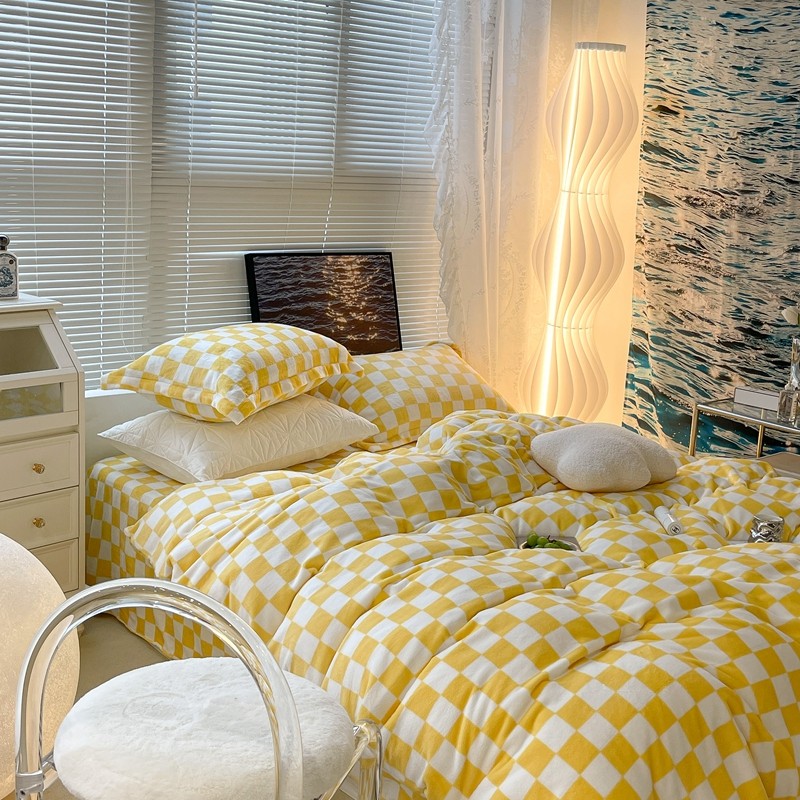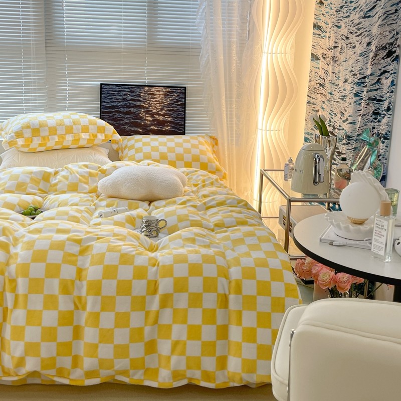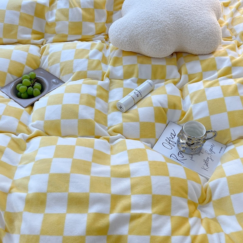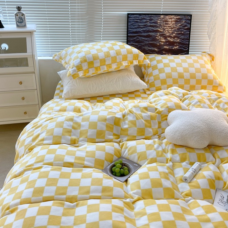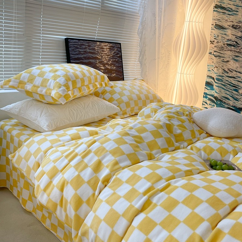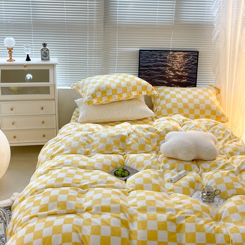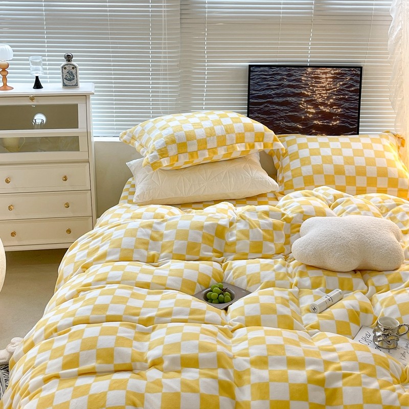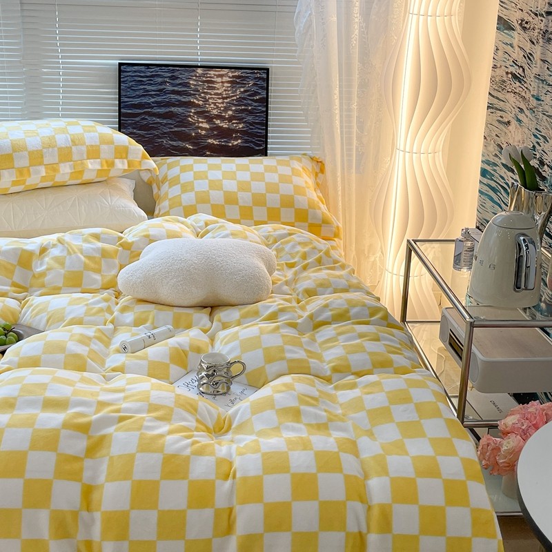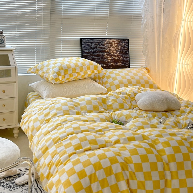 昔可家纺 2021新款牛奶绒棋盘格系列四件套 黄