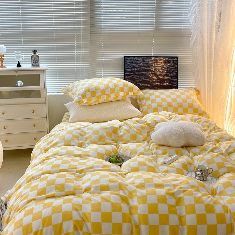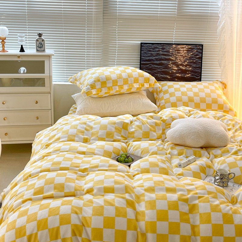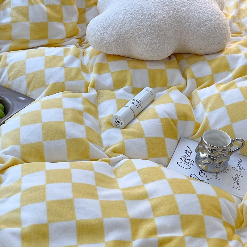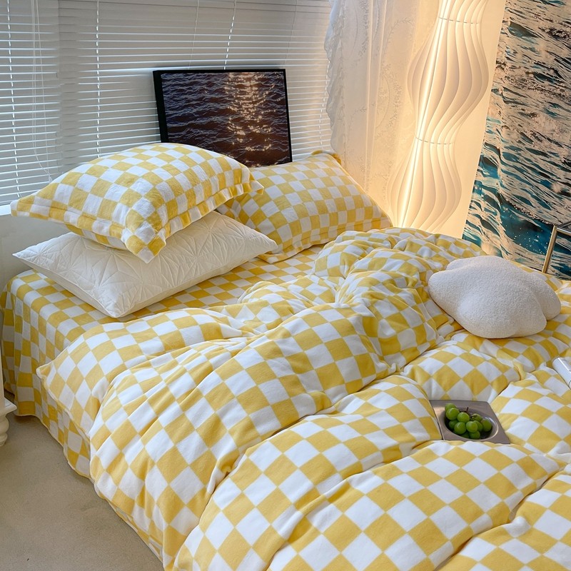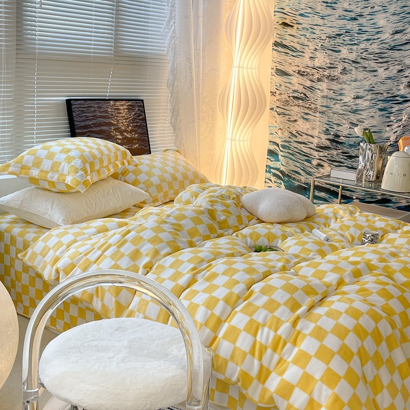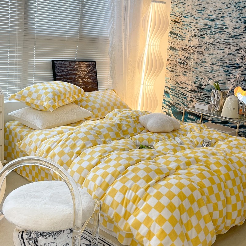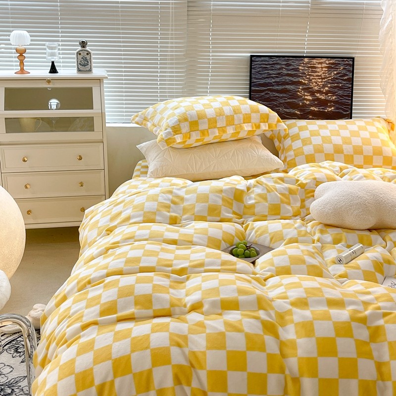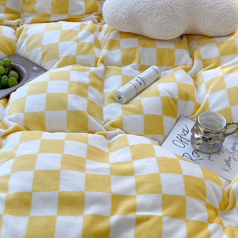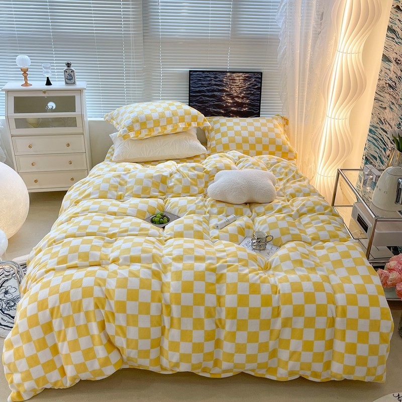 昔可家纺 2021新款牛奶绒棋盘格系列四件套 黄