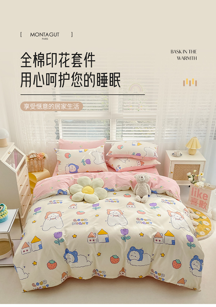(总)曼之夏 2025新款全棉纯棉印花四件套,豹纹猫咪,笨笨象,缤纷乐园,草莓蛋糕,丛间密语,点点小腊肠,冬日可可狗,告白熊,格子小狗,快乐熊猫,萌萌哒,蜜糖,苹果熊仔,奇思妙想,圣诞星语,兔兔甜心,线团小猫,小熊序曲,心动狗狗,心心狗,星星凯蒂猫,幸运猪猪