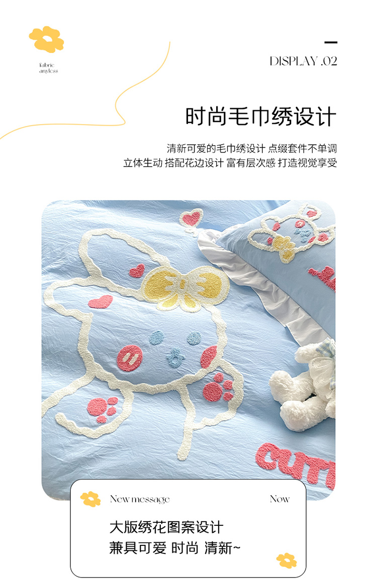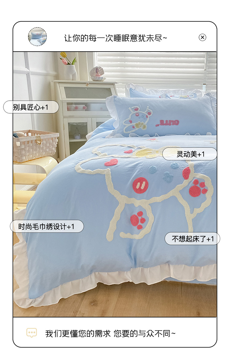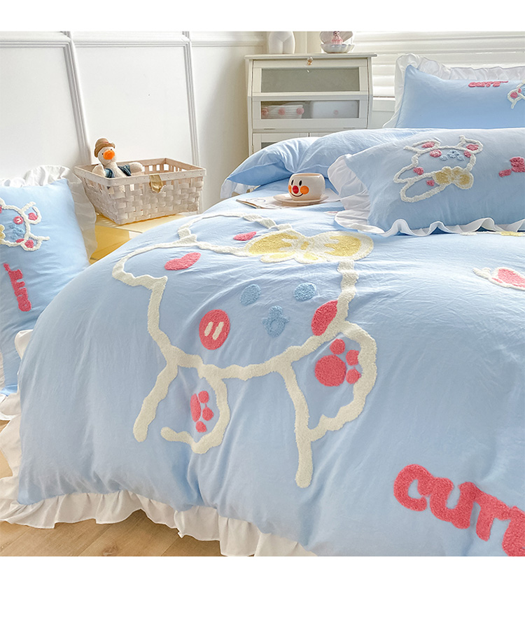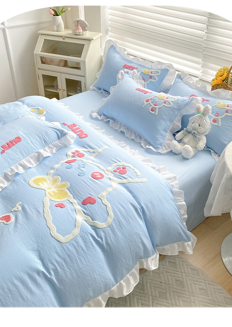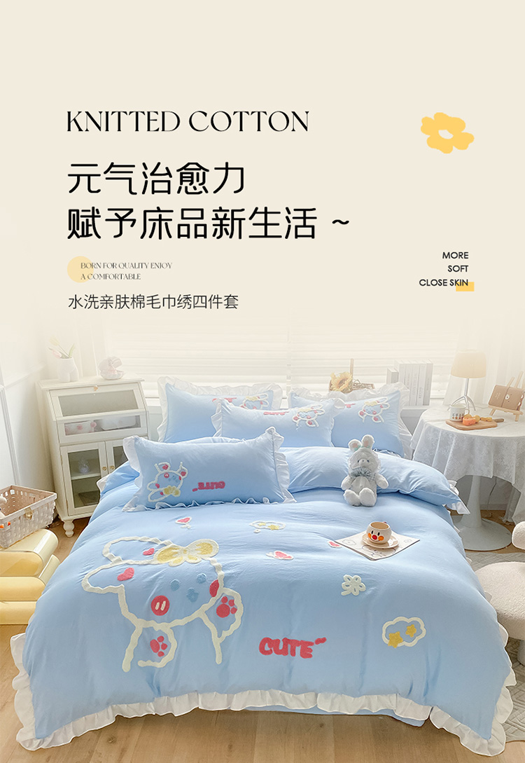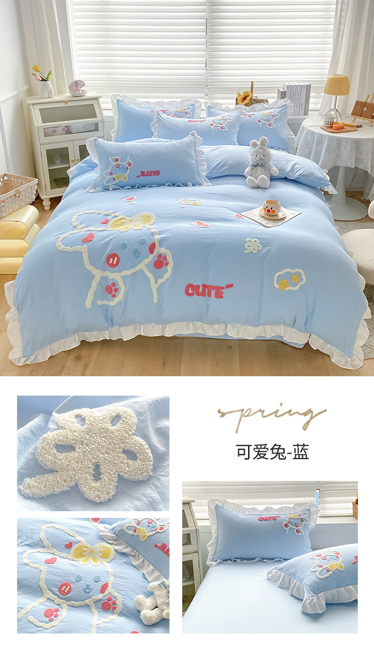 当前位置: 91家纺网 > 商品网购 > 床品套件 > 四件套 > 水洗棉四件套 > 泉欣 2024新款网红水洗棉毛巾绣韩版四件套可爱兔可爱兔-蓝