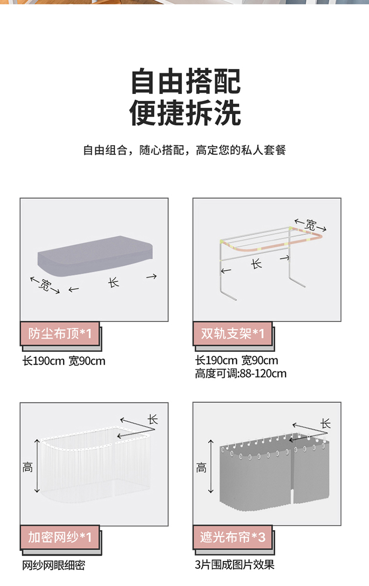 0.9米床(高度可调节.上下铺通用)【宽90长190高88-140cm】