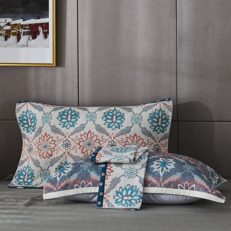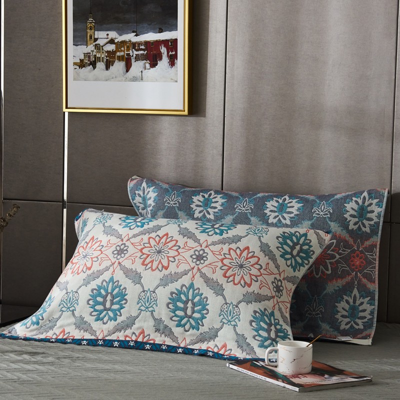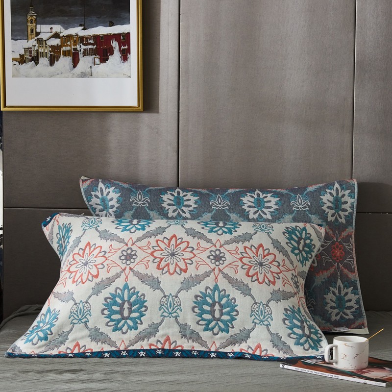 • 91家纺网 家纺一手货源 找家纺 朴尔  2022年新款波西米亚风全棉四层纱布枕巾一对装 连理枝蓝