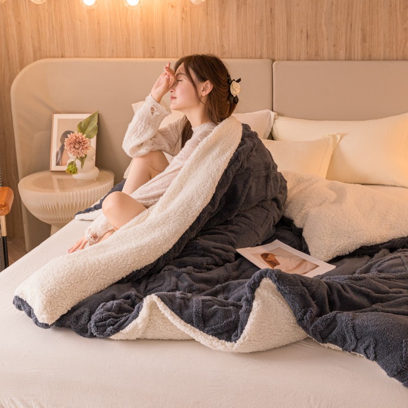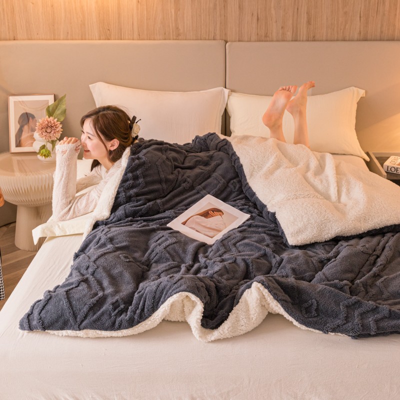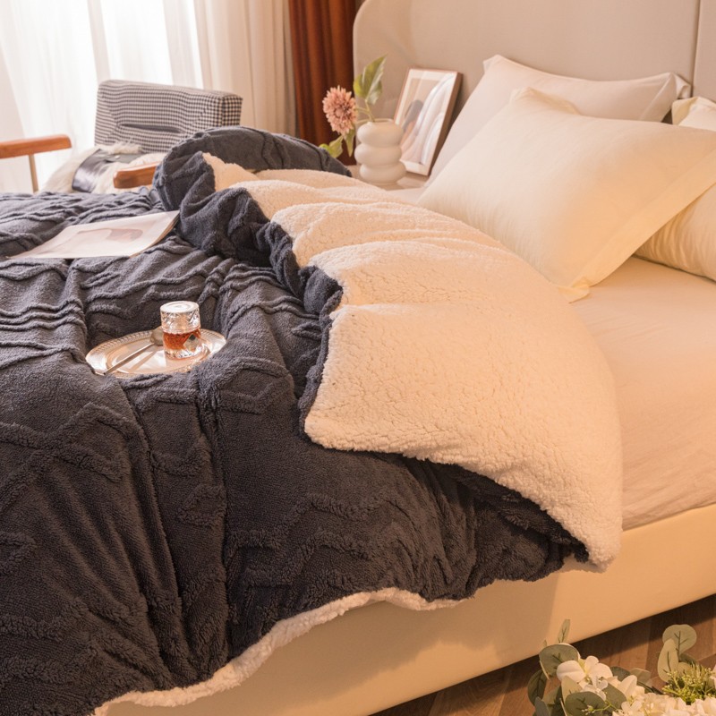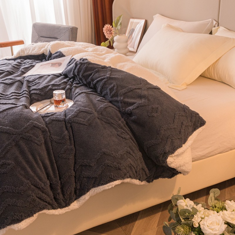 简爱-2025舒棉绒羊羔绒单被套多功能毯 纹路菱形格-深灰