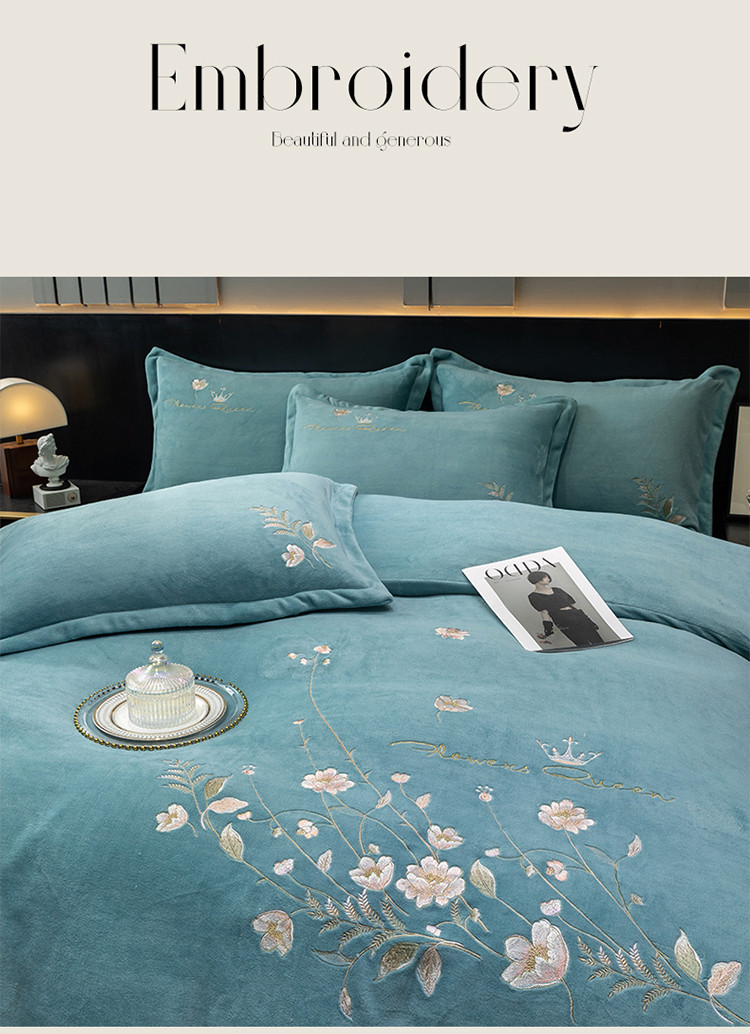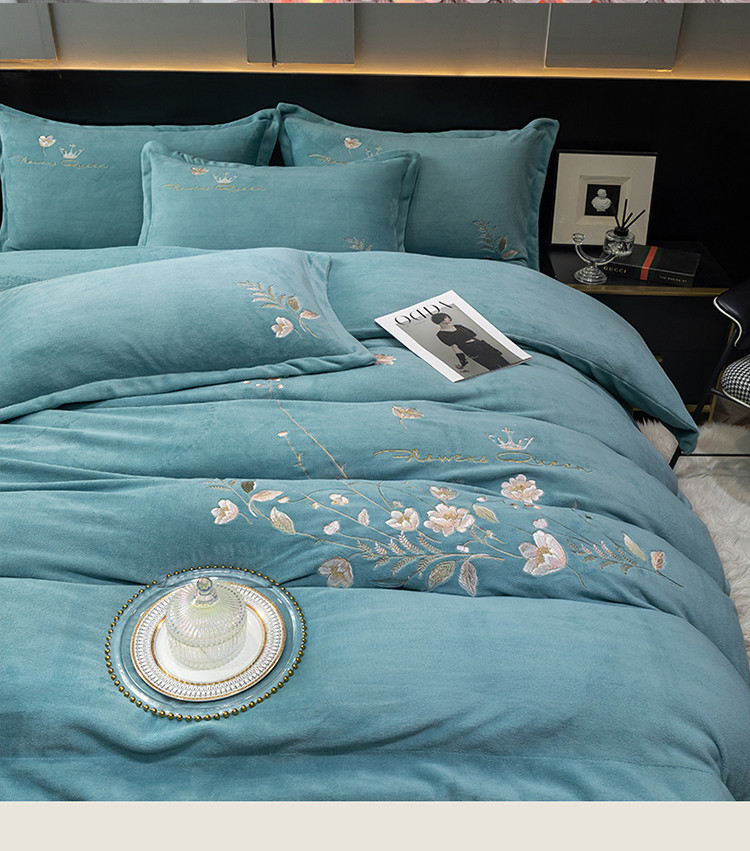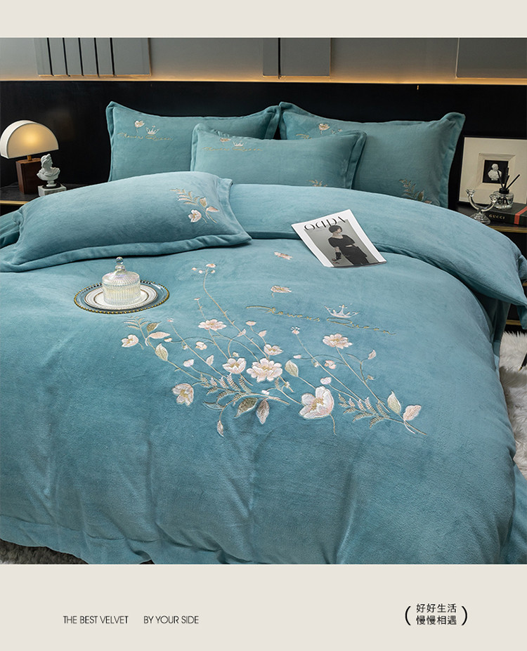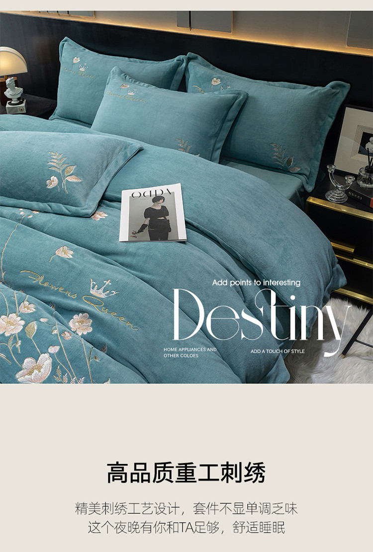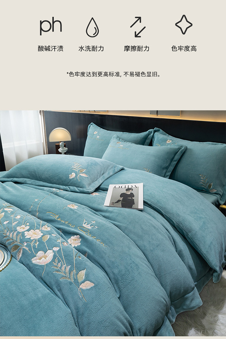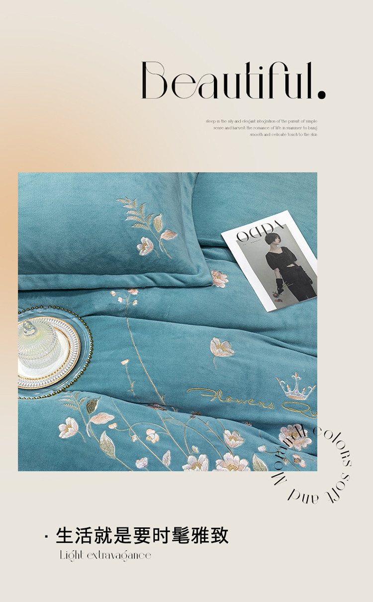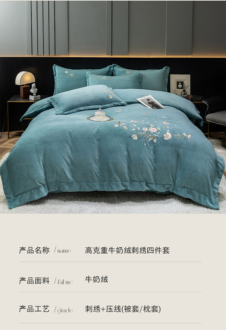 商品名称:塔塔 2025新款高克重牛奶绒刺绣四件套 绽放-蓝