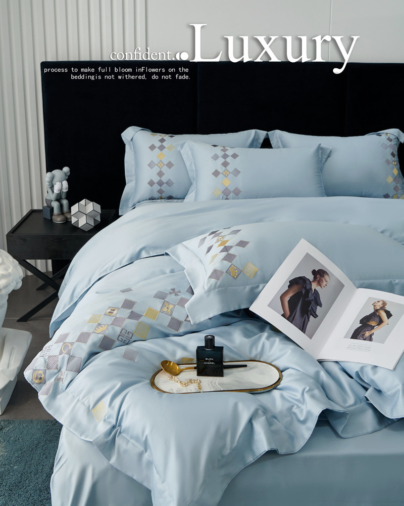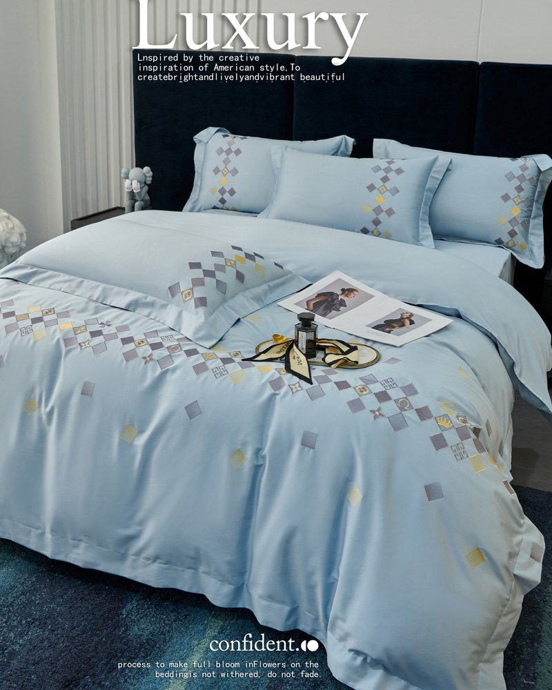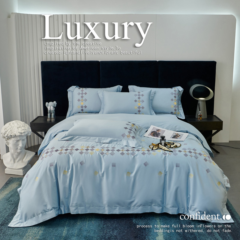 宅家居 180支阿克苏长绒棉刺绣全棉四件套-芙尼系列 纯净蓝
