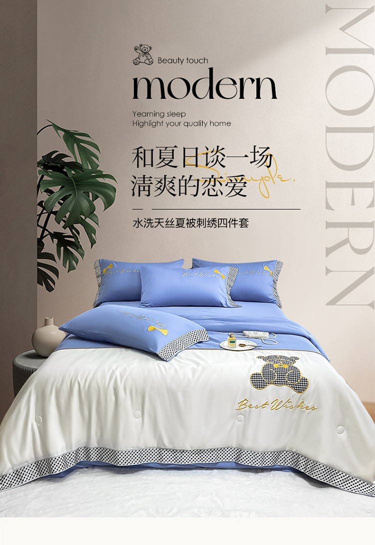 吾诺 2023新款小熊刺绣水洗天丝夏被四件套 小熊蓝